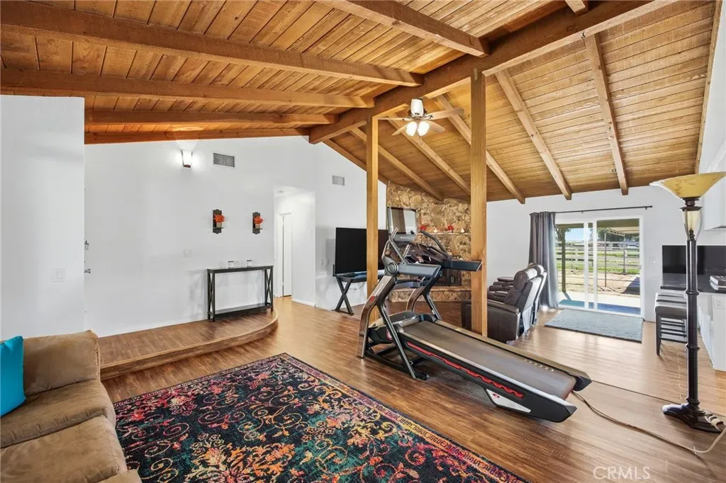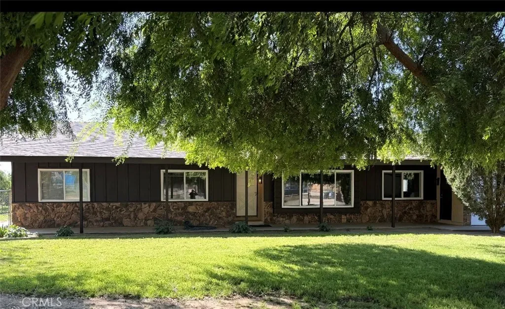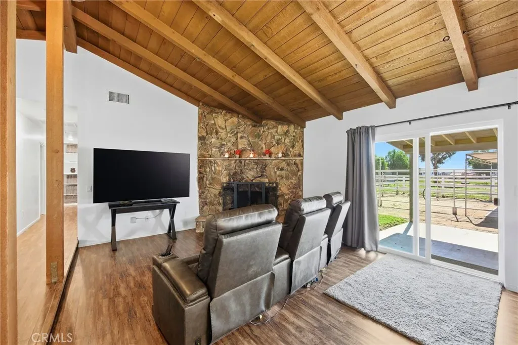 BACK ON THE MARKET. BUYERS UNABLE TO PERFORM….Looking for that horse property? …….This single level well maintained ranch style home has so much to offer for the horse lover. Beautiful high vaulted wooden ceilings, step down open family room with stone wood burning fireplace and family dining area is open to kitchen and living area. Newly remodeled kitchen with upgraded stainless appliances, gas oven, range hood, dishwasher, newly installed garbage disposal, sink, upgraded faucet, beautiful quartz counters, gas countertop with breakfast bar to enjoy conversations with family and friends all open to the living area. Newly installed custom dark laminate vinyl plank flooring throughout. 2 nicely sized guest bedrooms, one has custom-built bookshelves, plus spacious main bedroom with slider for easy access to the rear yard. Completely upgraded guest bath with new shower/tub, upgraded vanity, flooring, toilet, lighting and upgraded faucets. Main bathroom has walk in shower, upgraded vanity, flooring, and lighting features. Newly installed double pane upgraded windows and sliders. Upgraded plumbing throughout house and newly installed pressure regulator. Newly installed roof top AC/heating unit, newly installed hot water heater, upgraded lighting features throughout with style switches and ceiling fans. Septic tank pumped and certified with newly installed risers, newly installed exterior lighting features. Section 1 termite has been completed. All new exterior and interior paint. Rear yard has 2 – 24×24 – pipe corrals with partial shelter. Large turnout arena with mature shade trees, completely fenced and wash rack. 3 car garage plus so much room to accommodate for that RV or horse trailer. The house sits back from the street with large shade trees for extra privacy and ready to move in!
