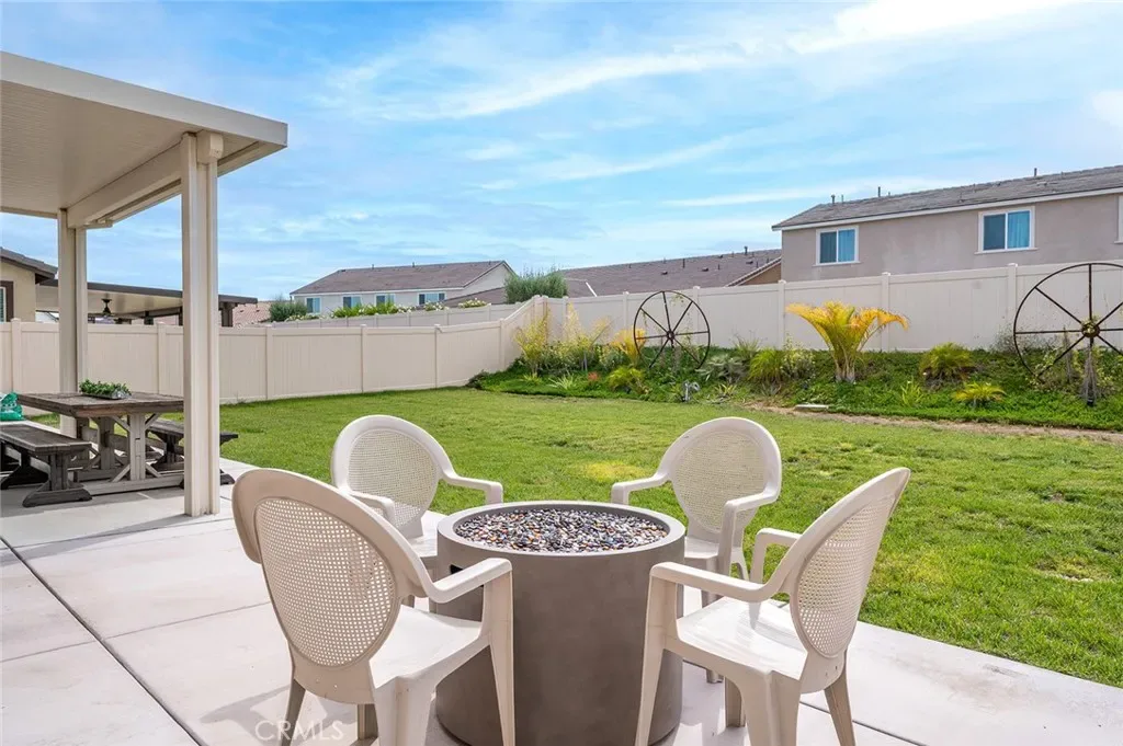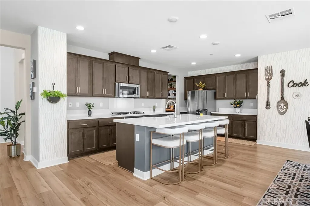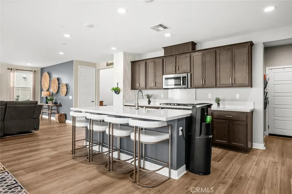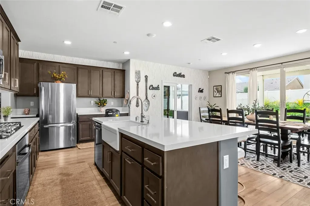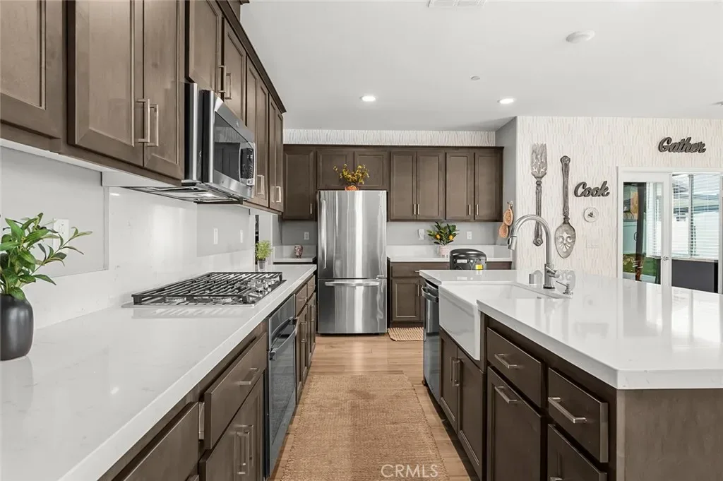 The open-concept floor plan features upgraded lighting, quartz countertops in the kitchen and all bathrooms, and luxury vinyl tile flooring in the main living areas and bathrooms. The gourmet kitchen includes a farmhouse-style sink, touch-activated faucet, upgraded stove and oven, a widened refrigerator space, and a frosted pantry door. The 12-foot sliding glass door opens to an extended covered patio, ideal for seamless indoor-outdoor living.