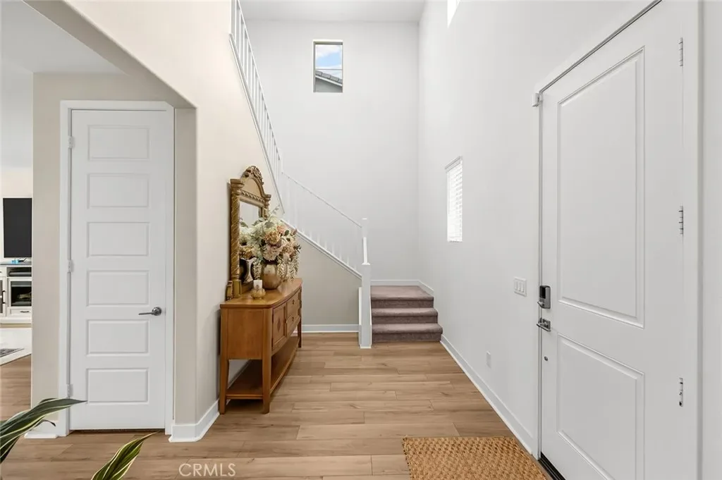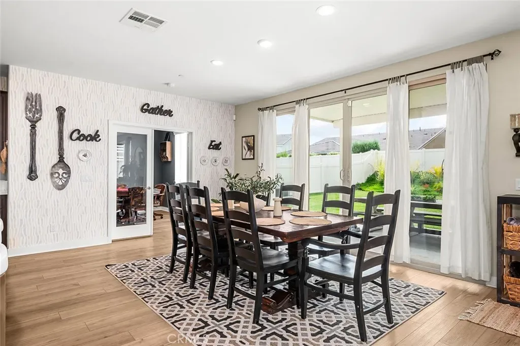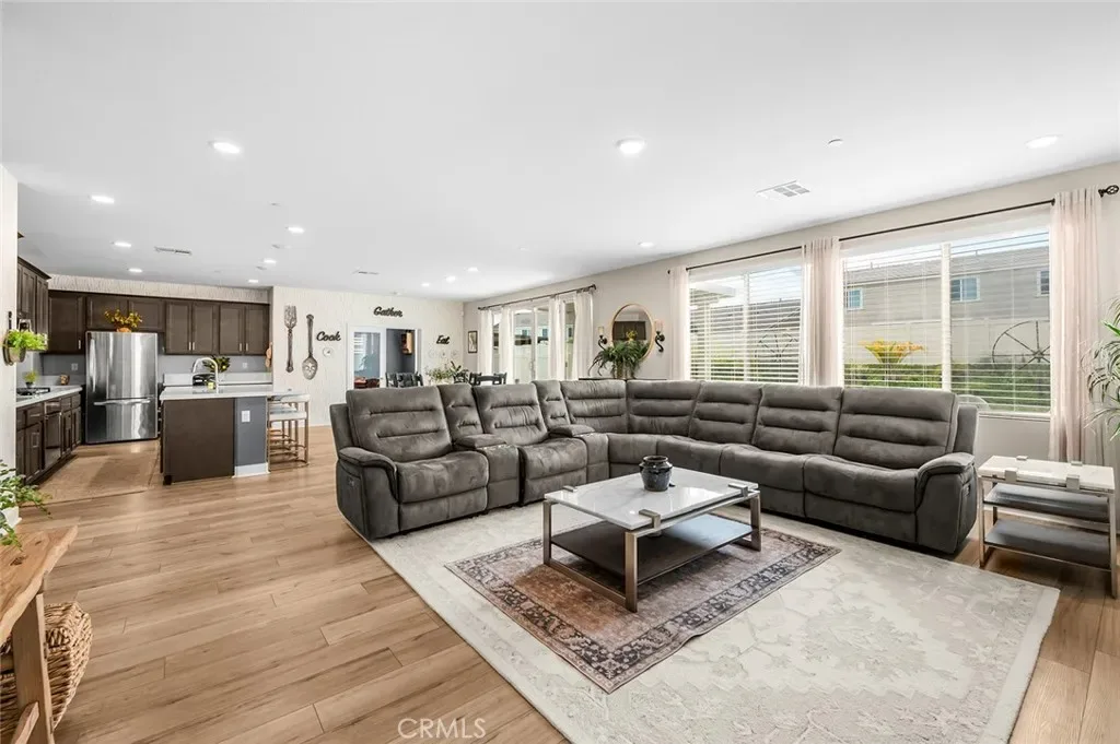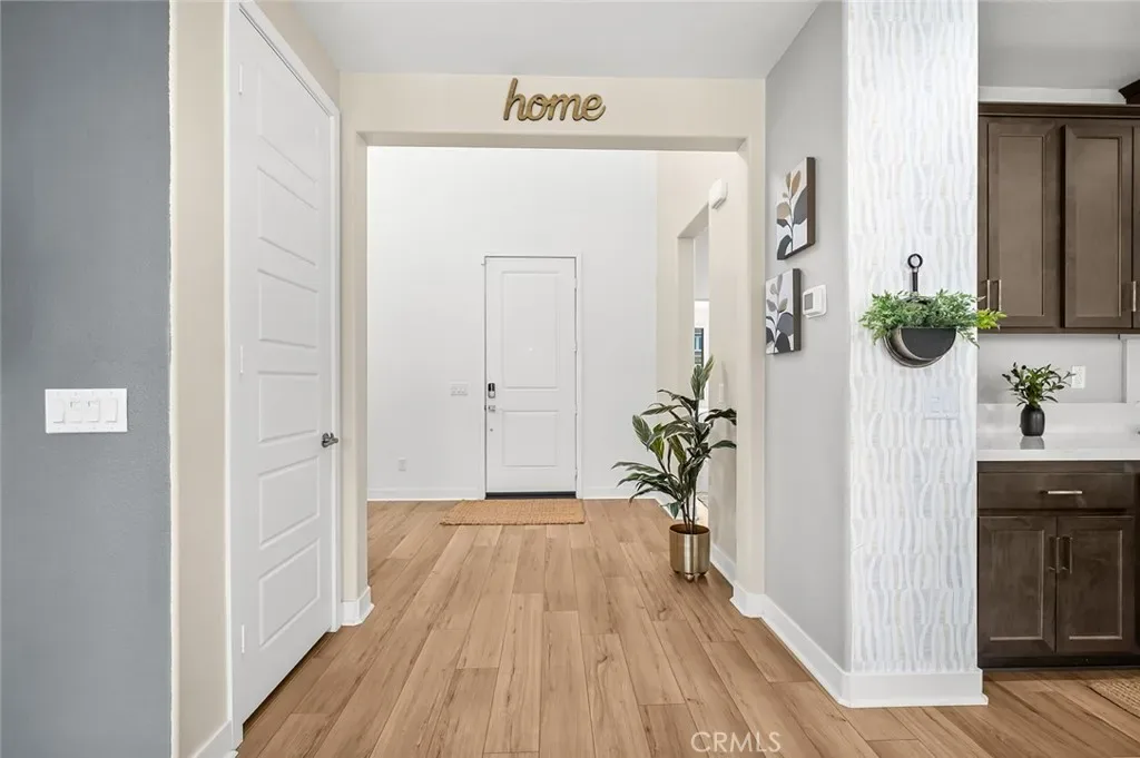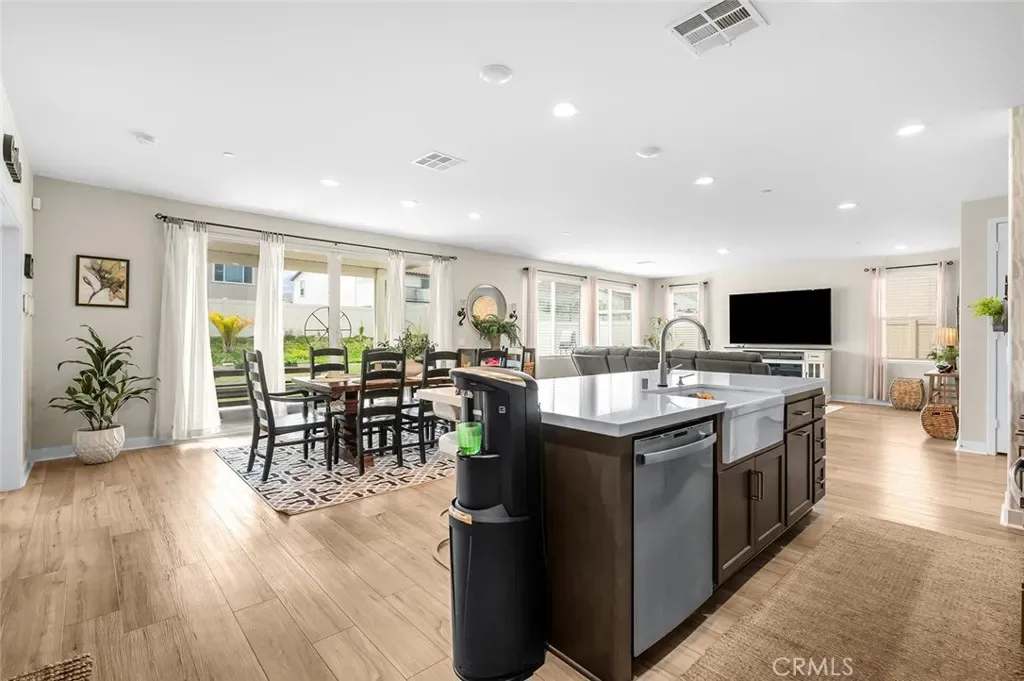 The open-concept floor plan features upgraded lighting, quartz countertops in the kitchen and all bathrooms, and luxury vinyl tile flooring in the main living areas and bathrooms. The gourmet kitchen includes a farmhouse-style sink, touch-activated faucet, upgraded stove and oven, a widened refrigerator space, and a frosted pantry door. The 12-foot sliding glass door opens to an extended covered patio, ideal for seamless indoor-outdoor living.