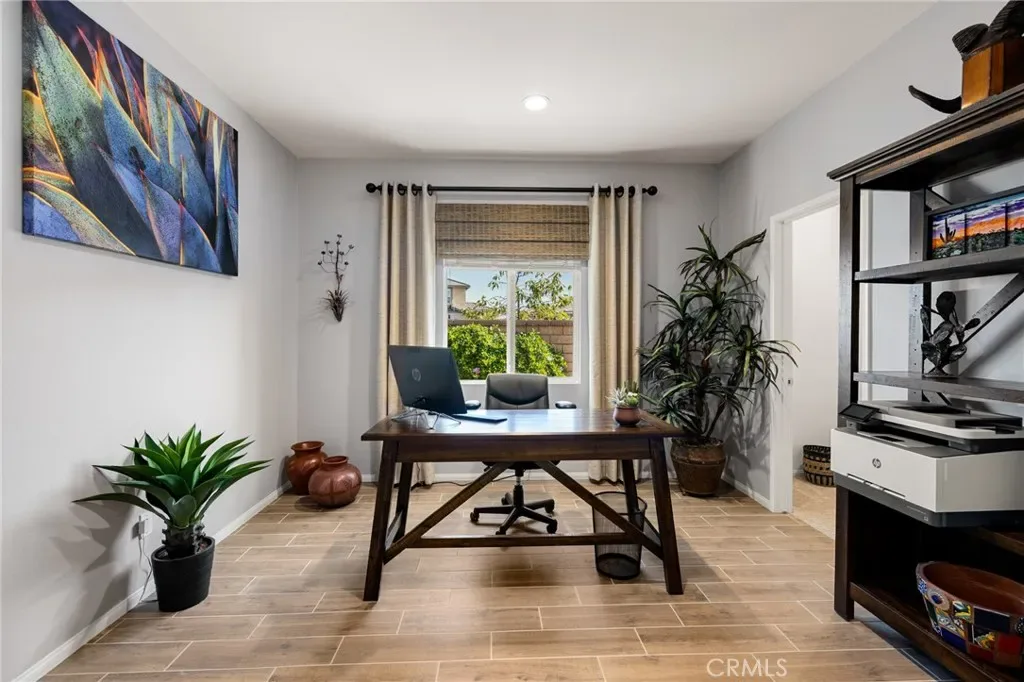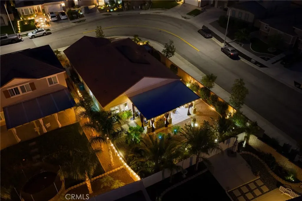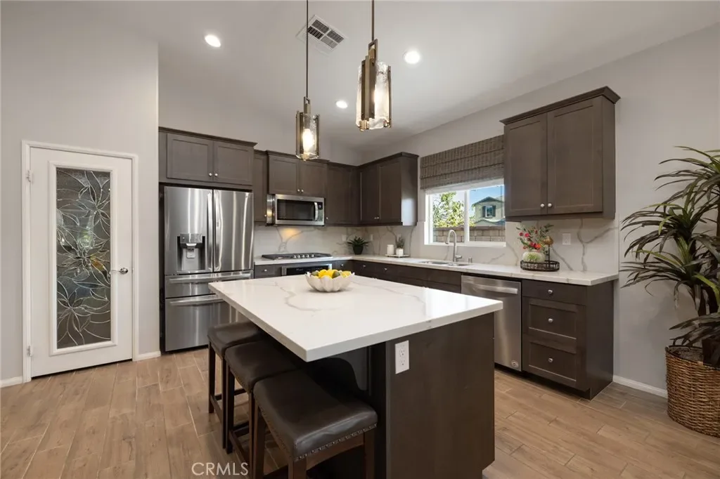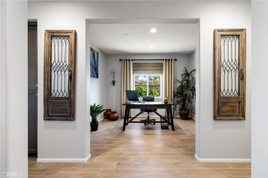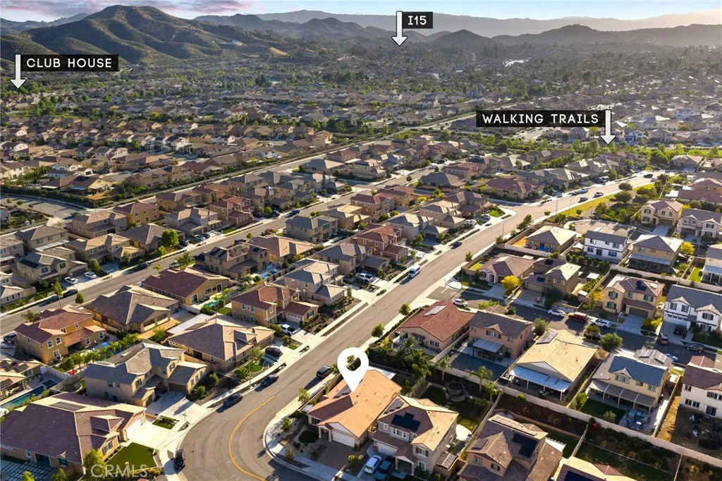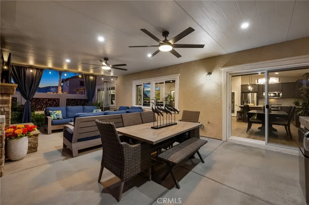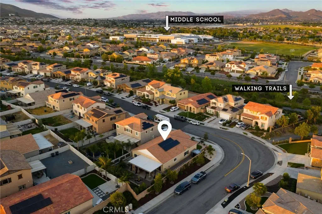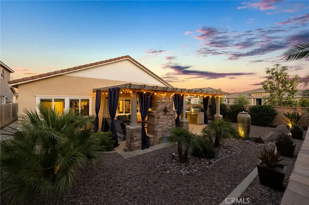 Outdoor living takes center stage with nearly 500 sqft of covered patio space, highlighted by a custom built-in fireplace, seamlessly extending this 1,900 sqft home into an indoor-outdoor experience that lives closer to 2,400 sqft on a nearly 7,000 sqft corner lot. This exquisite home offers 4 bedrooms, 3 baths, and over $125,000 in designer upgrades. Located in the highly desirable community of Audie Murphy Ranch in Menifee, the front curb appeal welcomes you with a custom paver driveway and steps surrounded by artificial turf and uplighting leading the way to the custom glass front door. Inside you are greeted by Gaineswood tile floors, tall ceilings, recessed lighting, custom paint, and high-end bamboo window treatments throughout. Off the entrance you’ll find the first secondary bedroom with upgraded carpet and large enough for a king size bed. The second room is currently being used as an office, with a walk-in closet and is the perfect space for French doors. They share a secondary bath with a shower tub combo. The third bedroom offers upgraded carpet, and full bath with a walk-in shower across from the laundry room with access to the two-car garage boasting above storage. The Great Room offers pitch ceilings giving the home a grand feeling, large view windows allowing tons of natural light with views to the entertainer’s yard. The gourmet kitchen is appointed with Calcutta de Oro quartz counters and full backsplash, eat up island, shaker cabinets, stainless steel appliances, pendant lighting and a glass front pantry door. The dining room boasts a custom chandelier. The primary suite offers an attached bath with soaking tub, walk-in shower, and walk-in closet. The entertainer’s dream yard is where you’ll spend all of your time as it offers a built-in BBQ, 4-month-old fridge and freezer, an insulated Aluma wood patio cover with ceiling fans, recessed lighting, and stone pillars over a custom fireplace with entertainment opportunities throughout. The yard is large enough for a pool, but currently offers mature landscaping, a Calcutta water feature with an underground water well for optimization, and large side yard with a shed. Owned solar makes the home energy efficient offering 13 panels and 4.16 kW. The community features, pools, spa, sports courts, hiking and biking trails, a clubhouse, skate park, the award-winning Taawila ES and the brand-new Kathryn Newport MS. The home is located across from a walking trail and is between the 15 and 215 fwys.