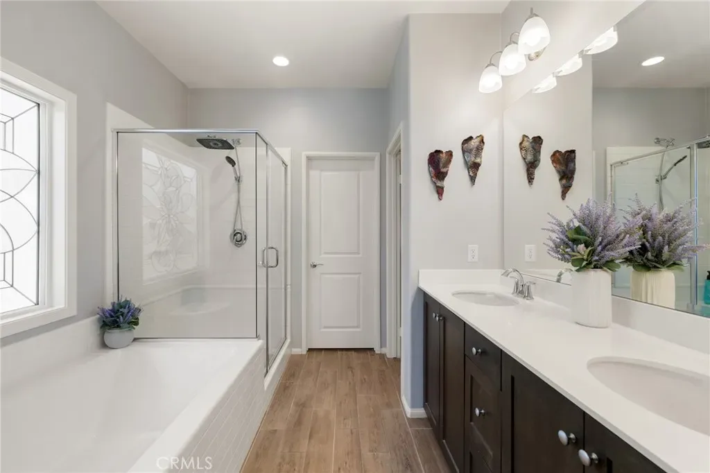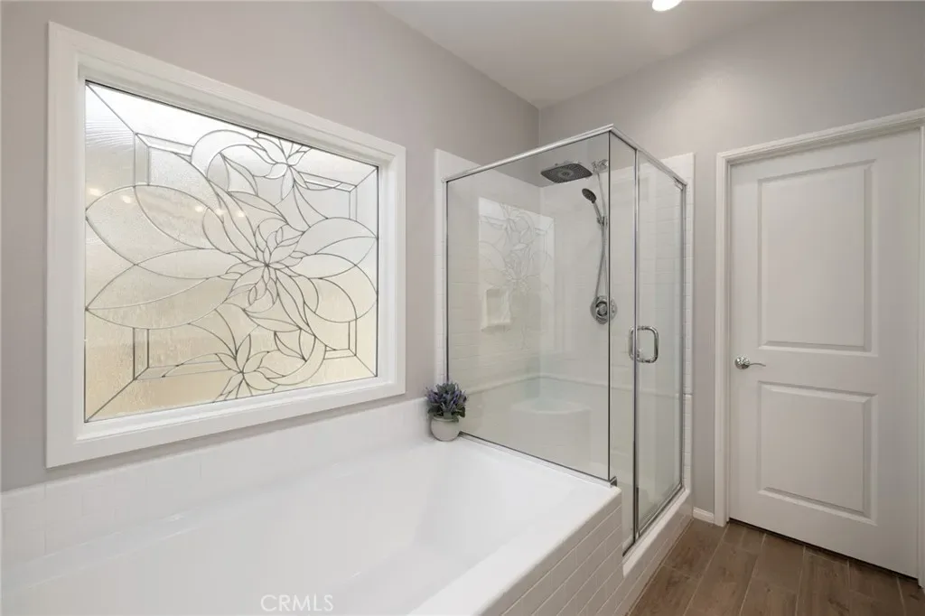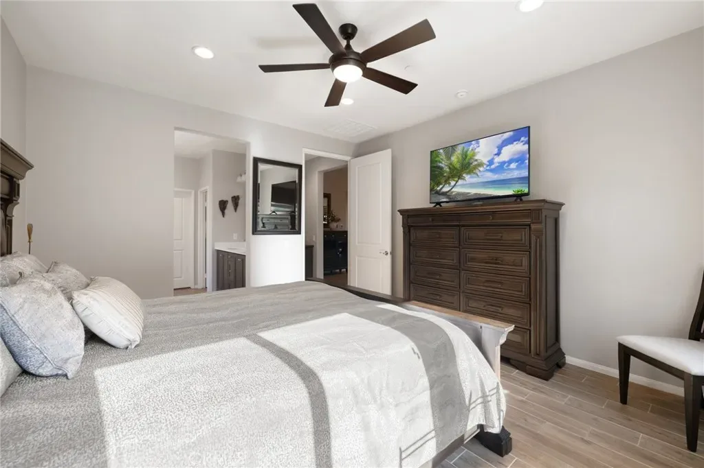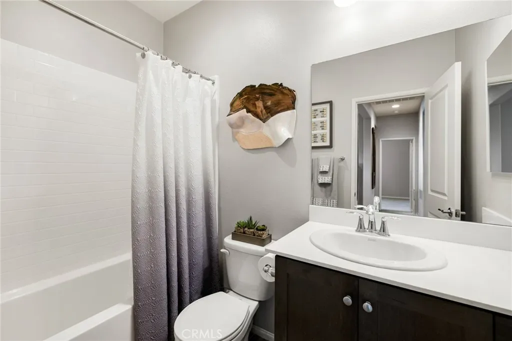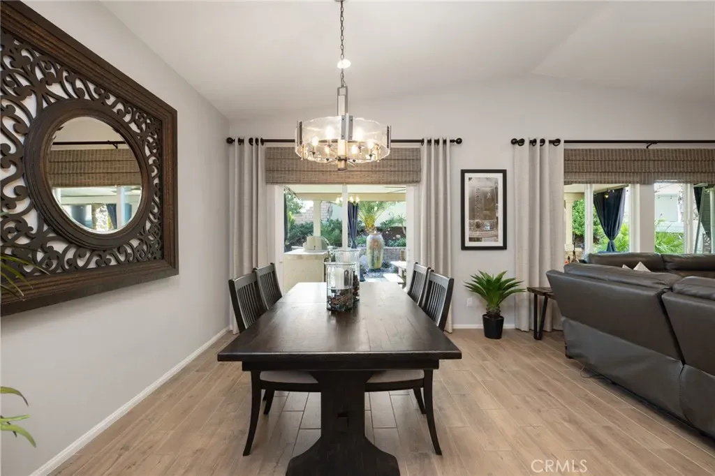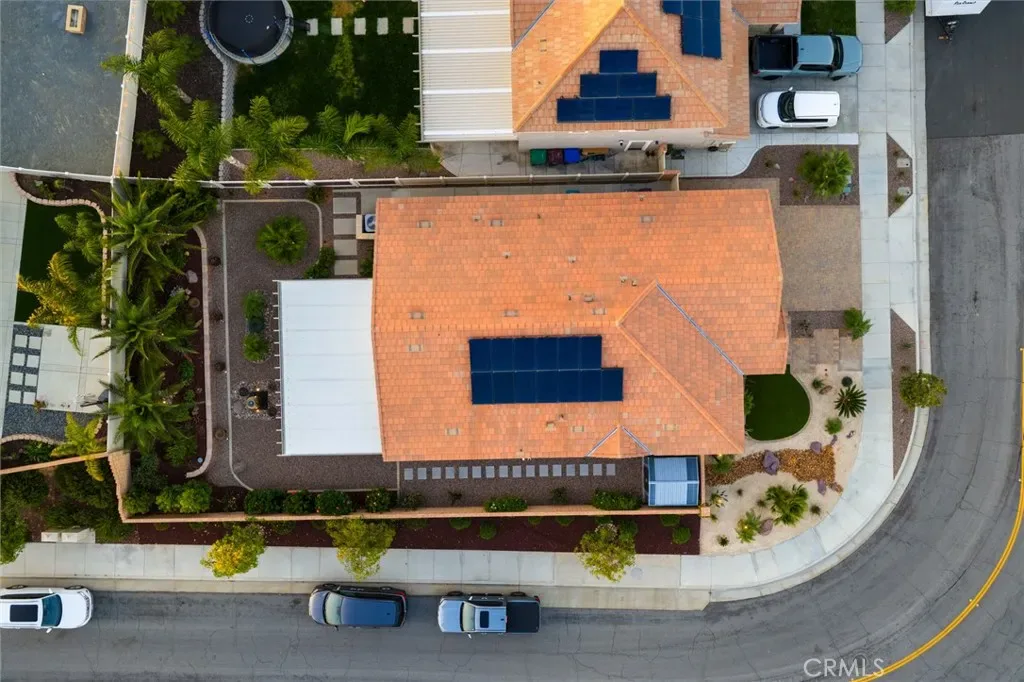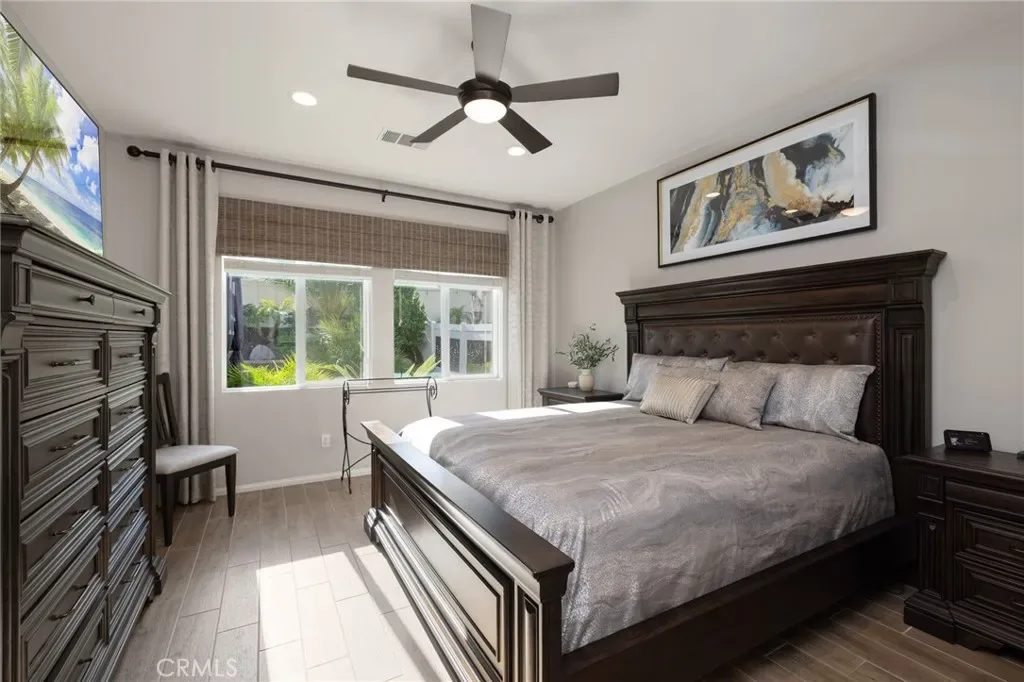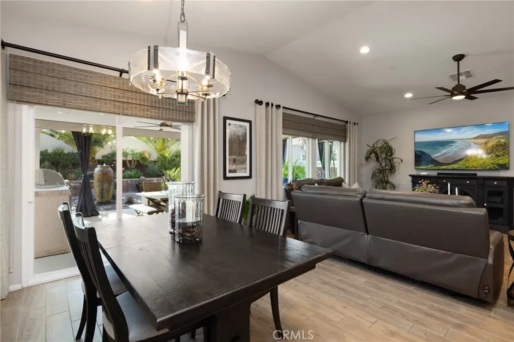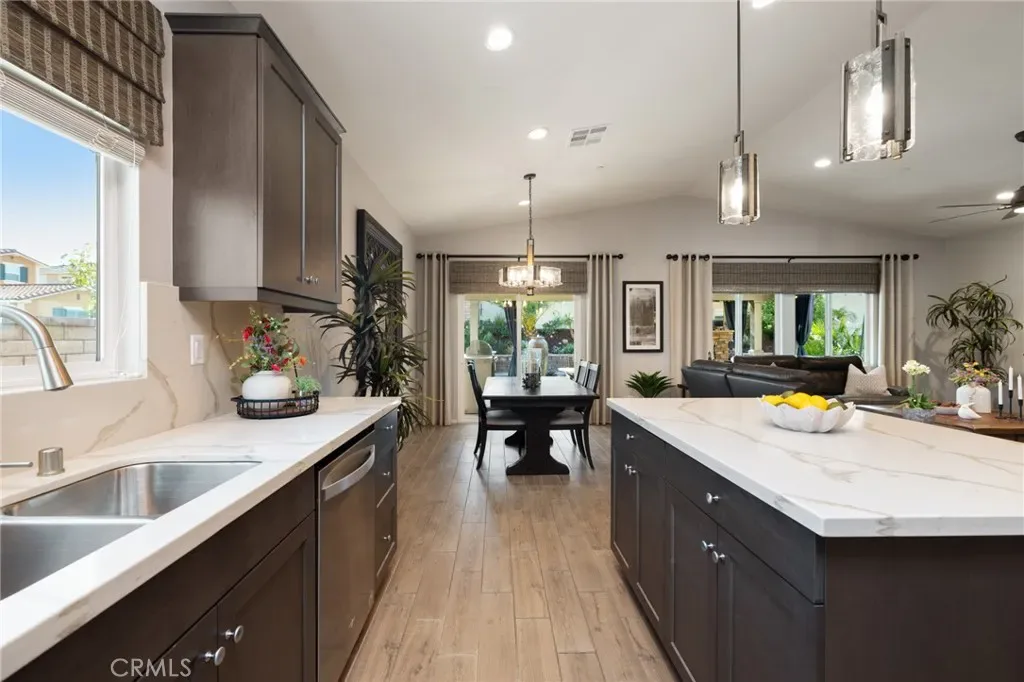 Outdoor living takes center stage with nearly 500 sqft of covered patio space, highlighted by a custom built-in fireplace, seamlessly extending this 1,900 sqft home into an indoor-outdoor experience that lives closer to 2,400 sqft on a nearly 7,000 sqft corner lot. This exquisite home offers 4 bedrooms, 3 baths, and over $125,000 in designer upgrades. Located in the highly desirable community of Audie Murphy Ranch in Menifee, the front curb appeal welcomes you with a custom paver driveway and steps surrounded by artificial turf and uplighting leading the way to the custom glass front door. Inside you are greeted by Gaineswood tile floors, tall ceilings, recessed lighting, custom paint, and high-end bamboo window treatments throughout. Off the entrance you’ll find the first secondary bedroom with upgraded carpet and large enough for a king size bed. The second room is currently being used as an office, with a walk-in closet and is the perfect space for French doors. They share a secondary bath with a shower tub combo. The third bedroom offers upgraded carpet, and full bath with a walk-in shower across from the laundry room with access to the two-car garage boasting above storage. The Great Room offers pitch ceilings giving the home a grand feeling, large view windows allowing tons of natural light with views to the entertainer’s yard. The gourmet kitchen is appointed with Calcutta de Oro quartz counters and full backsplash, eat up island, shaker cabinets, stainless steel appliances, pendant lighting and a glass front pantry door. The dining room boasts a custom chandelier. The primary suite offers an attached bath with soaking tub, walk-in shower, and walk-in closet. The entertainer’s dream yard is where you’ll spend all of your time as it offers a built-in BBQ, 4-month-old fridge and freezer, an insulated Aluma wood patio cover with ceiling fans, recessed lighting, and stone pillars over a custom fireplace with entertainment opportunities throughout. The yard is large enough for a pool, but currently offers mature landscaping, a Calcutta water feature with an underground water well for optimization, and large side yard with a shed. Owned solar makes the home energy efficient offering 13 panels and 4.16 kW. The community features, pools, spa, sports courts, hiking and biking trails, a clubhouse, skate park, the award-winning Taawila ES and the brand-new Kathryn Newport MS. The home is located across from a walking trail and is between the 15 and 215 fwys.