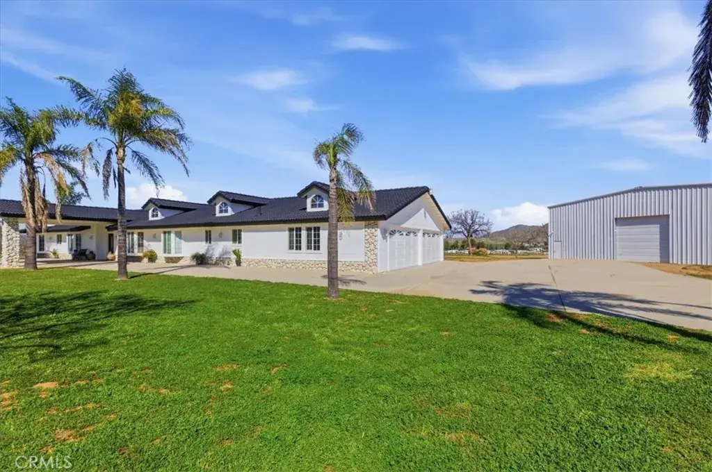 HUGE WAREHOUSE 7,200 SQFT ON 10 ACRES of land with a GORGEOUS CUSTOM BUILT HOME that has amazing views. RARE opportunity to own this property that has so much to offer. LIVE AND WORK OR PERFECT FOR HOBBYIST. It is gorgeous with an expansive open floor plan and perfect for a large family. Beautiful BRAND NEW TILE ROOF, BRAND NEW TILE WOOD-LIKE FLOORS and BRAND NEW INTERIOR AND EXTERIOR PAINT. 4 spacious bedrooms and 3.5 bathrooms allows for plenty of space and separation. The ENORMOUS kitchen features brand new stainless steel appliances such as double ovens, perfect for holiday cooking, a cooktop with a downdraft and new dishwasher. The kitchen overlooks the large family room where your whole family can enjoy and you can entertain for large gatherings. Living room features a rock fireplace with a heaterlator Quadra-fire-insert blower that will warm the whole house up and surround sound. One bedroom and full bathroom is on opposite side of the home, and the primary bedroom is oversized with a walk-in closet. The WORKSHOP IS MASSIVE with 7200 sqft (60×120 feet) and 2 14 foot high roll-up doors that you can drive SEMI TRUCK THRU! 2 additional 10 foot roll up doors as well. The workshop has reinforced extra thick stamped concrete perfect for parking a SEMI truck or heavy equipment. It was constructed to be a 2 story building (please see permits or city). This property is located in the County of Riverside and was rezoned recently for storage parking as well. Perfect way to make extra income. There are 5 entry ways to get on the property making a perfect space for separation if you run a business from the property. It is also horse property and would make a great ranch. The workshop is also built to make the workshop an indoor barn. Possible future development adds even more flexibility for this property. There are endless possibilities and usages for the new buyer. Septic system was just pumped and serviced and the propane was just filled.