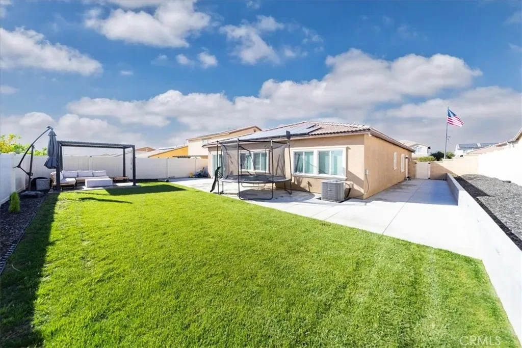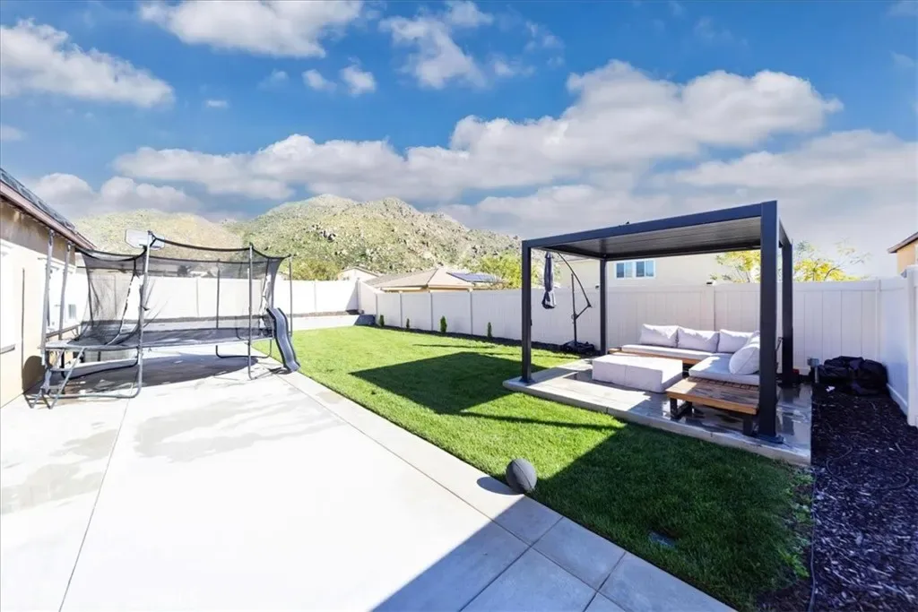 Step outside to a truly impressive outdoor living space designed for both relaxation and entertaining. The backyard has been professionally landscaped with a large lawn area, full sprinkler and drip irrigation systems, and a spacious concrete patio. A stunning 90-foot garden wall finished in grey slate features color-changing accent lighting. The yard also includes a custom slatted pergola with adjustable open-and-close shutter roof, a dedicated concrete entertaining pad.