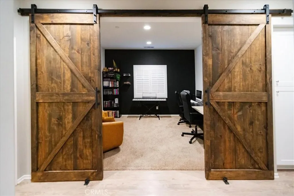 Several bedrooms have been thoughtfully enhanced including newly installed ceiling lights with adjustable white to warm lighting tones, upgraded closet space, custom blinds, and even a built-in children’s chalkboard feature. Another bedroom has been transformed into a stylish office or flex space with beautiful custom wood barn doors, a custom wood-and-steel built-in desk, upgraded closet, and plantation shutters.