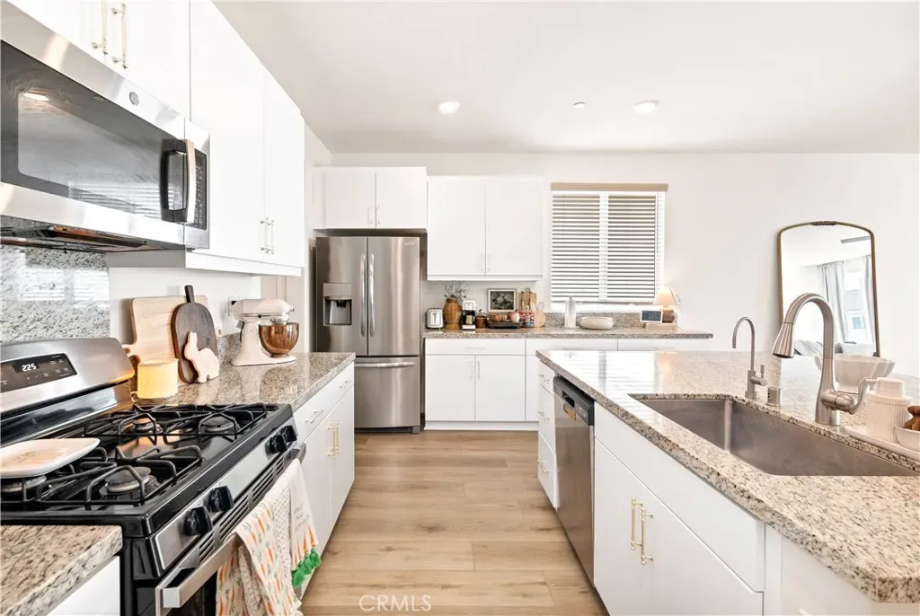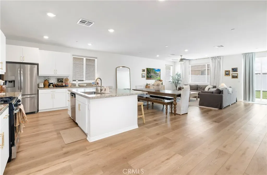 The open-concept layout is filled with natural light and creates a seamless flow between the kitchen, dining, and living areas, making it ideal for both daily living and entertaining. The kitchen features a large center island, granite countertops, a walk-in pantry, and ENERGY STAR GE appliances.