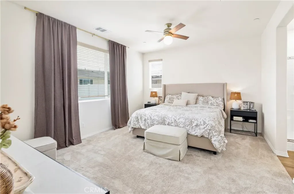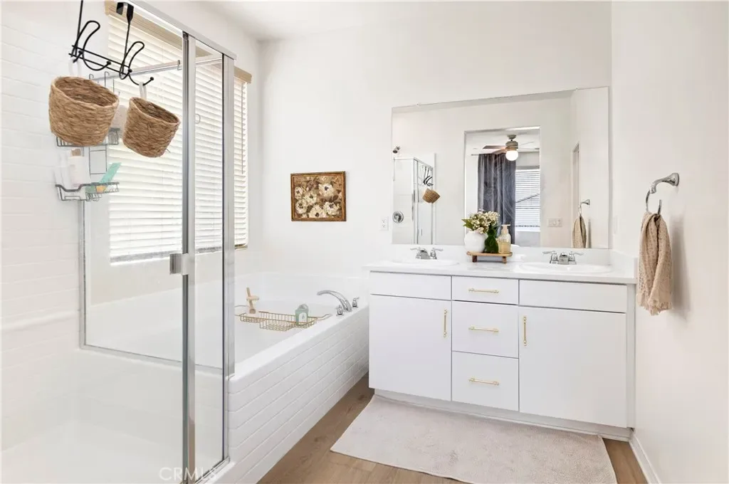 The spacious primary suite serves as a private retreat with a spa-like bathroom that includes a soaking tub, glass-enclosed shower, dual vanities, and a generous walk-in closet. Additional features throughout the home include luxury vinyl plank flooring, fresh interior paint, upgraded ceiling fans, window coverings, a whole-home security system, and a water softener system.