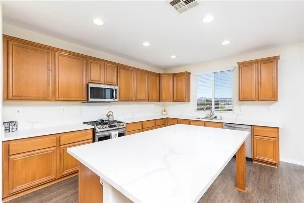 The upgraded kitchen features quartz countertops, a large center island, walk-in pantry, and ample storage, all flowing seamlessly into the oversized living room. A downstairs optional fifth bedroom with a full bath provides flexibility for guests or a home office.