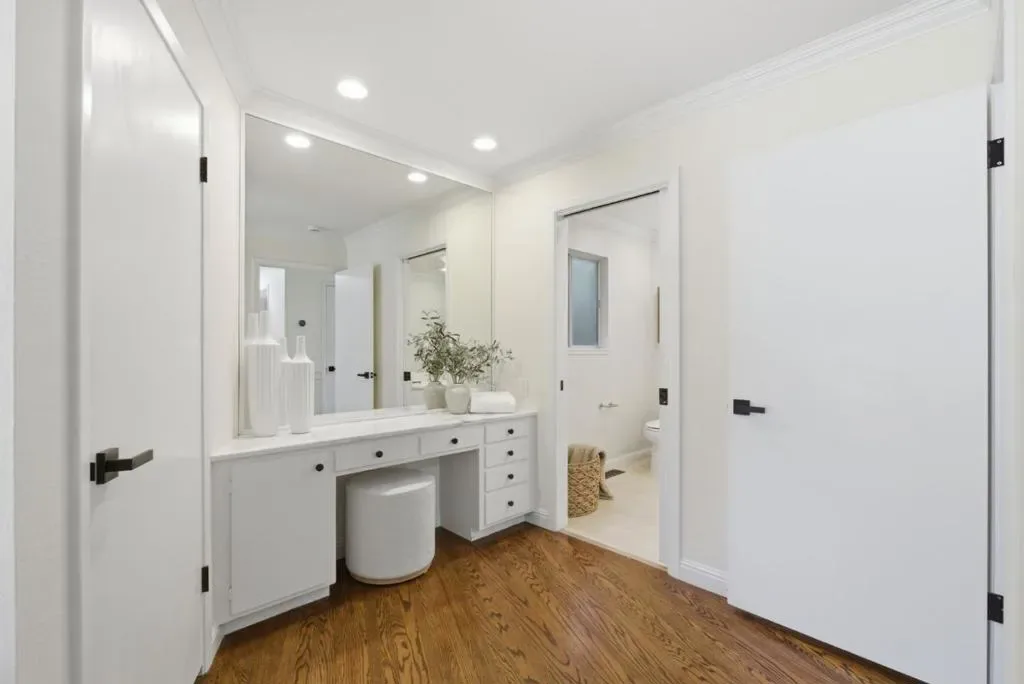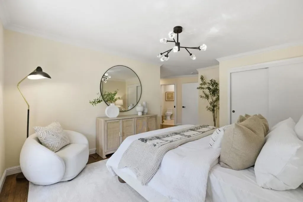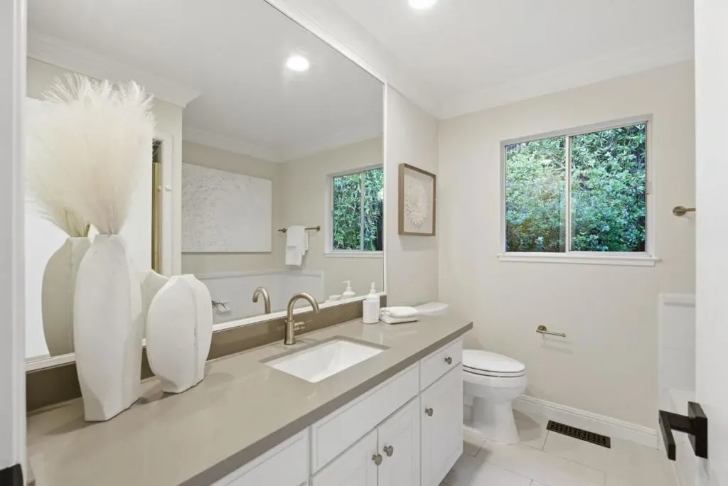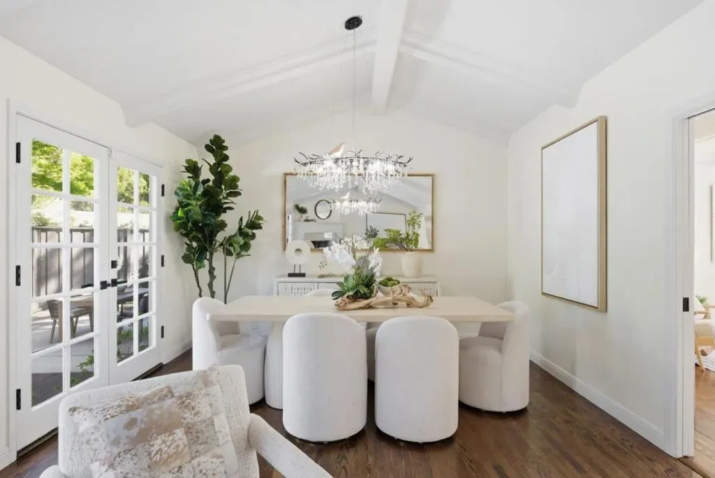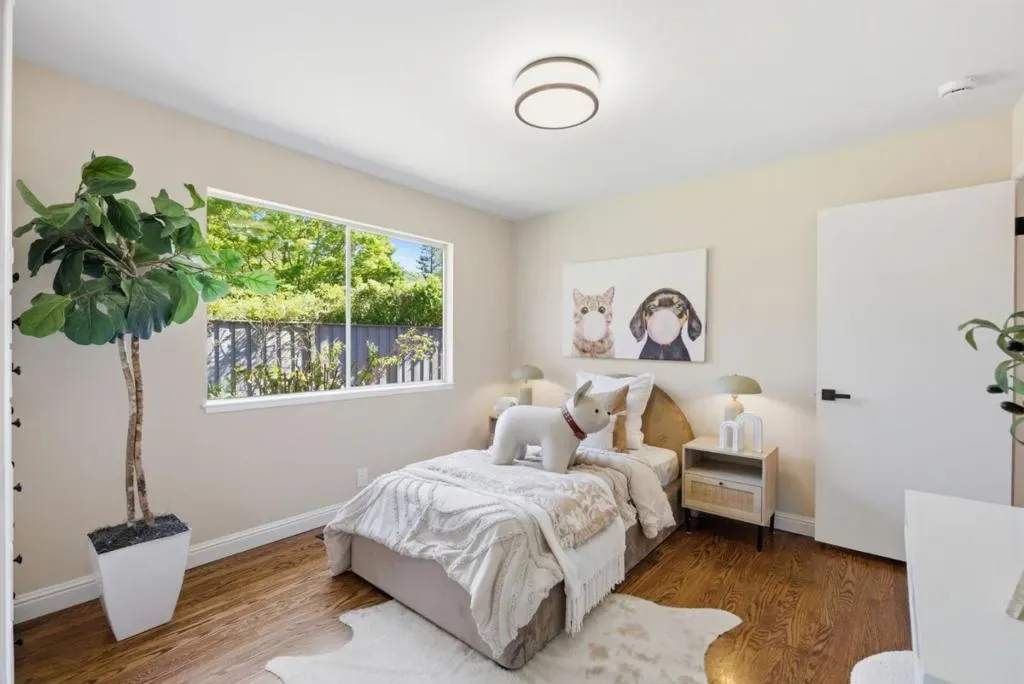 This exquisite ranch home is located on a quiet cul-de-sac in sought-after Sharon Heights, very close to Stanford, and provides the perfect blend of timeless elegance and peaceful living. Exquisite craftsmanship and quality finishes with random plank oak hardwood floors and crown molding throughout. At the heart of the home is the stunning great room featuring a woodburning fireplace with an ornate travertine and wood mantel, and a contemporary organic chandelier in the dining area. The exposed beams on the vaulted ceiling and the French doors to the back yard further the sophisticated design, which continues into the adjacent Chefs kitchen with coffered ceilings, stylish marbleized counter tops and white cabinets, a Thermador 5- burner cooktop, double ovens & stainless steel appliances. Separate bedroom wing including 3 generous guest bedrooms sharing the hallway bath with separate tub and shower, and a romantic primary retreat with French doors to the covered front porch, built-in vanity, marble counter tops, and multiple closets. Inside laundry. Attached 2-car garage. Very private, with expansive back deck and drought-resistant landscaping. Bike to schools, Stanford, and Sand Hill Road. Easy access to shopping & leading tech campuses. Award-winning Las Lomitas schools.