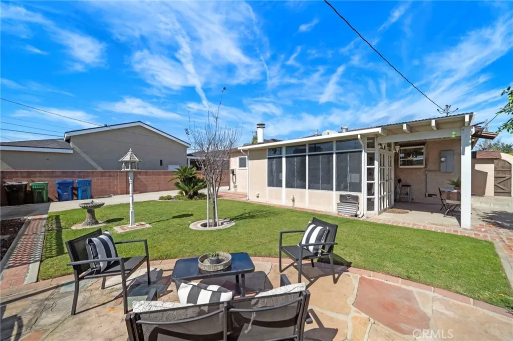 Wow! What a find! This absolutely charming, upgraded, and expanded single story home is located in the best Midway City neighborhood, one block from Huntington Beach, in an award-winning school zone, and has both a front driveway to a two-car garage AND a gated back driveway with alley access that can park 6 more cars or RV and includes a Tesla charging station. This sweet dream home offers 3 bedrooms, 2 bathrooms, and a total of 1,297 SQFT of the house – that includes: 1,059 SQFT, original home size, PLUS a beautiful 238 square foot sunroom with fireplace, ceiling fan, and French Doors opening to a pristine wrap-around tranquil backyard that includes a covered patio, a 2nd flagstone patio with outdoor fireplace, lush lawn, brick-accented hardscape, manicure landscaping, blockwall fencing, a storage shed, and that exceptional back driveway with gates to alley. Such a great backyard for entertaining! Beautiful curb appeal and welcoming front porch greet you. Step inside to Luxury Vinyl Plank Flooring, extensive recessed lighting, dual pane windows, mini-split A/C, and a remodeled kitchen which boasts granite countertops, Carrera-marble-style flooring, custom white cabinetry, garden window, and stainless gas stove & microwave plus dishwasher & refrigerator. There is a beautiful breakfast nook dining area open to the kitchen that has washer/dryer hook-ups (laundry can be inside or in garage). Both bathrooms are remodeled with new vanities, fixtures, and tile flooring, designer tile surrounds, and glass enclosures. There is a tub/shower combo in one and walk-in shower in the primary suite. This lovely home is truly located in an exceptional neighborhood near Little Saigon, Old World, Golden West College, and Bella Terra, the beach, and has easy freeway access.