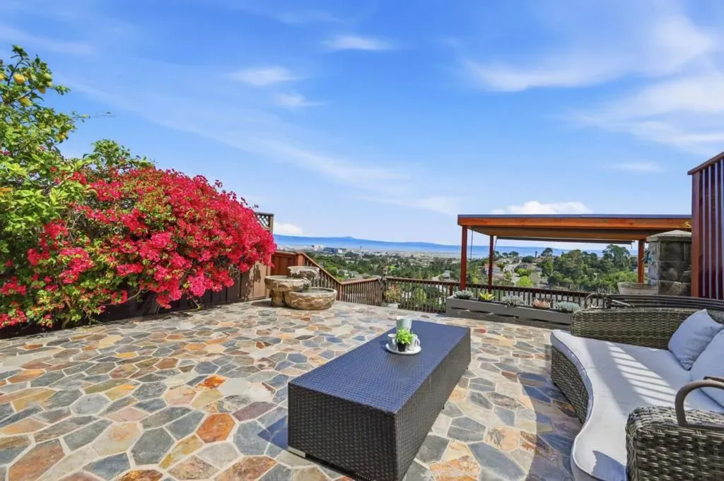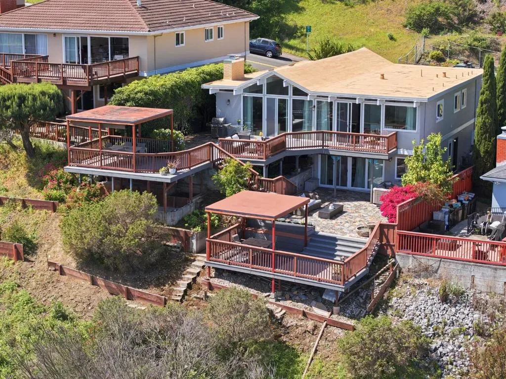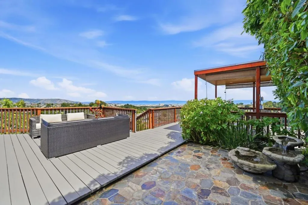 View, elegance, privacy, openness & serenity, practical living style all here. Perched in the prestigious Millbrae hills, this home offers panoramic views stretching across the Bay. Renovated in 2013 & extensively refreshed in 2026 features: modern upgrades, 2 fully equipped living floor ideal for extended family/rental. Upstairs kitchen: long island, brand-new LG stacked oven & microwave, new Samsung 5 burner cooktop. Lower level Kitchen: large peninsula, 4 burner GE cooktop. 2 Bosch dishwashers, 2 newer LG refrigerator. Impressive outdoor backyard: 2 expansive decks & gazebos, multiple sitting area to enjoy sunrise light over the water -Lemon & pomegranate trees, 4 water fountains. Gas line for fire pit & BBQ. – A wall of 8 feet high sliding doors/windows – Central heating/cooling, tankless water heater, instant hot water, alkaline water ionizers -Fresh paint, new lighting, high ceiling, Central vacuum, electric curtain openers, walk-in closets, storage – steam shower, jacuzzi, toilets w/heated seats -Newer roof (Bay Cities Foam Roofing-warranty til 12/2028) -New chimney(warranty til 2/2030) -Lower-level space has been city-approved with final sign-off pending due to pandemic-related delays – 2 Laundry – 2 garage, Tesla charger -Min to top schools, downtown, BART, Caltrain, 280
