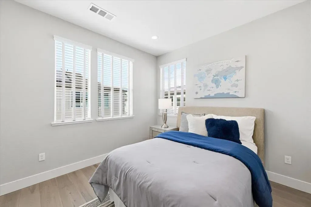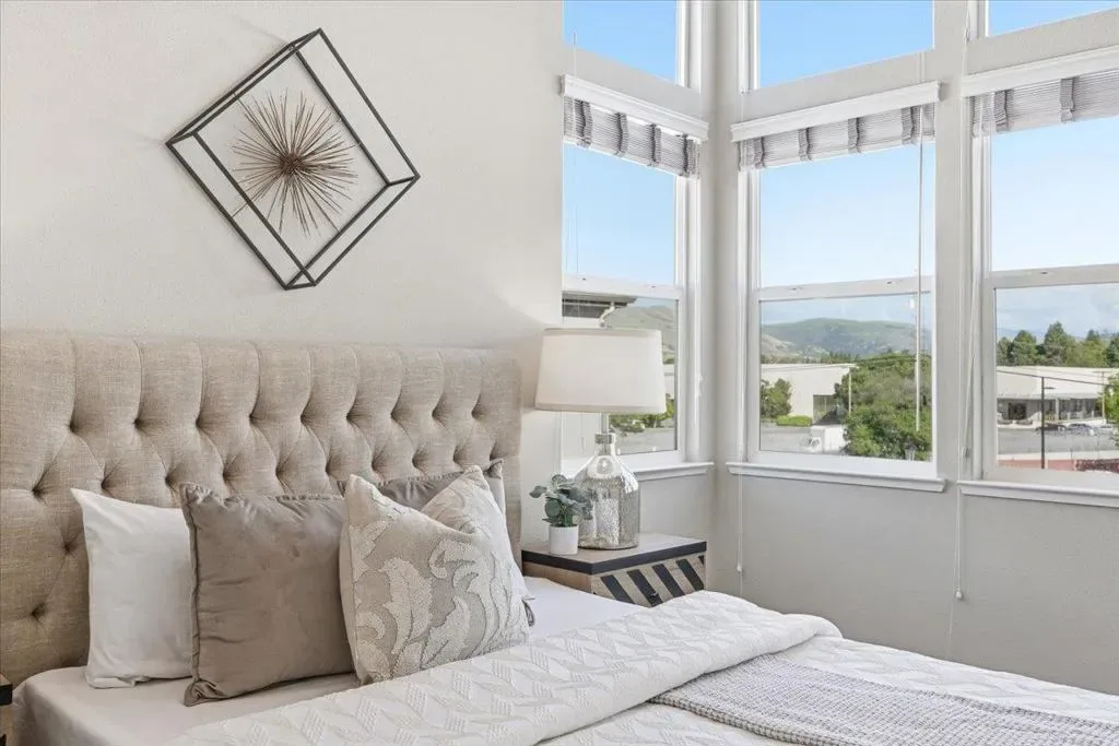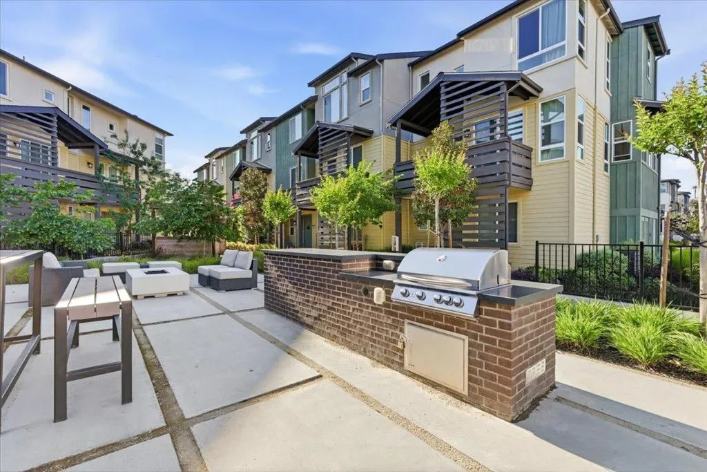 Bright and spacious corner townhome featuring abundant windows and natural light throughout. The ground level offers a versatile den/office, ideal for a home workspace or additional living area. The main level showcases an open-concept layout where the living and dining areas flow seamlessly into a separate family room with direct access to a private outdoor patioperfect for everyday living and entertaining. The gourmet kitchen boasts a large quartz island and countertops, stainless steel appliances, and ample cabinetry for storage. Upstairs, youll find three well-appointed bedrooms, including a private primary suite with a walk-in closet and dual-sink vanity bath. Additional highlights include a side-by-side attached garage with a EV charging outlet, a solar energy system for enhanced efficiency and reduced utility costs, and a location within a desirable school district. Conveniently situated near major tech campuses, South Bay and East Bay commute routes, and just minutes from shopping and dining at Great Mall.