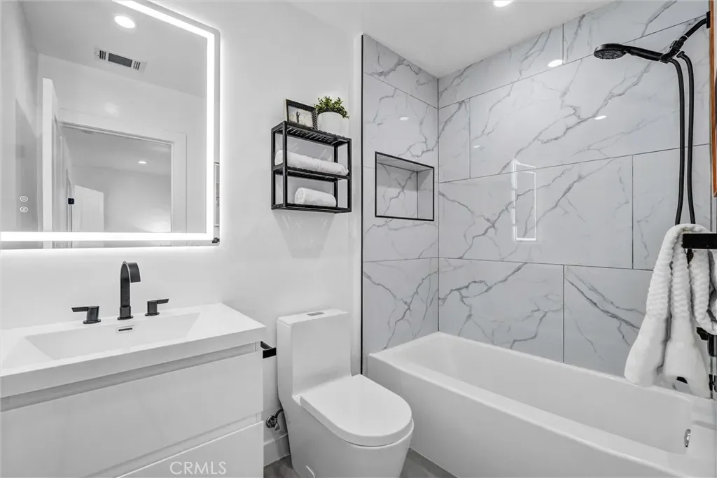 The private primary suite features a walk-in closet and a beautifully updated en-suite bath with a luxury shower, modern finishes, and a contemporary navy double-vanity. Two additional spacious bedrooms share a second fully remodeled bathroom with premium fixtures and tilework. A dedicated in-home laundry area adds convenience and function.