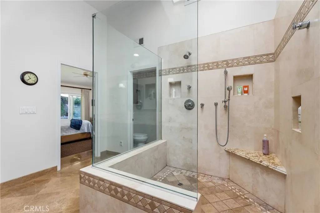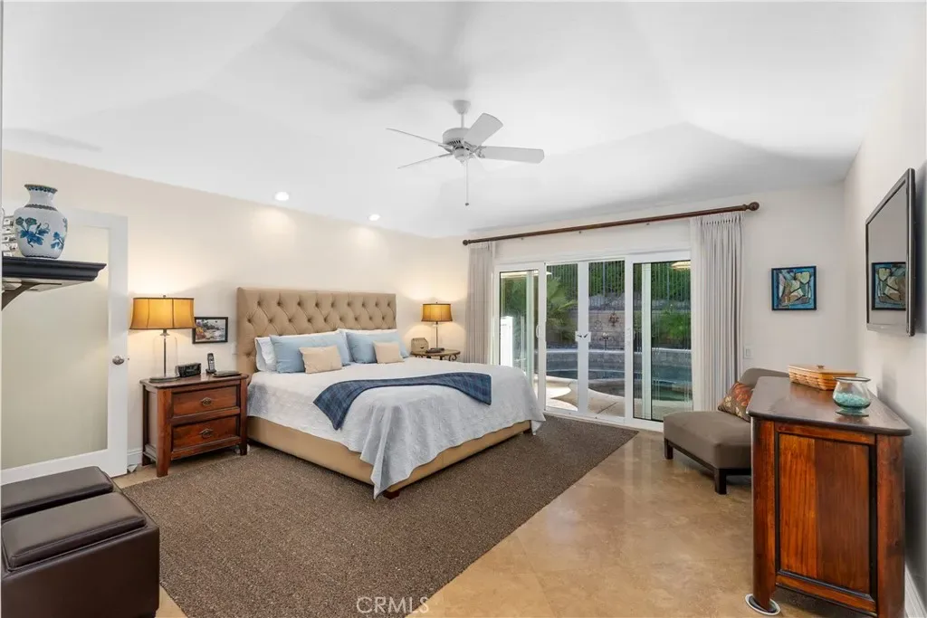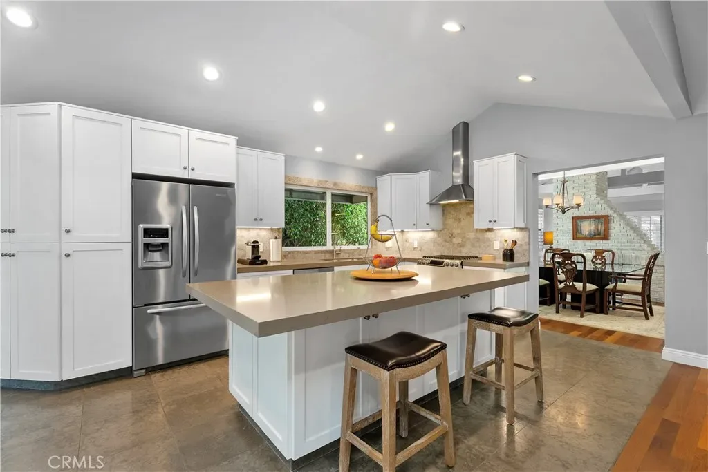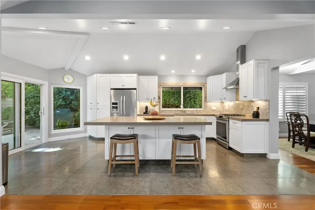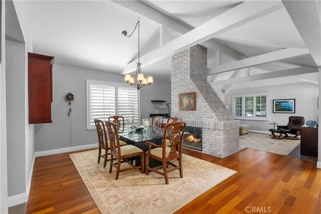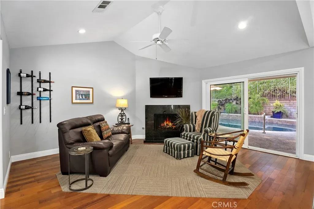 Step inside to discover an open and airy floor plan graced with vaulted ceilings, exposed beams, and a double-sided brick fireplace connecting the spacious living and dining rooms—perfect for gathering and entertaining. The modern kitchen features custom Shaker cabinets, Caesarstone countertops, an oversized island with storage, and stainless steel appliances. The kitchen opens to a cozy family room with a corner granite fireplace and direct views of the backyard oasis. The primary suite is generously sized (approx. 15′ x 21′) and offers a luxurious remodeled spa-inspired bathroom with a large walk-in shower, skylight, separate water closet, and sliding doors leading directly to the PebbleTec pool and spa. The suite also includes a massive walk-in closet (approx. 7′ by 16′) with a custom Elfa storage system. Two additional bedrooms feature large mirrored closets, ceiling fans, and abundant natural light. A second generously-sized bathroom offers dual sinks. An inside laundry with included washer and dryer is just down the hall.