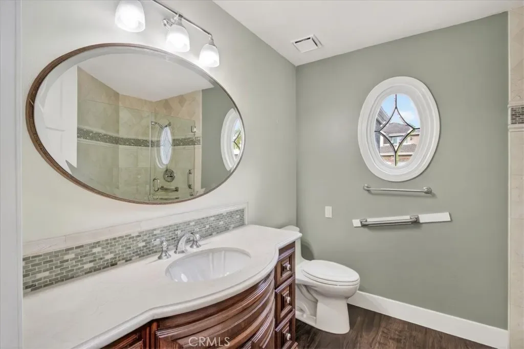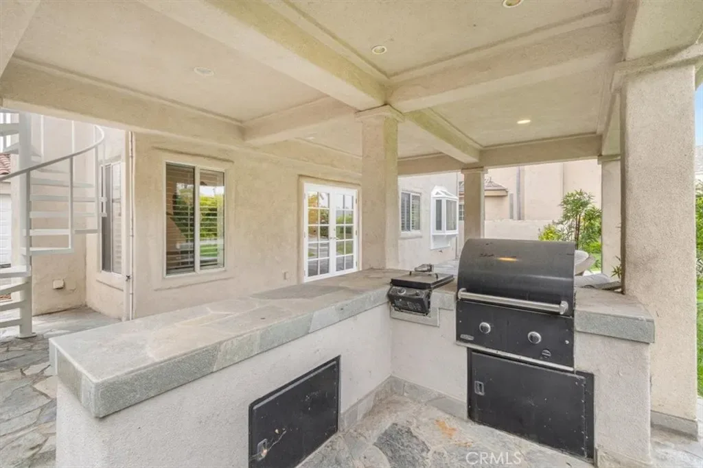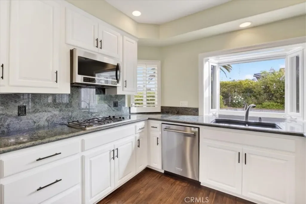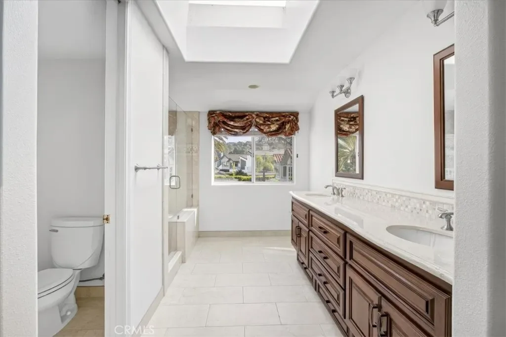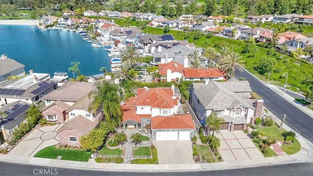 Welcome to life at the Lake. Situated on a quiet cul-de-sac in one of Mission Viejo’s most desirable neighborhoods, this impeccably maintained 4-bedroom, 3-bathroom home is simply gorgeous. As you walk past the rose fountain and notice the flagstone, you’ll enter the main floor through beautiful stained-glass front doors to find 2754 square feet of thoughtfully designed living space. New luxury vinyl flooring runs throughout, delivering the warmth and beauty of hardwood with modern durability. A bright and spacious living room showcases the architectural design of the windows. The formal dining area leads into the highly functional kitchen, which features new cabinet and drawer facings, ample granite counter space, 2 ovens, a gas stove, 2 pantries and a wine refrigerator. The beautiful bay window looks out to a large backyard entertaining area with lake views. The family room is warm and inviting with an elegant fireplace that has been refaced with added cabinets, drawers and granite. Recessed lighting and built-in surround sound speakers complete the room. The French doors lead you out back to a covered patio seating area next to a built-in BBQ with flagstone counter space. The main floor also features a bedroom and full bath, making it ideal for guests, in-laws, or a home office. This bedroom has lovely built-in bookshelves with a slider leading to the garden patio. A separate large utility room includes a refrigerator and a sink. Head up the newly carpeted oak and wrought iron custom staircase to the primary ensuite bedroom, two additional bedrooms and 1 bathroom. Stunning lake views are everywhere in your private primary bedroom, a walk-in shower, dual sinks and a serene, spa-like ambiance. The lake views and extra-large deck off this primary room is a highlight of this home! The skylights flood the home with natural light and create an effortless indoor-outdoor connection. The dual thermostats ensure comfort on both floors. The rare pull-through 3-car garage is a dream for car enthusiasts, hobbyists, or anyone needing serious storage and accessibility. Located minutes from Lake Mission Viejo’s private beaches, top-rated schools, Saddleback Valley dining, and the 241-toll road, this is the lifestyle Orange County buyers dream about. Don’t miss this rare opportunity to purchase on this street.