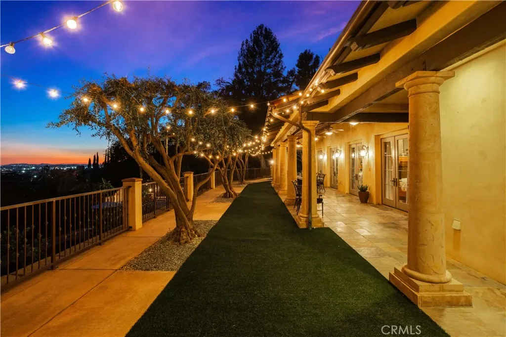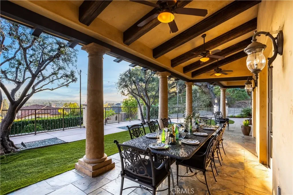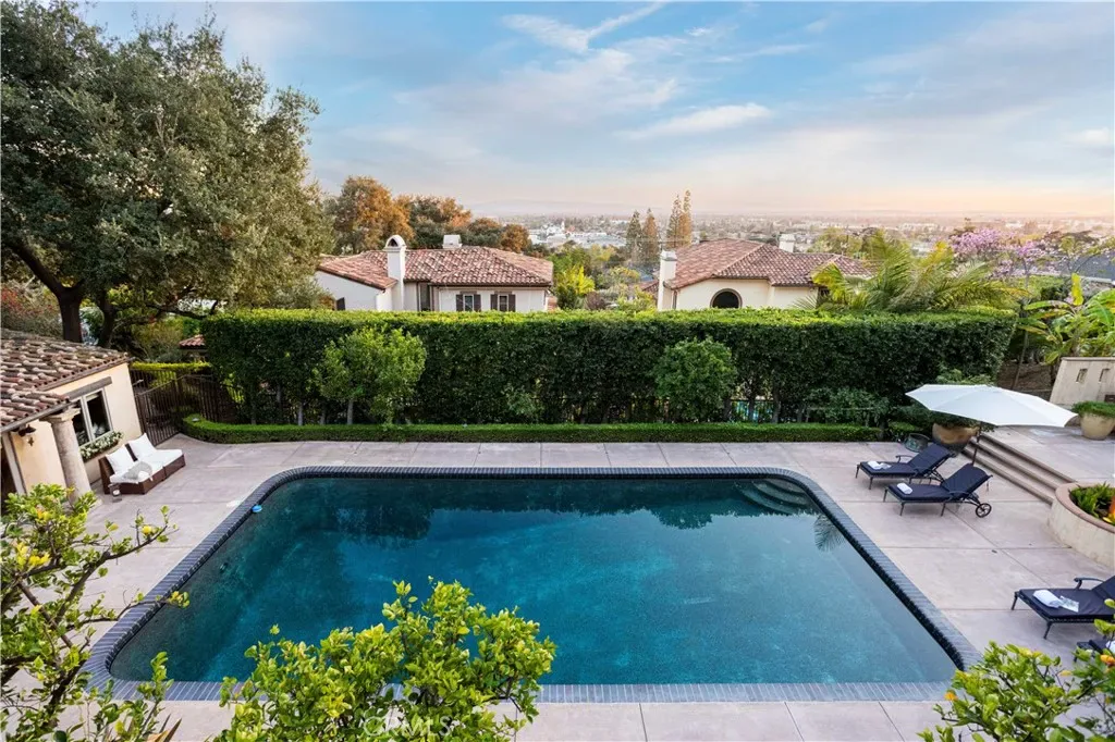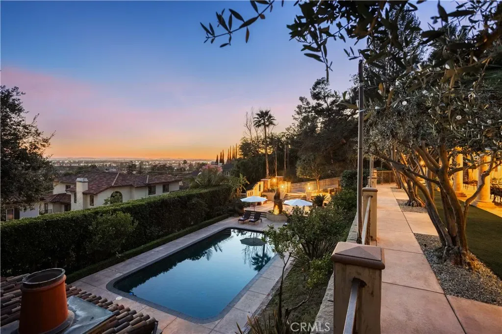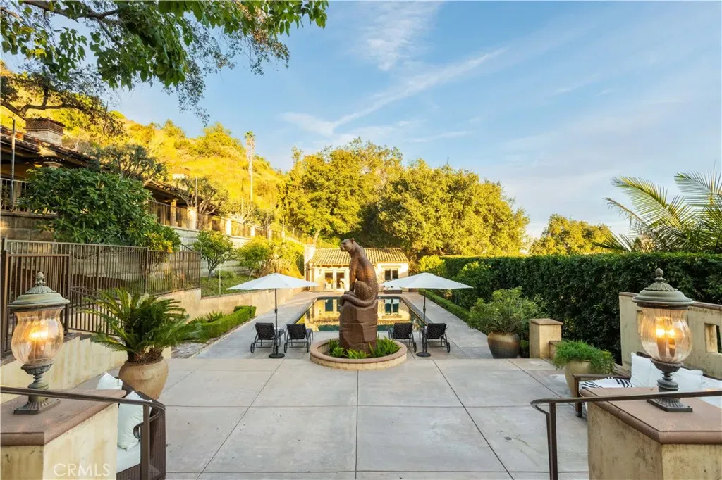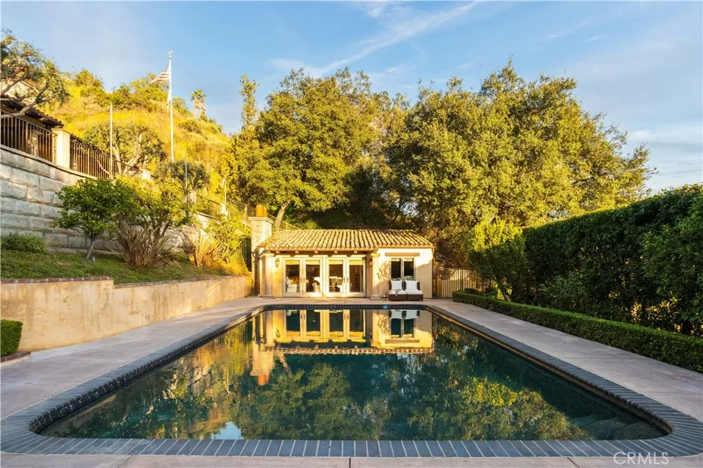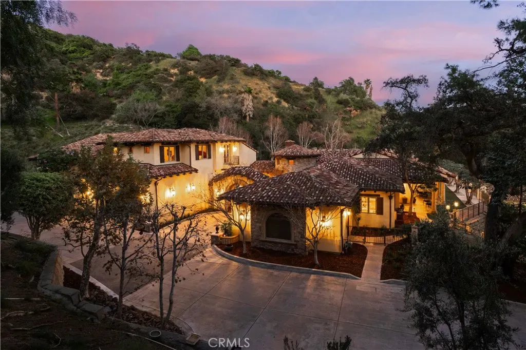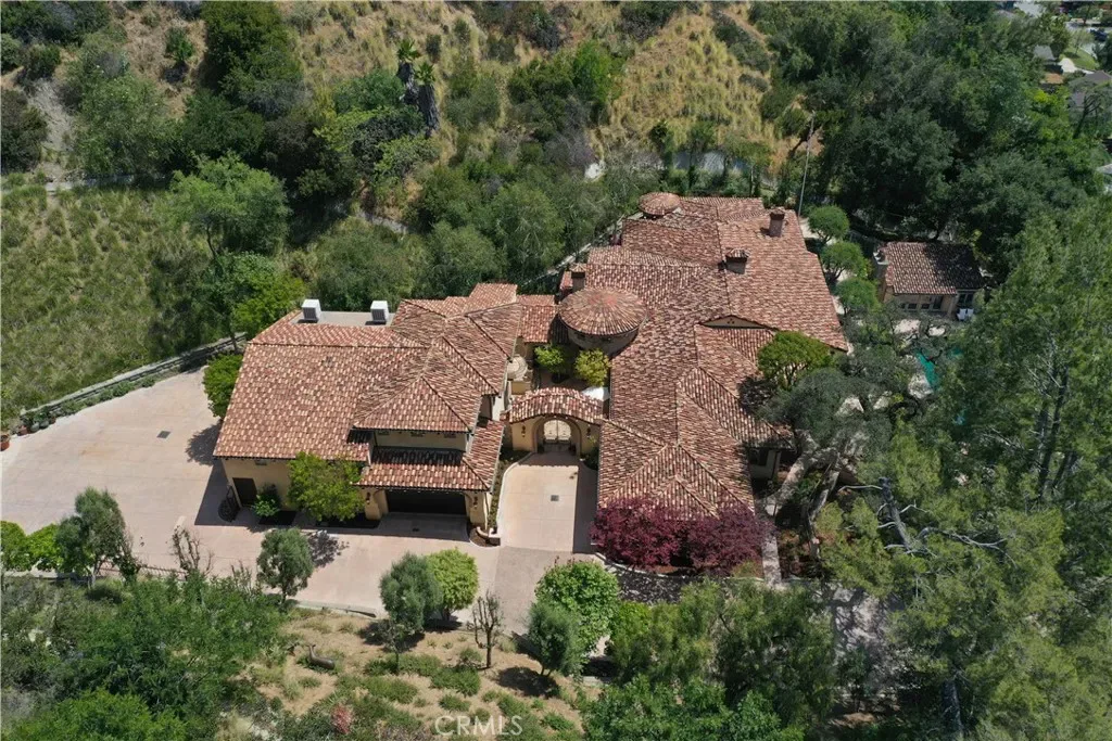 Perched majestically in the foothills of Monrovia, this one-of-a-kind Italian villa-inspired estate offers an unparalleled lifestyle defined by privacy, luxury, and sweeping city views. Sprawling across 13.12 acres, the property features a masterful 4,968 sq. ft. single-level main residence where architectural elegance meets seamless indoor-outdoor flow. The journey begins in a tranquil courtyard with a soothing fountain, leading through a grand foyer into a floorplan designed for sophisticated entertaining. The formal living room, marked by soaring vaulted ceilings and a massive stone double-sided fireplace, transitions into an expansive family room. This space is a connoisseur’s dream, equipped with a full wet bar, wine cellar, wine fridge, and built-in cappuccino machine. Both rooms feature French doors opening to a vast covered patio framing breathtaking vistas. At the heart of the home lies a chef’s kitchen, meticulously appointed with professional-grade appliances, double ovens, a warming drawer, and a large center island with a new cooktop. Granite countertops, custom cabinetry, and a walk-in pantry provide abundant storage, while the breakfast area and built-in desk offer everyday functionality. The kitchen flows gracefully into the formal dining room, perfect for large-scale gatherings. The primary suite is tucked privately at the rear of the home, featuring a fireplace, cedar-lined walk-in closet, and a spa-like bathroom with dual vanities, a soaking tub, and a multi-head steam shower. Three additional bedrooms, two full bathrooms, and two powder rooms ensure comfort, while a dedicated office with built-in bookcases provides a quiet workspace in a private wing. Beyond the main residence, a 2,164 sq. ft. vehicle storage garage with an integrated workshop is topped by a charming 895 sq. ft. upper-level apartment. This guest unit includes a balcony, full kitchen, and two bedrooms, with infrastructure for an elevator. The lower tier is an entertainer’s paradise, featuring a sparkling pool, outdoor fireplace, and a 520 sq. ft. pool house with its own kitchen, living area, bedroom, and bath. This estate is rounded out by a solar system, multi-zone HVAC, and a whole-house vacuum, offering a rare blend of Mediterranean inspiration and modern efficiency.