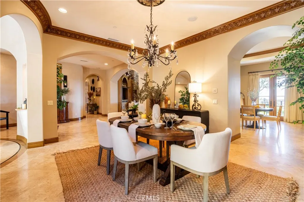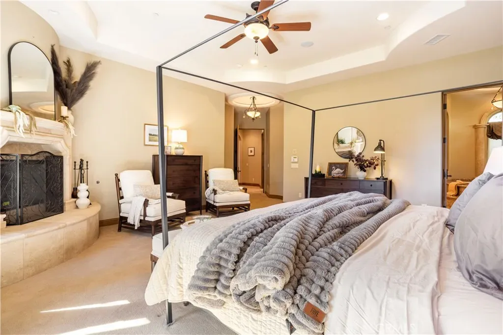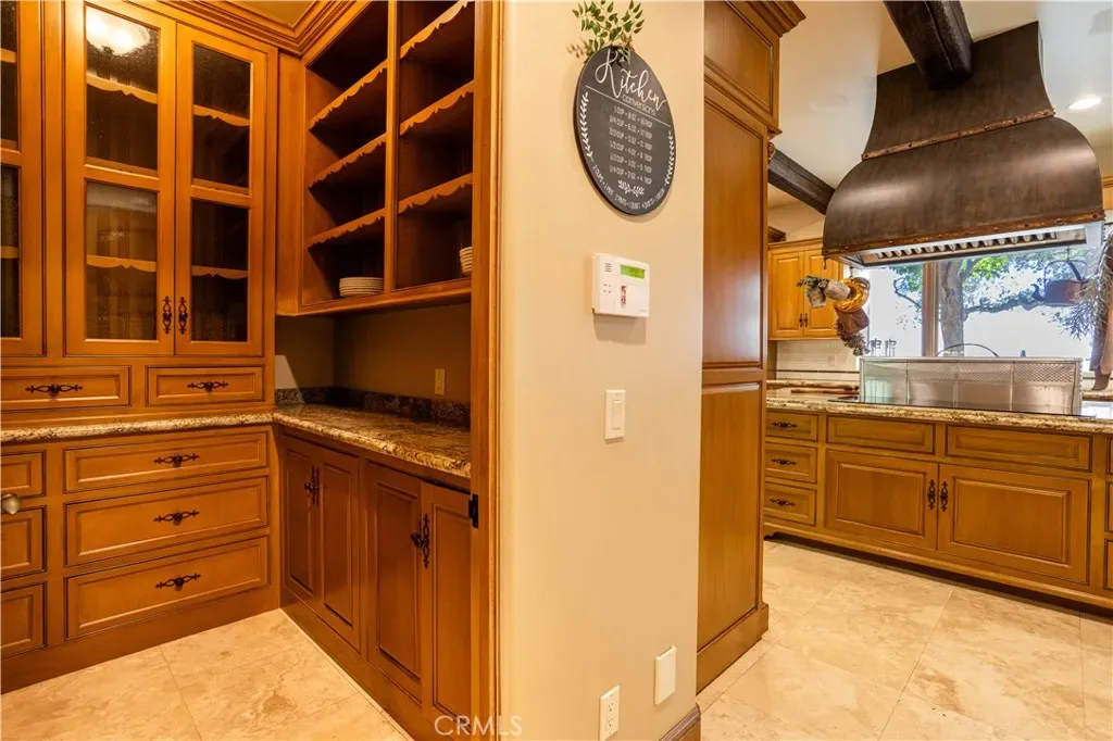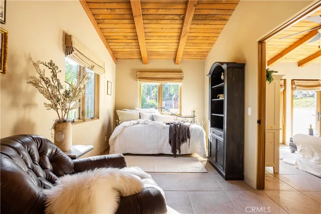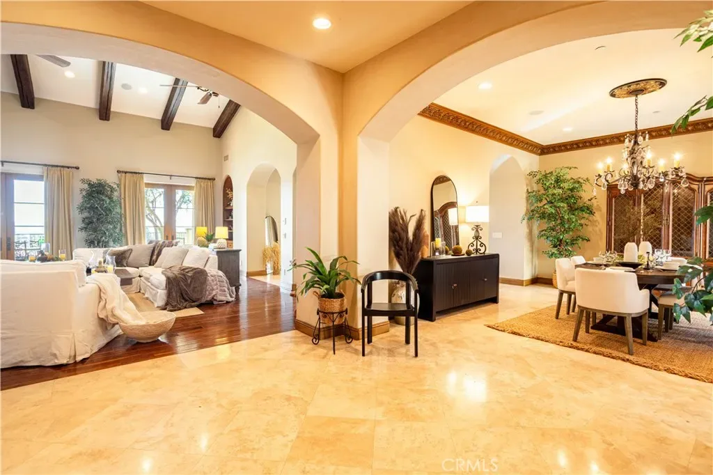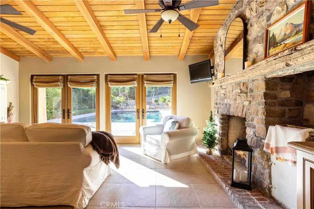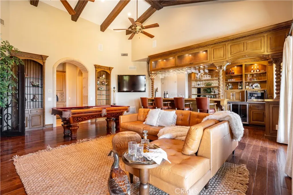 Perched majestically in the foothills of Monrovia, this one-of-a-kind Italian villa-inspired estate offers an unparalleled lifestyle defined by privacy, luxury, and sweeping city views. Sprawling across 13.12 acres, the property features a masterful 4,968 sq. ft. single-level main residence where architectural elegance meets seamless indoor-outdoor flow. The journey begins in a tranquil courtyard with a soothing fountain, leading through a grand foyer into a floorplan designed for sophisticated entertaining. The formal living room, marked by soaring vaulted ceilings and a massive stone double-sided fireplace, transitions into an expansive family room. This space is a connoisseur’s dream, equipped with a full wet bar, wine cellar, wine fridge, and built-in cappuccino machine. Both rooms feature French doors opening to a vast covered patio framing breathtaking vistas. At the heart of the home lies a chef’s kitchen, meticulously appointed with professional-grade appliances, double ovens, a warming drawer, and a large center island with a new cooktop. Granite countertops, custom cabinetry, and a walk-in pantry provide abundant storage, while the breakfast area and built-in desk offer everyday functionality. The kitchen flows gracefully into the formal dining room, perfect for large-scale gatherings. The primary suite is tucked privately at the rear of the home, featuring a fireplace, cedar-lined walk-in closet, and a spa-like bathroom with dual vanities, a soaking tub, and a multi-head steam shower. Three additional bedrooms, two full bathrooms, and two powder rooms ensure comfort, while a dedicated office with built-in bookcases provides a quiet workspace in a private wing. Beyond the main residence, a 2,164 sq. ft. vehicle storage garage with an integrated workshop is topped by a charming 895 sq. ft. upper-level apartment. This guest unit includes a balcony, full kitchen, and two bedrooms, with infrastructure for an elevator. The lower tier is an entertainer’s paradise, featuring a sparkling pool, outdoor fireplace, and a 520 sq. ft. pool house with its own kitchen, living area, bedroom, and bath. This estate is rounded out by a solar system, multi-zone HVAC, and a whole-house vacuum, offering a rare blend of Mediterranean inspiration and modern efficiency.