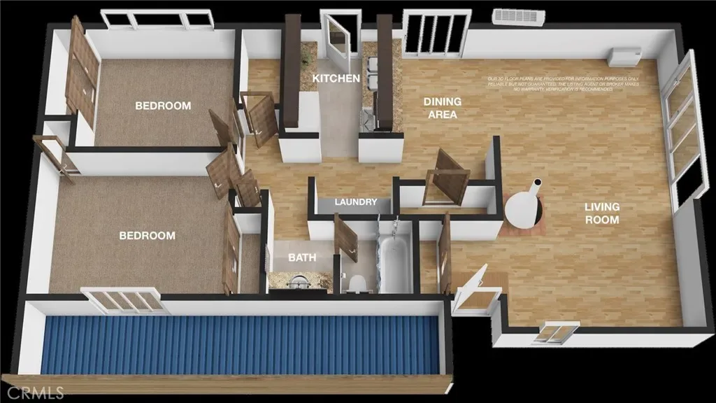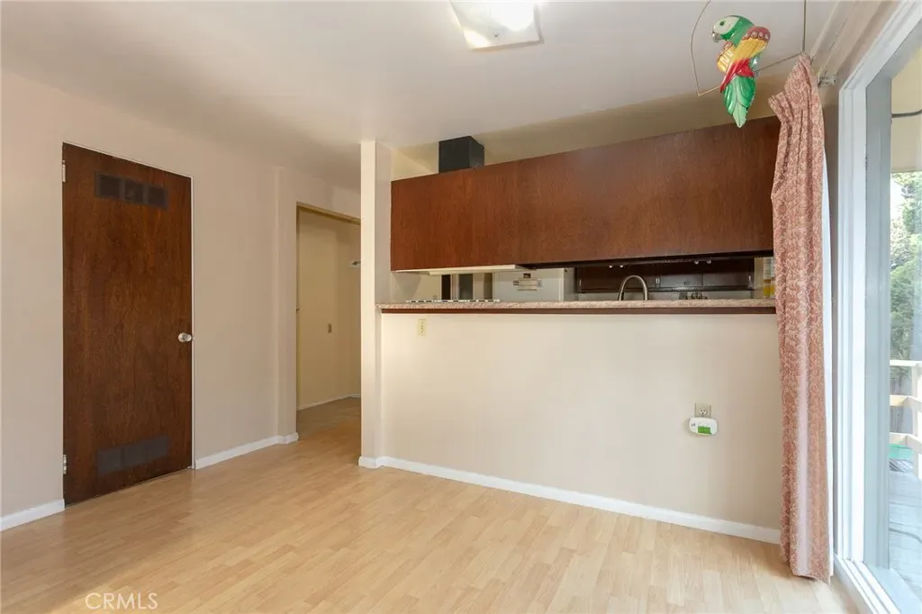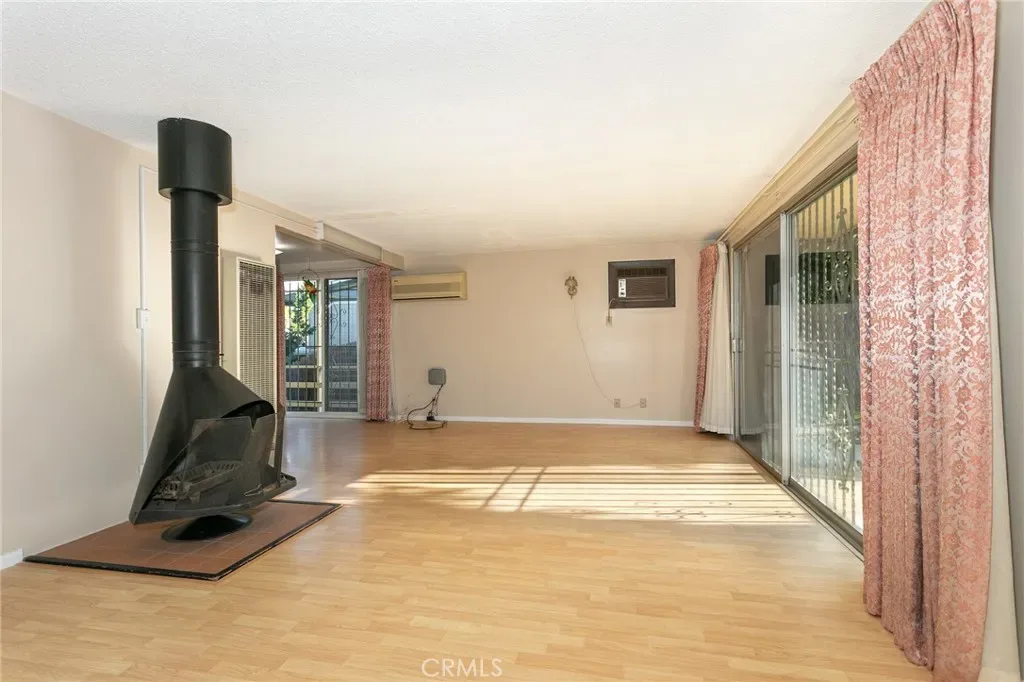 Single-story with 2 bedrooms and 1 bathroom. Living room features a freestanding fireplace, natural light, backyard access, and wall A/C. The kitchen includes wood cabinetry, granite counters, and tile flooring, next to a dining area. A hallway leads to a laundry area and a full bath with skylight. One bedroom offers access to a private enclosed deck. The backyard provides space for outdoor use.