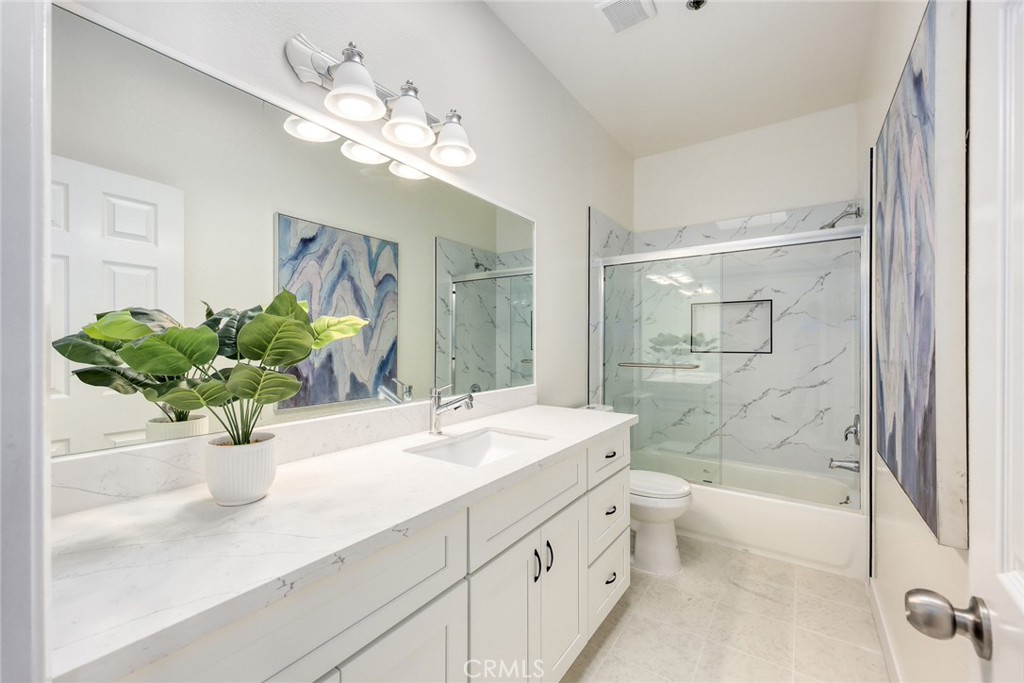 The spacious primary suite is a highlight, featuring high ceilings with recessed lights, a large walk-in closet, and a private balcony. The ensuite bath includes dual sinks and a tub-and-shower combination. Two additional bedrooms share a full bathroom that has been tastefully renovated with new counters and stylish backsplashes, plus a skylight that fills the room with natural light.