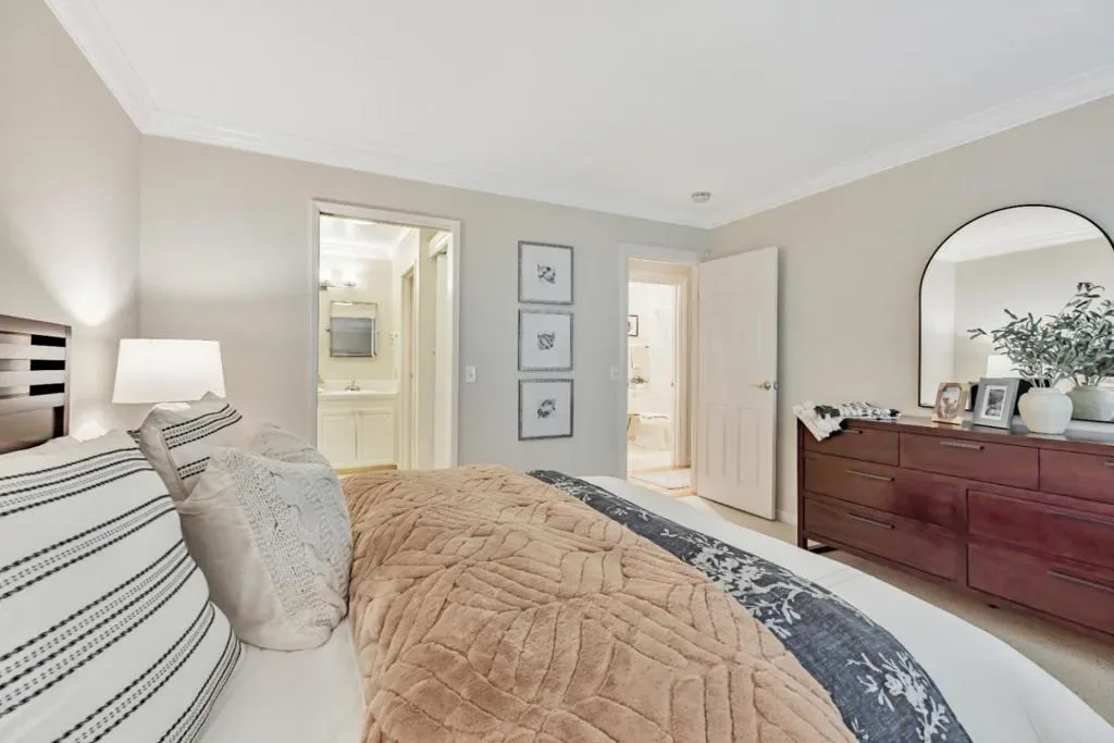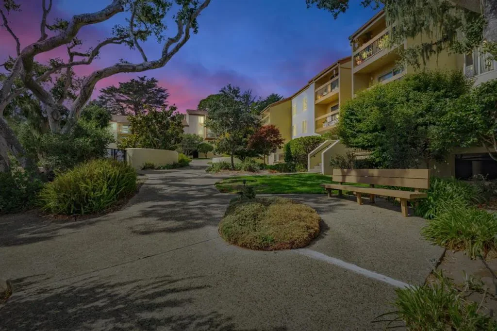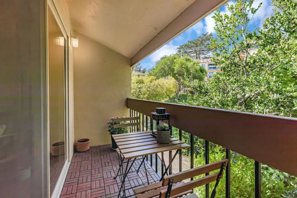 This immaculate, attention to detail updated light-filled 2-bedroom, 2-bathroom second-story unit offers serene treetop and central courtyard views, facing the inviting heated pool. Step onto your private balcony and into a beautifully updated space featuring a fully remodeled open kitchen with custom white Thomasville cabinetry, Kohler fixtures, Carrara countertops, white Venetian glass tile backsplash, and brand-new stainless steel appliances. The living room showcases newly installed natural oakwood flooring with eco-cork underlayment for sound reduction, complemented by refinished hardwood floors throughout and new baseboards in the living and dining areas. Both bedrooms feature brand-new, natural wool Berber carpeting from New Zealand, offering comfort and sustainability. The master suite includes a walk-in closet and an updated ensuite bathroom with dual sinks. Every room, including closets, has been professionally painted in a warm neutral with crisp Swiss Coffee trim and crown molding for a timeless finish. Enjoy the easy lifestyle with access to beautifully landscaped common areas, a heated pool, BBQ area, clubhouse, laundry facility, and a private parking garage. Just minutes from vibrant downtown, Fisherman’s Wharf, and scenic coastal walking and biking trails.
