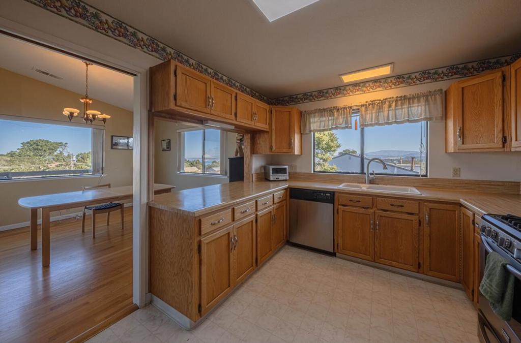 Elegant 3 bedroom, 2.5 bath residence offering over 2,200 square feet of thoughtfully designed living space, exclusive of the basement and two-car garage. The upper level features a light-filled kitchen, dining area, and living room, along with a spacious primary suite with full bath. Sweeping ocean and Monterey Airport runway views can be enjoyed from the kitchen, dining room, living room, and adjoining deck creating an exceptional setting for both daily living and entertaining. A convenient laundry and pantry area, along with a half bath, complete the top floor. The lower level includes two additional bedrooms, a full bath, a generous family room, and a second deck offering tranquil ocean views. Beautiful oak hardwood floors run throughout the home, including the stairwell and banister, adding warmth and timeless character. The charming front yard is enclosed by a classic Carmel stone wall, providing an inviting seating area, while the backyard features a small fenced in area with shed for added storage. Ideally located just a short walk from downtown Monterey, this exceptional home combines breathtaking views, functional design, and an unbeatable location rare opportunity to enjoy the very best of Monterey living.