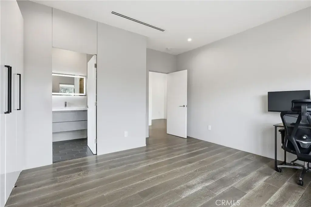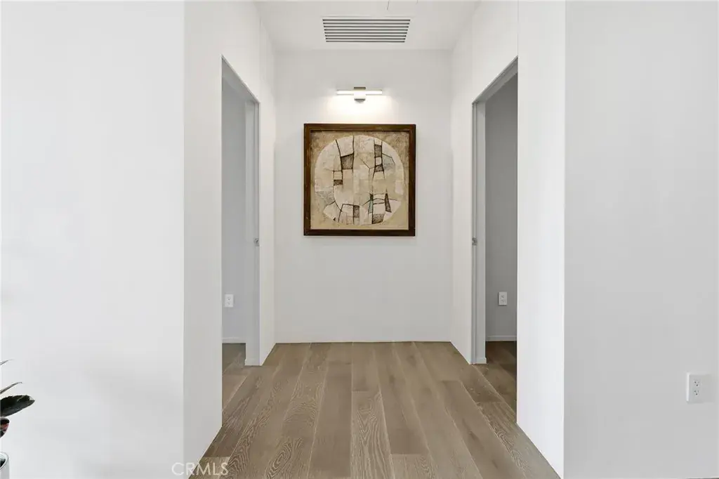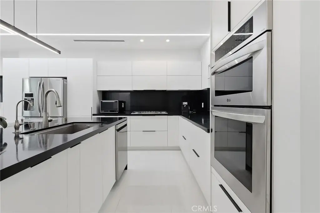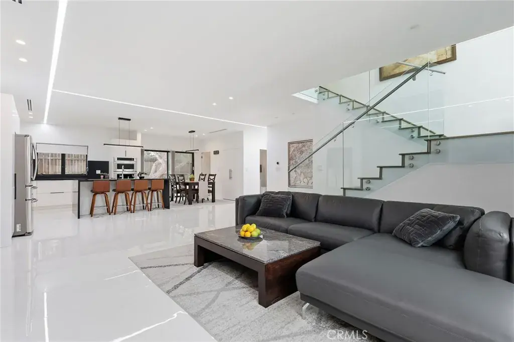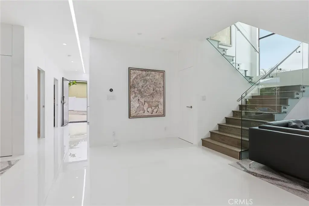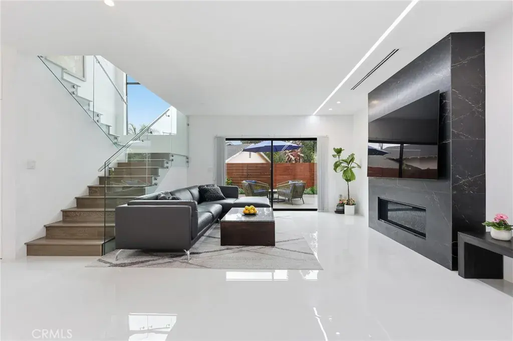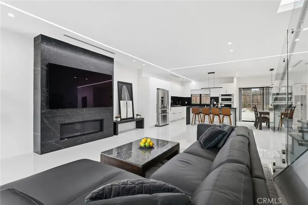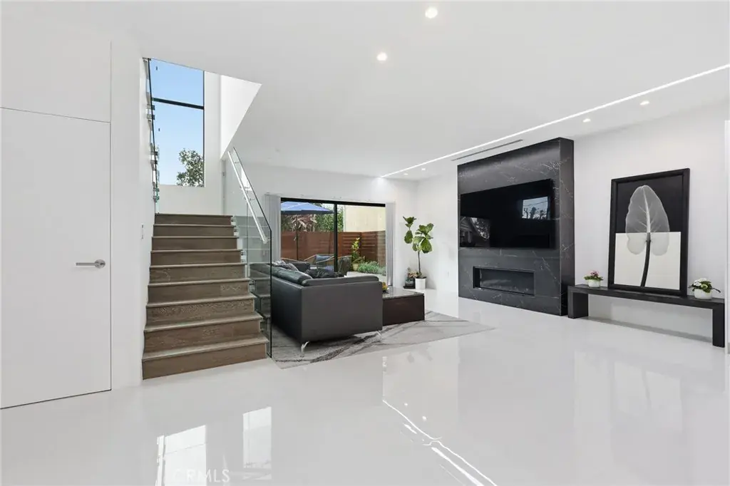 Natural light fills the open-concept main level with tile flooring, a European-style kitchen featuring a large island, 36″ LG cooktop, oven, microwave, and dual pantries (one convertible to a wine rack), and a spacious living area with a modern fireplace and Art wall for TV or Painting. A flexible downstairs room with adjacent bath, works well as an office or guest space. A striking vertical stair window captures mountain views by day and city lights by night, and the flat roof allows for a potential rooftop terrace.