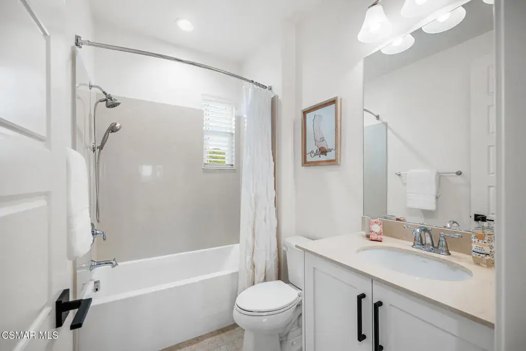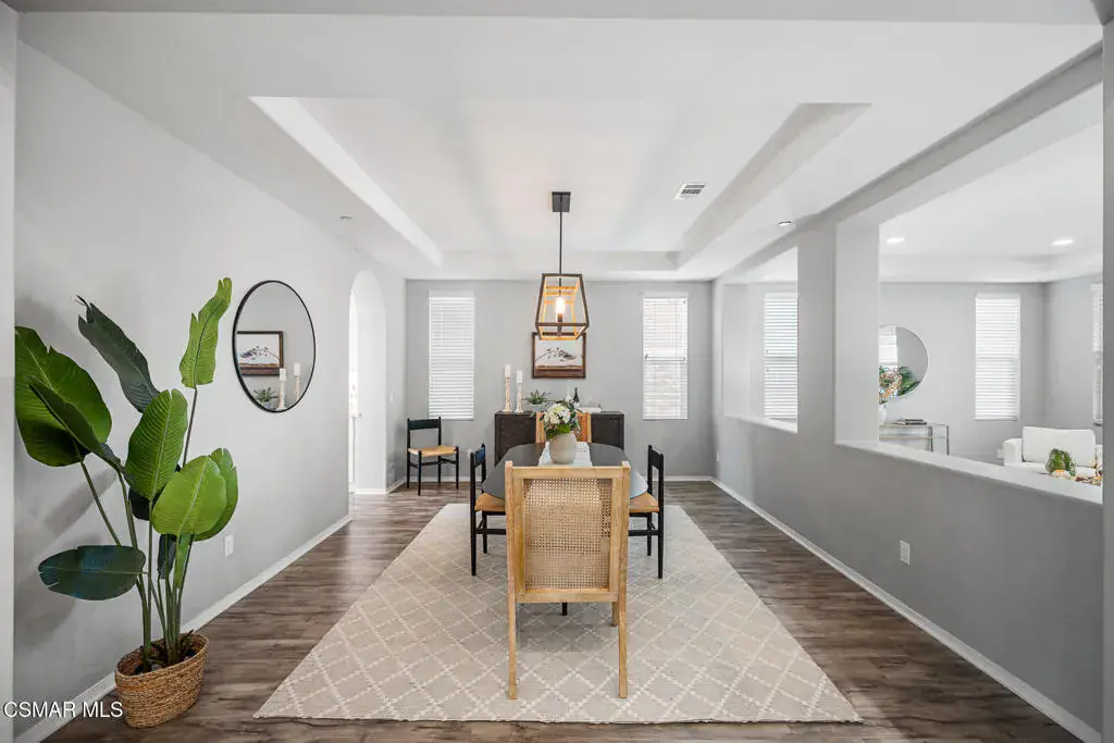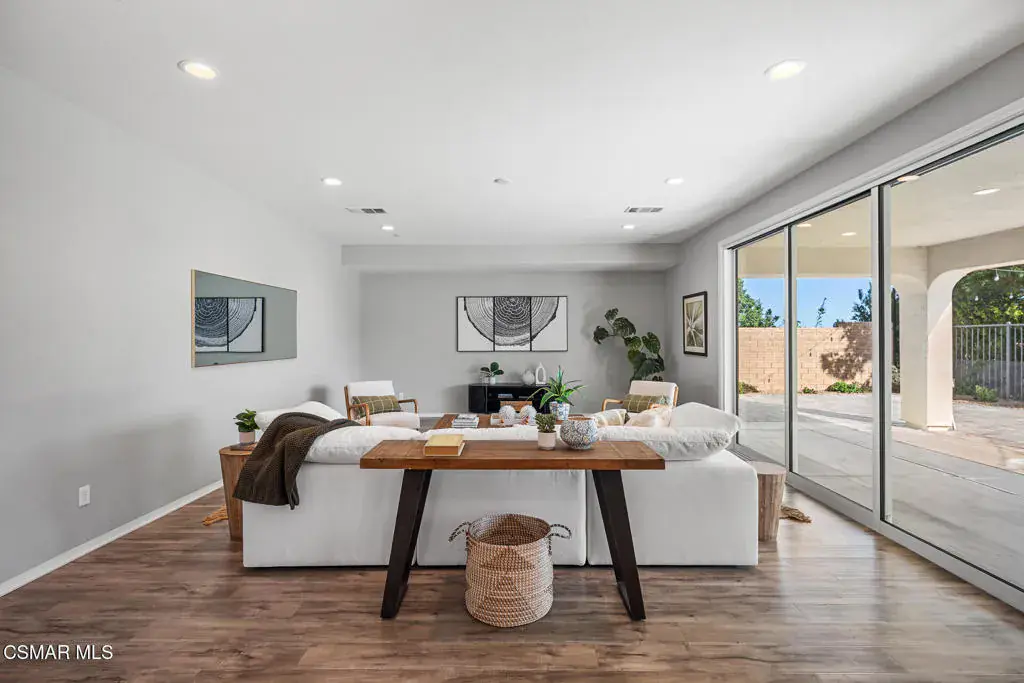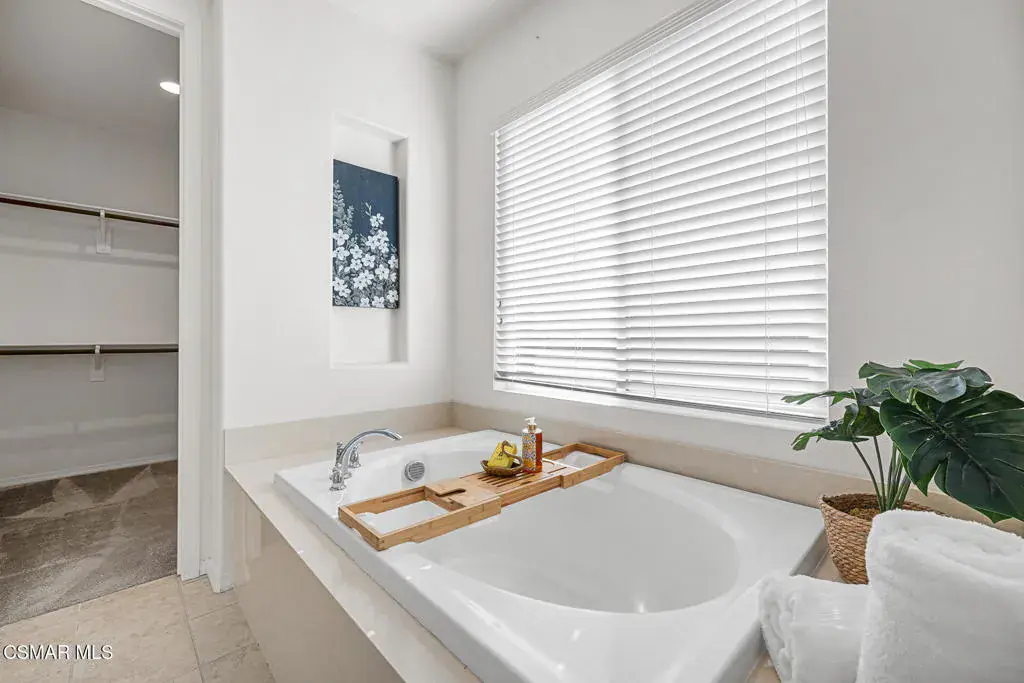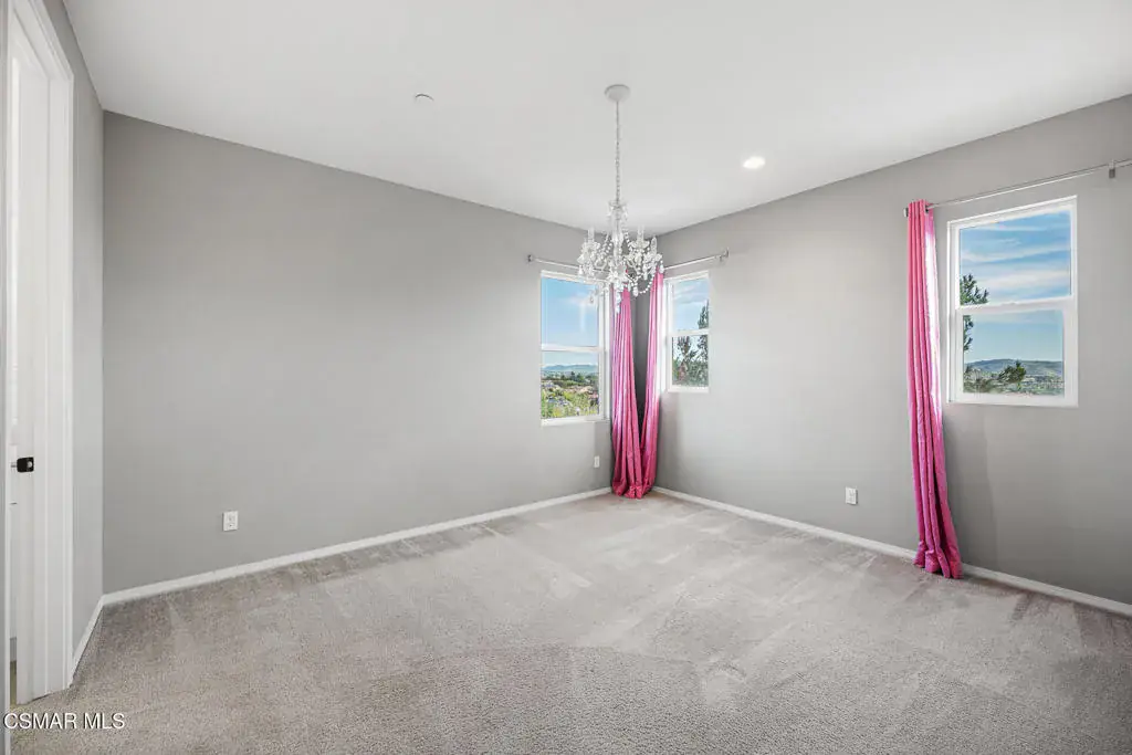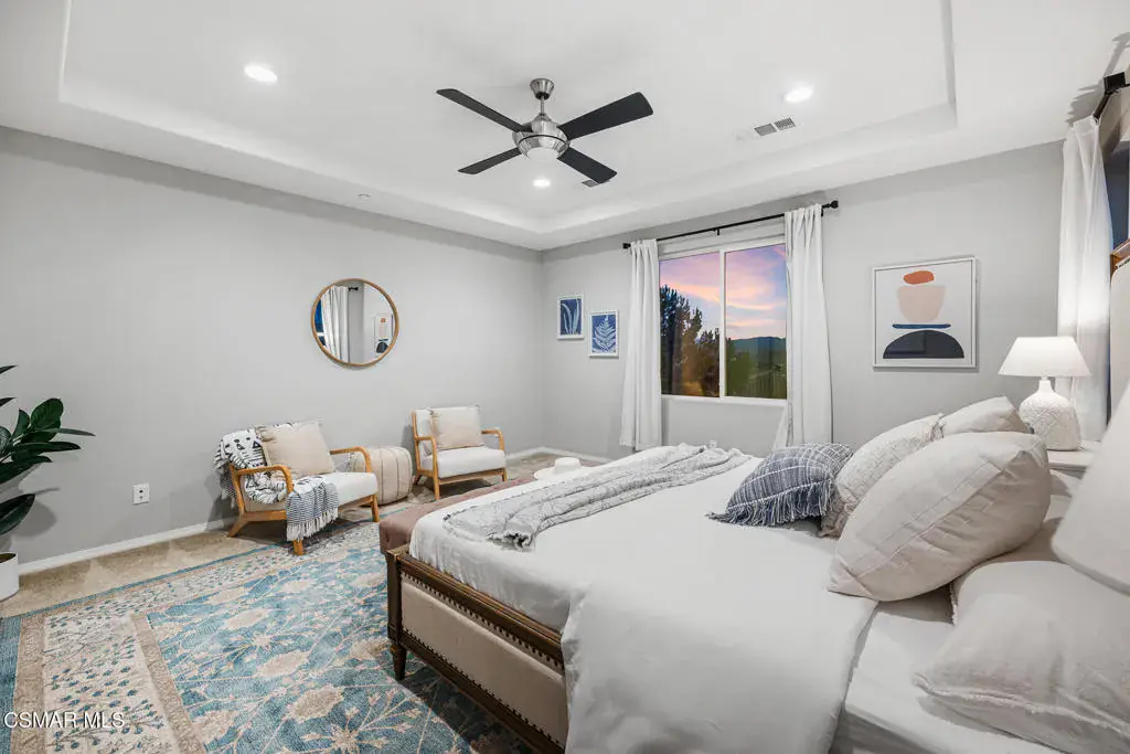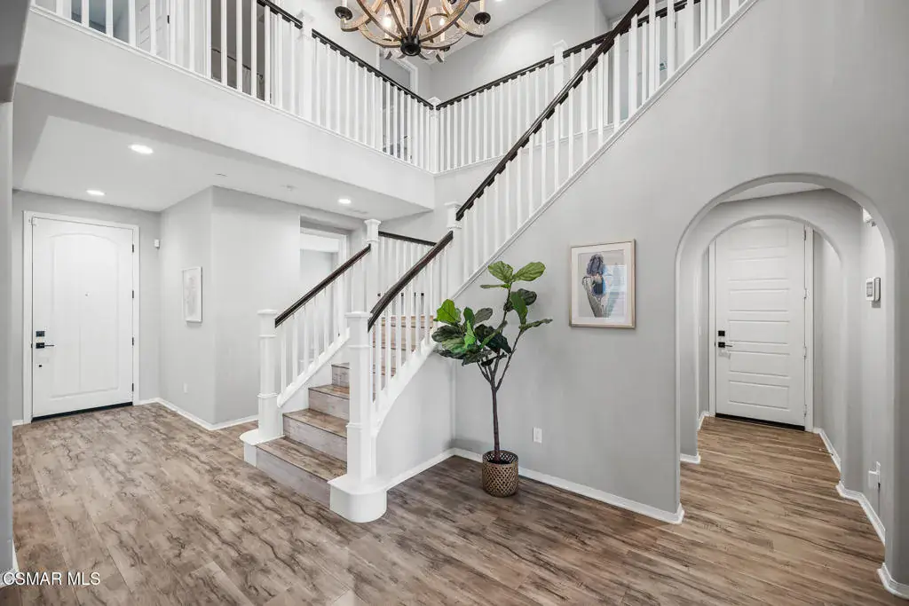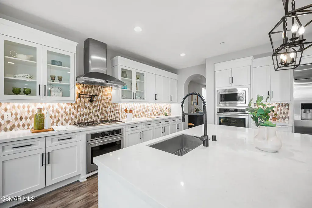 An exceptional opportunity within the gated Meridians of Moorpark. Built in 2017, this impressive cul-de-sac residence offers five bedrooms, five bathrooms, and nearly 3,800 square feet of open, thoughtfully designed living space. The home feels expansive yet inviting, with wood-like flooring, recessed lighting throughout, and generously sized rooms that flow effortlessly from one to the next.The designer kitchen serves as the heart of the home, showcasing a large center island with breakfast bar and pendant lighting, custom tile accents, quartz countertops, bright white cabinetry, and stainless steel appliances. A pot filler at the range adds both convenience and style, while the casual dining area creates an ideal setting for everyday living or intimate gatherings.A grand staircase leads upstairs to a versatile loft and well-appointed bedrooms, many enjoying scenic views of the surrounding hills. The primary suite offers a peaceful retreat, complete with dual sinks, tile flooring, a separate shower, and a sunken soaking tub designed for true relaxation.The backyard is designed for effortless entertaining and quiet moments alike, featuring a spacious paver patio, built-in fire pit with bench seating, custom decking, and a covered patio, all set against sweeping panoramic mountain and hillside views. Located within a secure gated community, this newer home combines space, comfort, and elevated design–creating a setting that feels as impressive as it is easy to enjoy.
