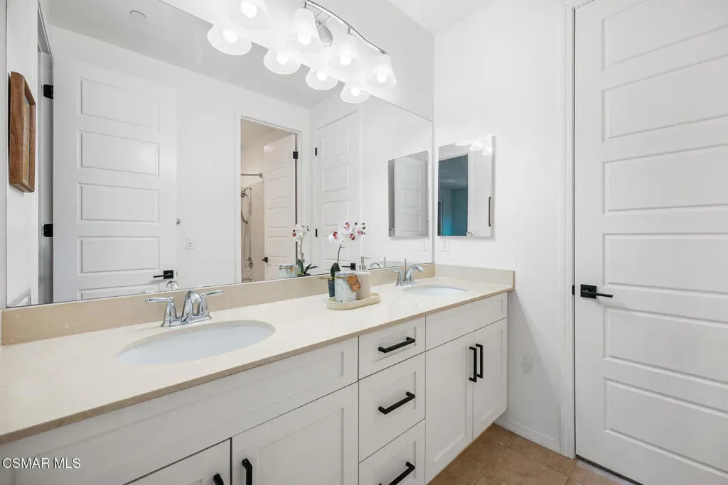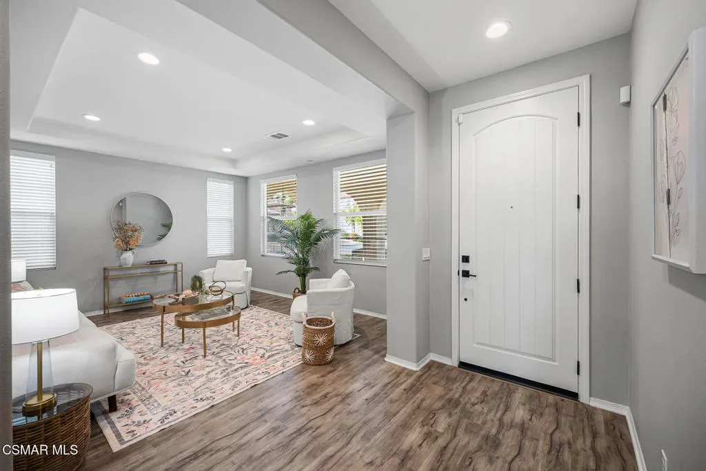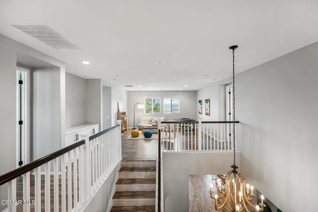 An exceptional opportunity within the gated Meridians of Moorpark. Built in 2017, this impressive cul-de-sac residence offers five bedrooms, five bathrooms, and over 3,800 square feet of open, thoughtfully designed living space. The home feels expansive yet inviting, with wood-like flooring, recessed lighting throughout, and generously sized rooms that flow effortlessly from one to the next.The designer kitchen serves as the heart of the home, showcasing a large center island with breakfast bar and pendant lighting, custom tile accents, quartz countertops, bright white cabinetry, and stainless steel appliances. A pot filler at the range adds both convenience and style, while the casual dining area creates an ideal setting for everyday living or intimate gatherings.A grand staircase leads upstairs to a versatile loft and well-appointed bedrooms, many enjoying scenic views of the surrounding hills. The primary suite offers a peaceful retreat, complete with dual sinks, tile flooring, a separate shower, and a sunken soaking tub designed for true relaxation.The backyard is designed for effortless entertaining and quiet moments alike, featuring a spacious paver patio, built-in fire pit with bench seating, custom decking, and a covered patio, all set against sweeping panoramic mountain and hillside views. Located within a secure gated community, this newer home combines space, comfort, and elevated design–creating a setting that feels as impressive as it is easy to enjoy.
