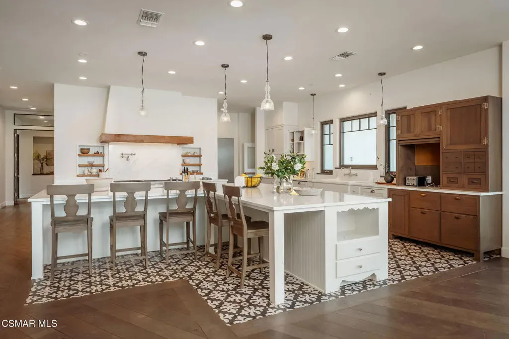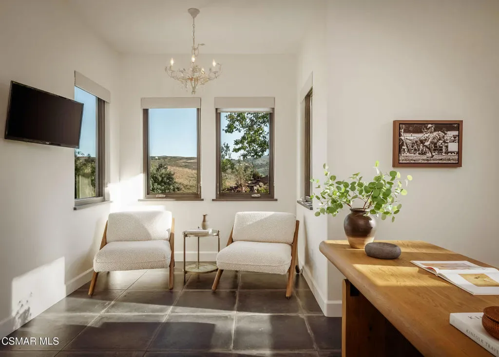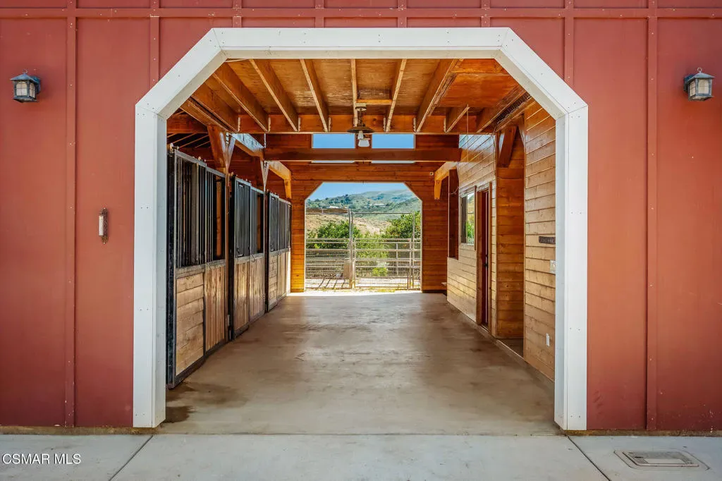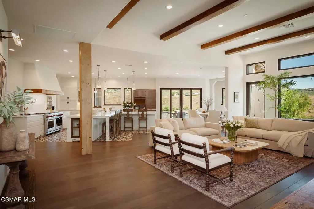 Lapeyre Ranch, an incredible opportunity in Moorpark… and this one is truly something special. Set across 10 acres of rolling, usable land, 15645 Lapeyre Road offers a rare and compelling blend of modern farmhouse living, income producing agriculture and fully realized equestrian amenities; all framed by sweeping views and endless open sky.Privately positioned at the top of the property, the newly refreshed 4,937 square foot residence captures breathtaking panoramic vistas from nearly every angle. Designed in a warm, modern farmhouse aesthetic, the home features expansive open concept living spaces, wide plank wood floors and beautiful exposed beams that create both volume and intimacy. The heart of the home is a stunning chef’s kitchen, complete with a large center island, custom cabinetry, statement range and sunlit breakfast area. All seamlessly connected to the main living and dining spaces for effortless entertaining.Walls of windows and doors open to an inviting outdoor setting, where a built in BBQ, firepit lounge, and multiple seating areas overlook the surrounding orchards, barn and distant hills; creating the ultimate indoor/outdoor lifestyle.With 8 bedrooms and 3.5 baths, the home offers incredible flexibility for extended family, guests or a live/work dynamic.Beyond the residence, the property unfolds into a truly special ranch environment. Approximately 1,600 flourishing avocado trees and 425 Tango tangerine trees provide meaningful income potential, while the equestrian facilities are both functional and thoughtfully designed. A classic red barn with oversized stalls and corrals sits alongside a large riding arena, ideal for recreational riding. In addition, a substantial 40′ x 60′ detached shop/garage provides exceptional space for equipment, vehicles, storage, or all of your ranch needs–an incredibly valuable and versatile addition to the property.A private swimming pond with dock adds a rare and tranquil element, offering a peaceful retreat and a true connection to the land. Gently sloping acreage, mature landscaping and wide open space create a setting that feels both expansive and serene.This is a privately gated property where lifestyle, land and opportunity come together seamlessly. Whether you’re seeking a working ranch, an equestrian retreat or a private estate with income producing potential….15645 Lapeyre Road is more than a home… it’s a destination.