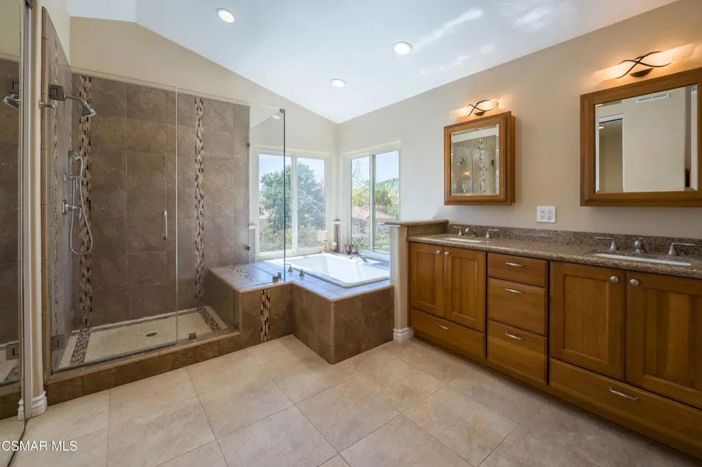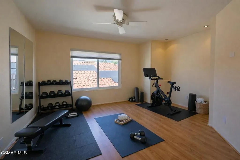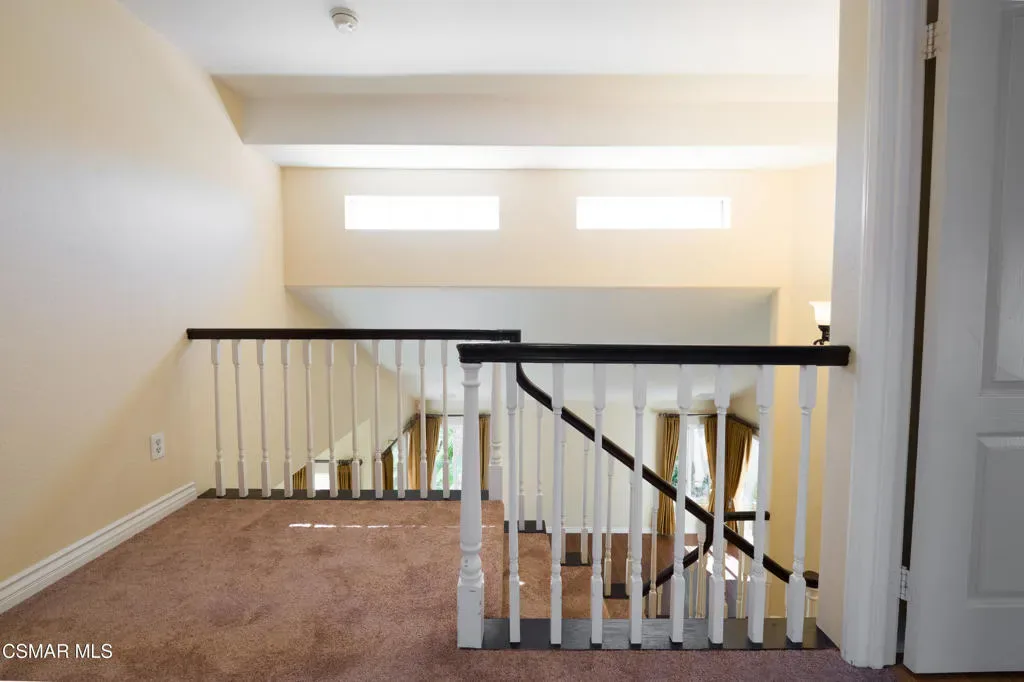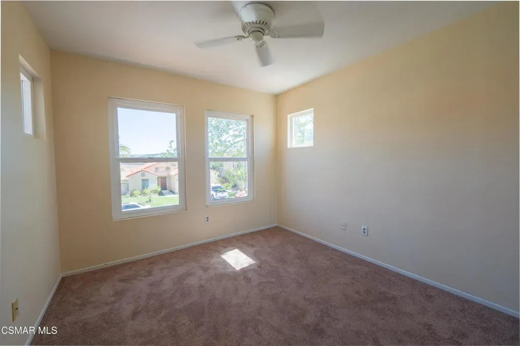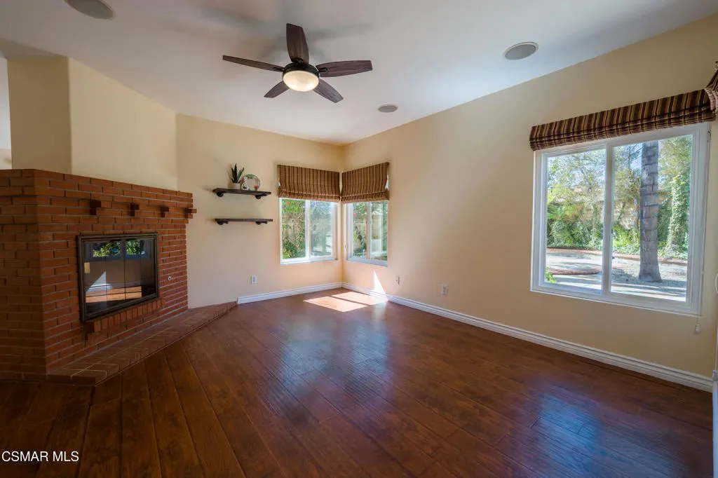 Beautiful 4-bedroom, 3-bath home located at the end of a quiet cul-de-sac in the highly desirable Campus Hills neighborhood at the top of University Drive in Moorpark. This private, interior location offers peace, tranquility, and minimal traffic.The home features wood-like flooring throughout the living, family, and dining areas, with tile in the kitchen, entry, and bathrooms. Fresh interior paint and new carpeting make the home move-in ready.The kitchen is equipped with granite countertops, newer cabinetry, microwave, gas oven and range, and includes the refrigerator. All three bathrooms have been updated.A shared fireplace connects the living and family rooms, creating a warm and inviting atmosphere. Ceiling fans are installed in the bedrooms and family room, complemented by a statement chandelier.Upstairs, a skylight fills the hallway with natural light, and built-ins in the bedrooms provide added storage. The primary suite features a private balcony overlooking the backyard patio.Sliding glass doors in both the living and family rooms open to the backyard, which includes palm trees, colored concrete, and a fire pit–ideal for entertaining and relaxing.Additional highlights include a 3-car garage, built-in speakers inside and out, and a smart leak detection system. The home is conveniently located near shopping, schools, freeway access, and the community pool and spa on University.Sunrun solar adds efficiency and value. This home truly shows pride of ownership and offers exceptional space to live and entertain in Moorpark.