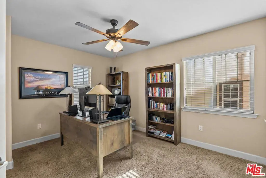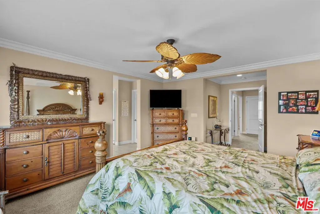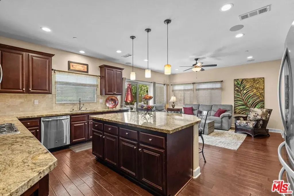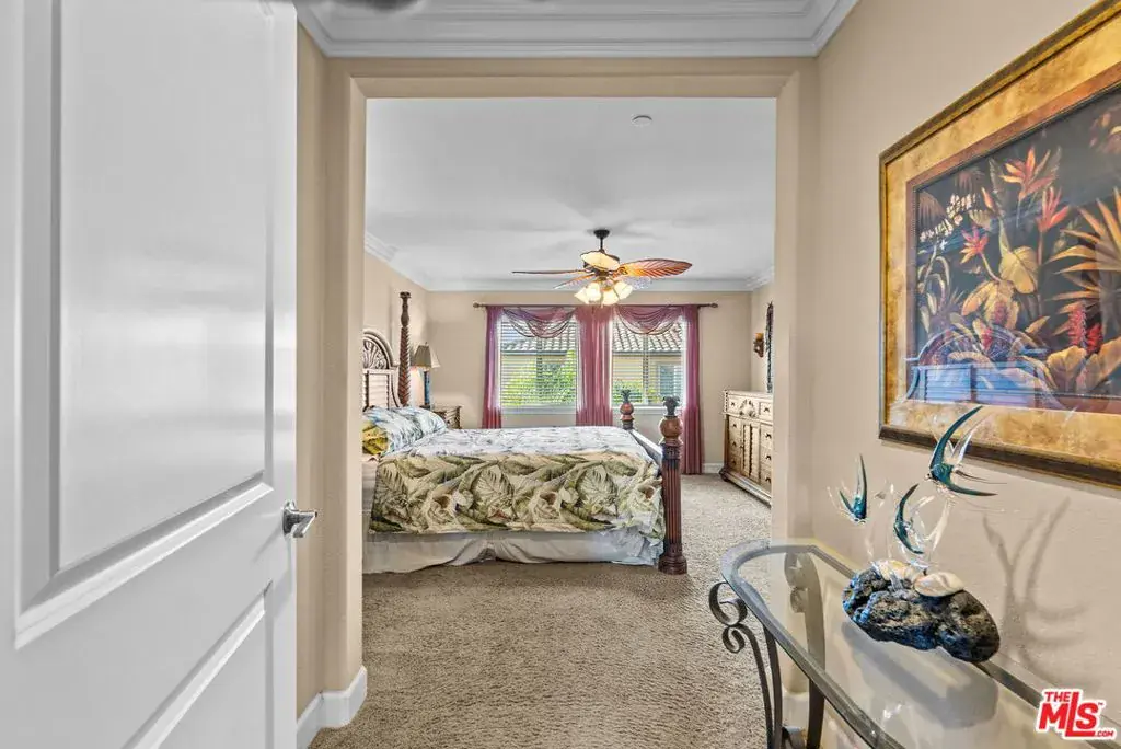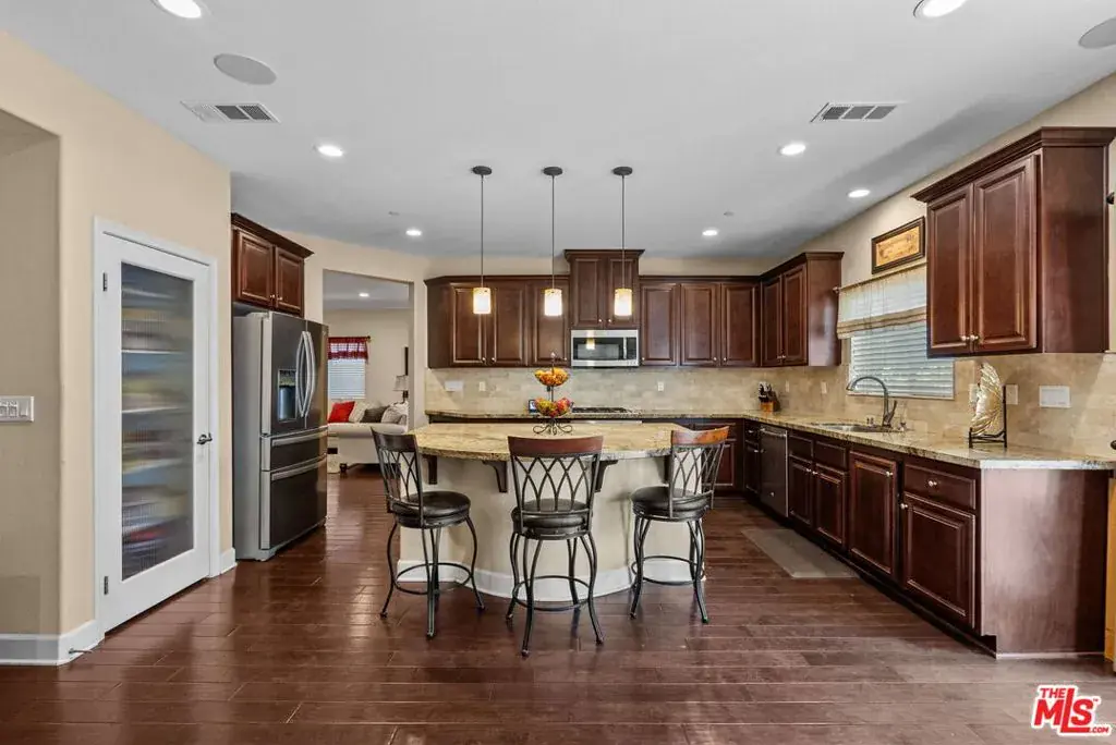Welcome home to Living Smart Homes in Moorpark Highlands, located in one of Moorpark’s most desirable master-planned communities. This charming two-story 4-bedroom, 2.5-bath home is surrounded by lush greens and beautiful mountain views. Step inside to a welcoming entry where high ceilings, crown molding, recessed lighting, rich wood floors, and natural sunlight set the tone. The space opens into an elegant formal living and dining area perfect for entertaining. The kitchen floor plan blends well to the family room, creating an ideal open-concept layout. The kitchen features rich cabinetry, granite countertops, custom tile backsplash, a large center island with bar seating, pendant lighting, stainless-steel appliances, and a modern touch-activated faucet for added convenience. The adjoining family room offers a comfortable gathering space with a sliding glass door to the backyard for effortless indoor-outdoor living. Additional features include direct access to the attached garage, central heating and air conditioning for year-round comfort, dual-pane windows for energy efficiency, ceiling fans and thoughtful finishes throughout. As you make your way upstairs, you arrive at a spacious landing. This versatile space connects all bedrooms, a full bathroom, and a large laundry room for added convenience. The primary suite serves as a private retreat, offering generous space, a walk-in closet, and an ensuite bathroom with dual vanities, a soaking tub, and a separate glass-enclosed shower, creating a spa-like atmosphere. Backyard highlights include stamped concrete, mature palms, a decorative water feature, an orange tree, and a built-in natural gas BBQ hookup for effortless outdoor entertaining. A side yard provides added versatility for pets or storage. The Moorpark Highlands community offers resort-style amenities including a pool, spa, scenic trails, and access to Mammoth Park, featuring 7.5 acres of play areas, multi-use fields, picnic spaces, and lighted tennis and sport courts. Conveniently located near shopping, dining, award-winning schools, and freeway access, this home is nestled in a highly desirable, family-friendly neighborhood.