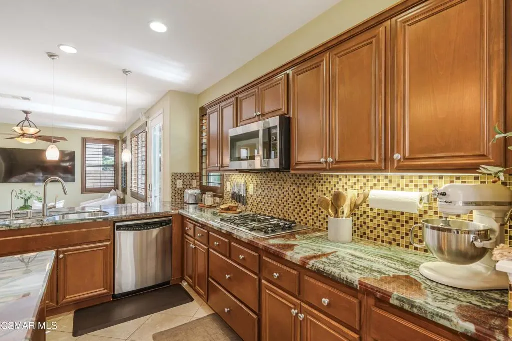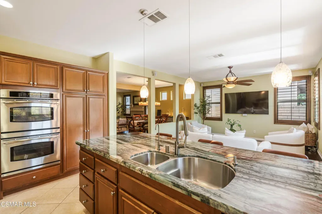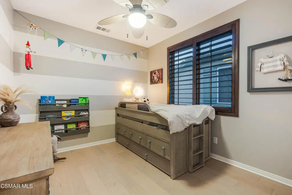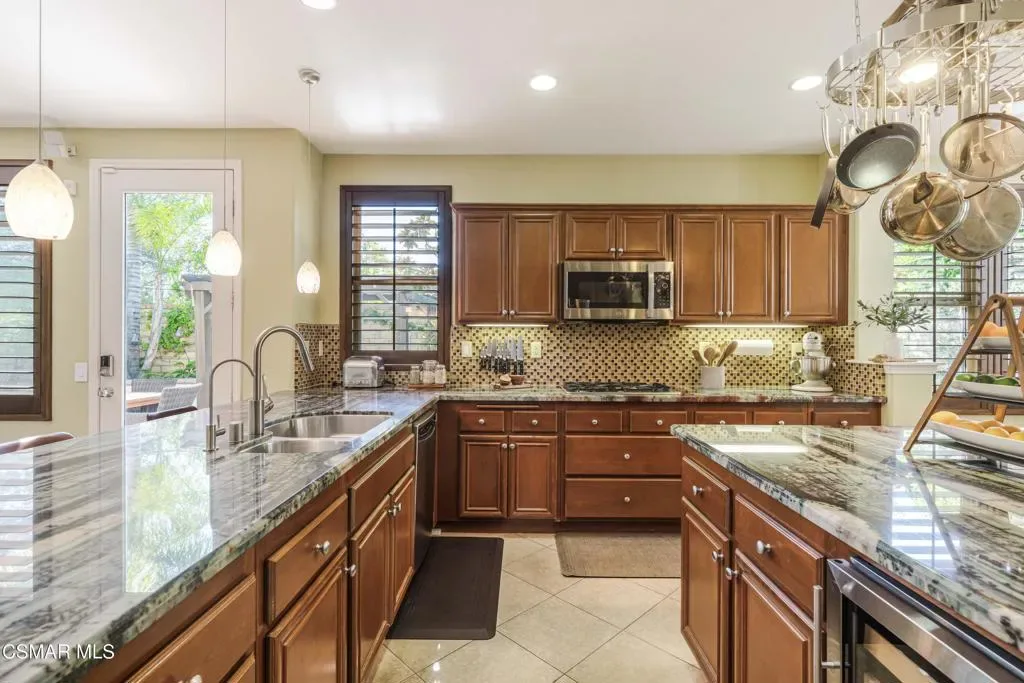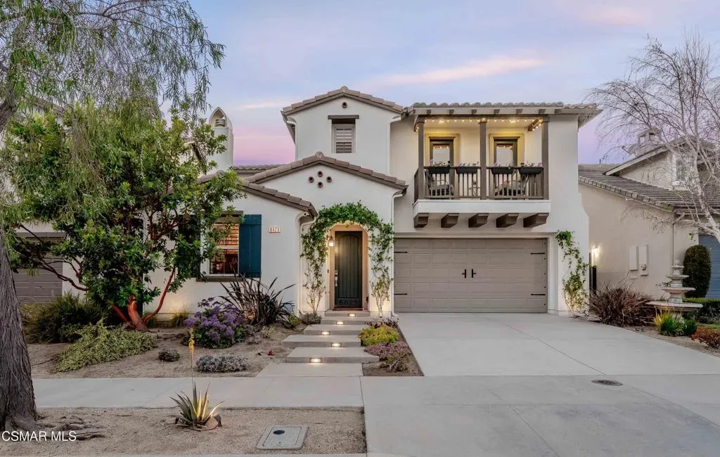This exquisite home located in the gated Moorpark Highlands cul-de-sac community delivers enhanced privacy, breathtaking views, and a sun-drenched backyard oasis, perfect for relaxed entertaining or quiet retreats. Step inside to discover a meticulously updated residence with cutting-edge technology and downstairs office/bedroom with custom double doors. The freshly repainted exterior and new exterior light fixtures create outstanding curb appeal, while hardwood floors, and custom 4.5 inch basswood plantation shutters stained to match, deliver sophisticated warmth and seamless flow. The chef-inspired kitchen is a true showstopper, featuring stunning Quartzite countertops, an upgraded sink and faucets, elegant backsplash, a convenient pot hanger, custom light fixtures, and a reverse osmosis system servicing the sink and fridge. Prepare gourmet meals with ease using the impressive array of three GE Profile ovens (including one convection, one regular, and a 240V convection oven/microwave combo Adventium). Energy-efficient whole-house warm LED lighting, and automated bathroom light sensors enhance everyday comfort. The large primary bedroom has a sitting area which could be a gym/office/yoga retreat. The primary bath offers dual vanities, beautiful wood cabinets, walk-in closet, sunken tub, and walk-in shower. The three guest bedrooms are well appointed with custom paint/decals and the front bedrooms share a balcony! Upstairs laundry conveniently located with storage. Embracing modern sustainability and smart living, this home boasts PAID Tesla Solar for the entire house, a Tesla Powerwall in the garage, and two EV charging outlets for effortless electric vehicle ownership. Additionally, the 3-car tandem garage offers flexibility for parking or utilizing the additional space for storage, a home gym, or more! A whole-home water softener, low-flow showerheads and faucet aerators promote efficiency, while the internet-connected Rachio smart sprinkler system with climate prediction optimizes water use. Dual HVAC systems ensure zoned comfort on each floor. Seamless Alexa-enabled whole-home smart automation integrates thermostat, sprinklers, lights, door and garage door control, complemented by a Z-Wave compatible smart door lock and video doorbell. A fully monitored alarm system includes intruder alerts, integrated smoke/fire detection, camera wiring, and door sensors for peace of mind. LAN wiring throughout supports robust connectivity. Additional highlights include a custom-built stamped concrete patio, custom fire pit, and custom modern lighted stairs in the front yard. Enjoy a cozy backyard oasis with outdoor kitchen, a stainless-steel, maintenance-free patio cover, and low-maintenance landscaping, including a drought-tolerant front yard and artificial turf in the rear garden with deodorizer that is ideal for babies and pets while reducing odors for a fresher yard. An array of fruit trees and plants cover the exterior: Magnolia Trees, Champaca Tree (rare), Queen Palms, Phoenix Robolini, Meyer Lemon Tree, Orange Tree, Lime Tree, Apple Tree (varieties), Passion Fruit, Blackberries, Dragon Fruit, Blueberries (varieties), Pineapple Guava Tree, Lavender, Aloe Vera and Rosemary. This turnkey smart home combines luxurious finishes, private entertaining, and effortless automation. Community features include: hiking trails, 2 pools, playground, greenbelts, stroll or bike to Mammoth Highlands Park and more!