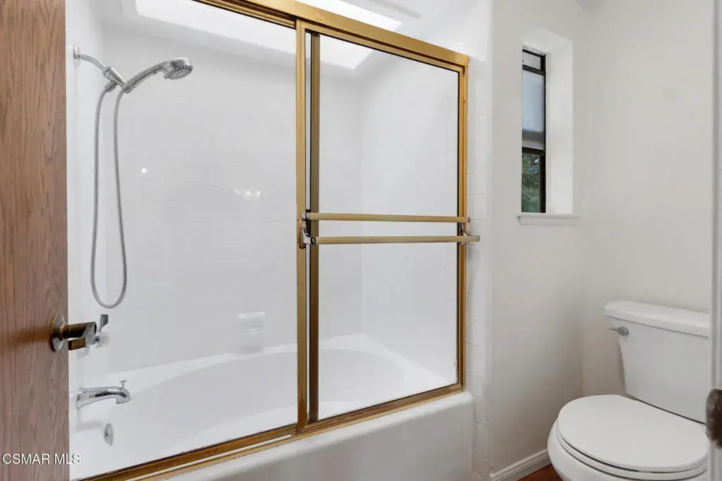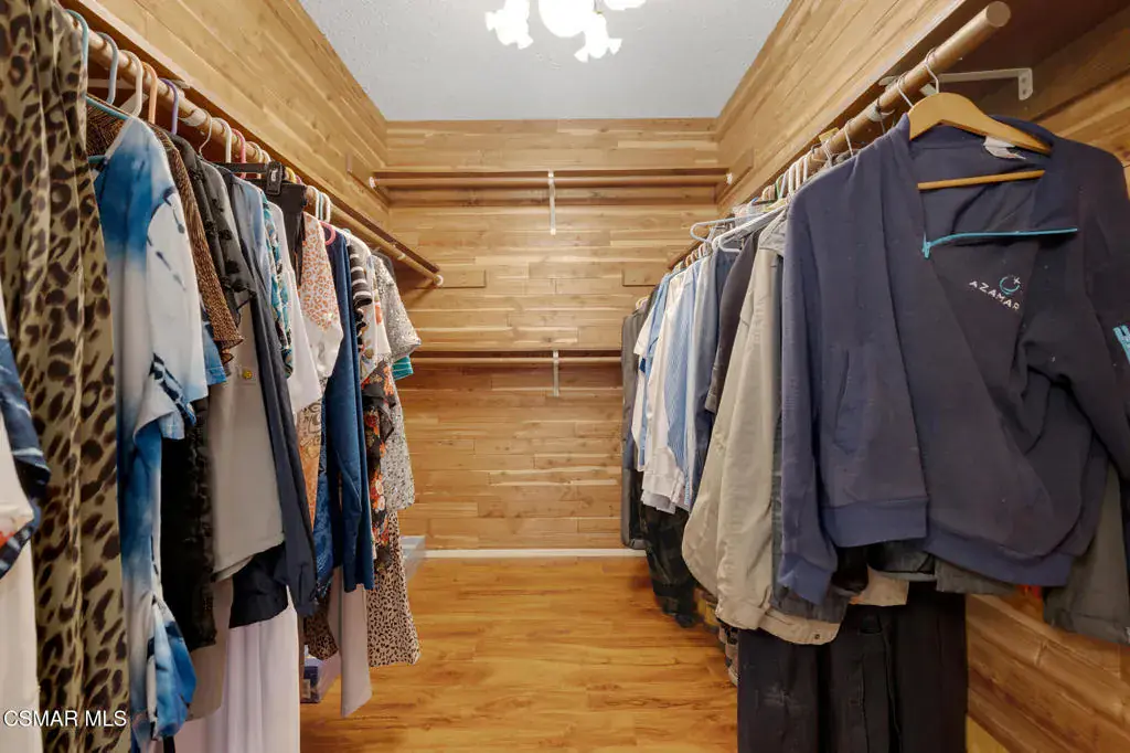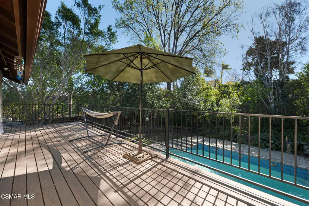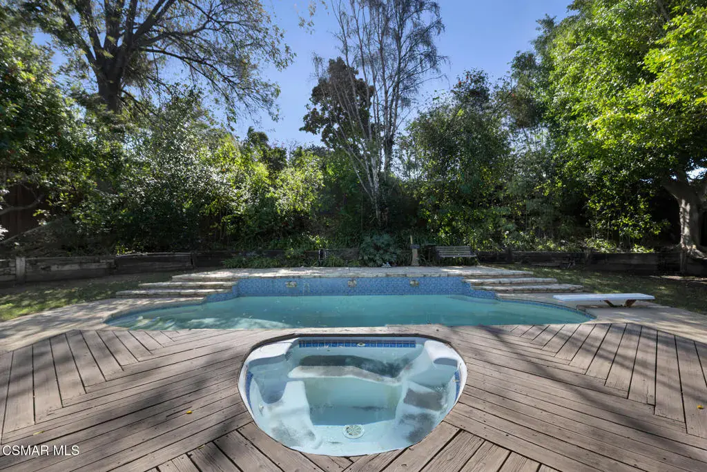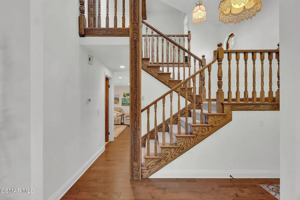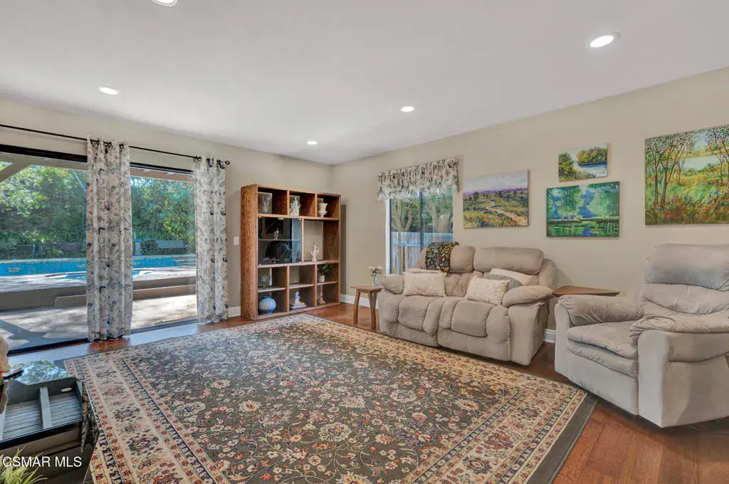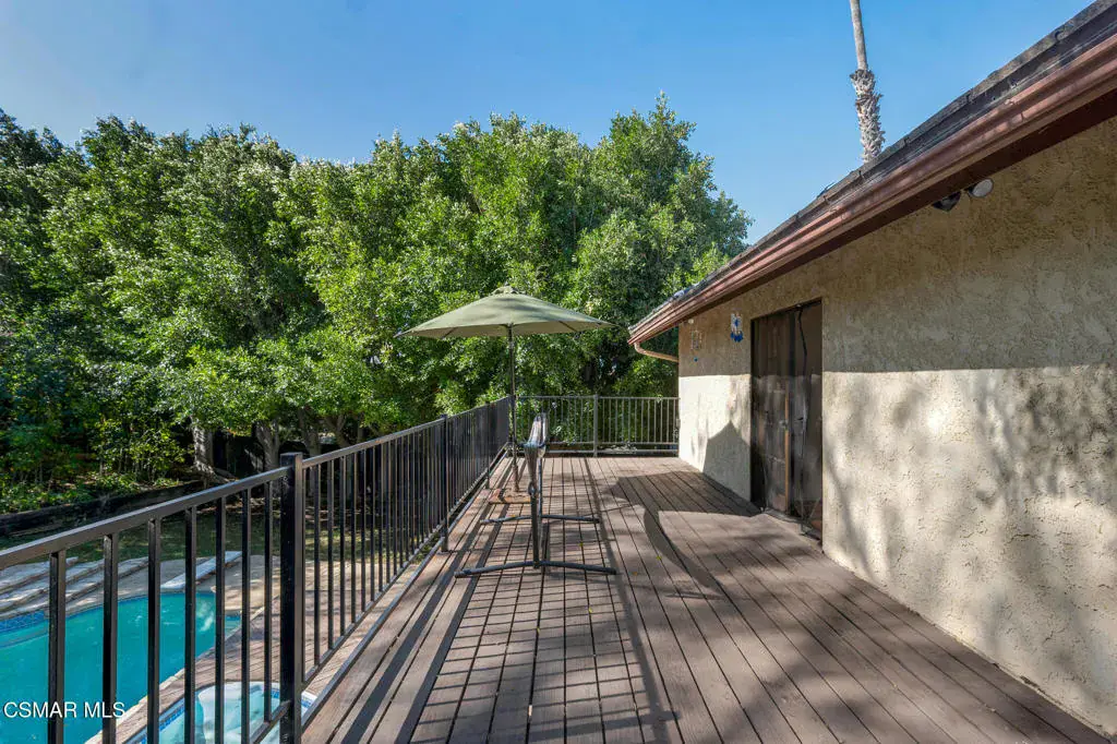 Set within the established Rejada Ranch tract in the Peach Hill community of Moorpark, this two-story home blends classic architectural character with everyday functionality on a 10,890 sq. ft. lot with no HOA. The property offers 4 bedrooms, 2.5 bathrooms, 1,975 sq. ft. of living space, a pool and spa, and a 3-car garage, providing comfortable interior living and inviting outdoor space. Curb appeal begins with a grassy front yard accented by mature ivy-lined planters, river rock detailing, and wood-beam architectural elements that create a welcoming first impression. Inside, real wood flooring spans the lower level, complemented by vaulted ceilings with exposed wood beams and abundant natural light from large windows and skylights. The living and dining areas connect seamlessly, anchored by a river rock fireplace with wood mantle and a dining space highlighted by a skylight and chandelier–well suited for both daily living and gatherings. The kitchen features granite countertops, decorative tile backsplash, off-white soft-close cabinetry with pull-outs, a large farm-style sink beneath a window overlooking the backyard, and a walk-in pantry with a frosted glass door. Recessed lighting within a coffered ceiling adds both function and visual interest. Just beyond, the step-down family room offers an additional space to relax or entertain, with recessed lighting, a granite counter detail, and a sliding glass door that opens directly to the backyard, creating an easy indoor-outdoor connection to the pool and spa area. Upstairs, bedrooms are thoughtfully arranged. Secondary bedrooms offer mirrored closet doors and ceiling fans with lights, with two bedrooms opening through French doors to a spacious shared deck/balcony. The primary suite serves as a comfortable retreat with a window seat, ceiling fan with light, a cedar-lined walk-in closet, and an ensuite bathroom featuring quartz countertops, a dual-sink corner vanity with storage, modern lighting, round mirrors, and a tub/shower combination with glass enclosure and skylight. Additional highlights include neutral paint colors throughout, a downstairs powder room, a floor safe located downstairs, and a 3-car garage with roll-up doors featuring windows, laundry hookups, and built-in storage shelving. Wood side gates provide backyard access. Conveniently located near Peach Hill Park, shopping, dining, and city amenities, this home offers space, character, and a well-rounded lifestyle within the city of Moorpark.
