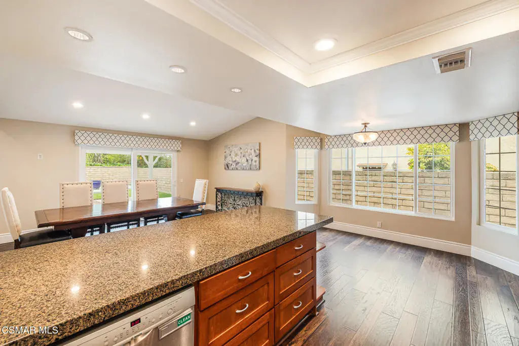 Welcome to your quiet sanctuary in the Steeple Hill community of Moorpark. This beautifully updated single story home offers more than 1,600 square feet of thoughtfully designed living space on a generous 7,504 square foot lot. With 3 bedrooms and 2 baths, this residence blends timeless style with modern comfort.The exterior showcases a fresh plaster finish and stone accents that evoke the warm charm of Mediterranean style homes. Inside you will find gorgeous wood like flooring and vaulted ceilings in both the living room and the primary suite, creating a bright and open feel throughout. The kitchen has been completely updated with custom cabinetry, granite counters, and a large serving peninsula that makes the perfect buffet for entertaining guests in the expansive dining room. Both bathrooms have been fully remodeled with luxury touches including designer tile with product niches and heated towel bars for everyday comfort.Energy efficiency is key with fully paid-off solar panels providing reliable performance and lower utility costs. The landscaping is thoughtfully designed with drought tolerant plantings and artificial turf that is easy to maintain and enhances the curb appeal of this charming home. The garage is truly a standout feature. It is insulated and heated with a tile floor that is perfect for auto storage or creating the ultimate workshop space that will make you the envy of the neighborhood. The lovely yard offers plenty of room for a pool, vegetable garden, play area, or whatever your heart desires. With so much happening in the Moorpark community, and a lifestyle that continues to grow and improve, now is the perfect time to secure your own piece of paradise.