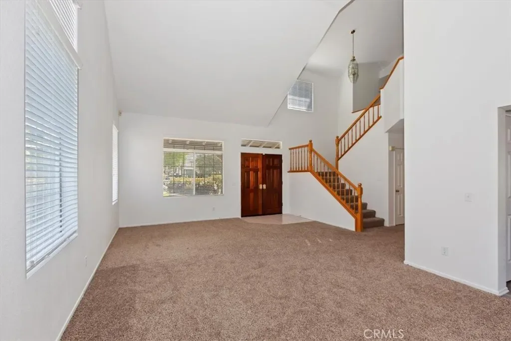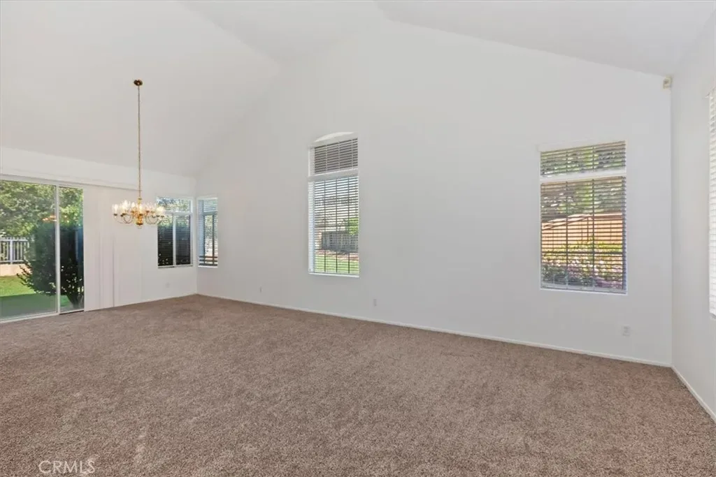Step through the impressive double door entry into a spacious formal living and dining area featuring soaring vaulted ceilings and abundant natural light. The formal dining room opens to the backyard through a large sliding glass door, creating a seamless indoor-outdoor flow.