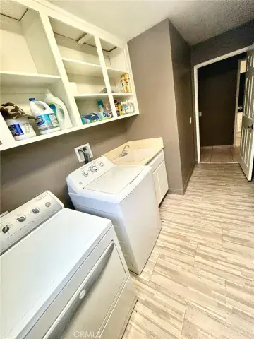 Interior highlights include high ceilings, a grand staircase entry, tile flooring throughout the main living areas, and multiple living spaces including a formal living room and a family room with fireplace. The open-concept kitchen provides ample cabinetry and functional layout. A dedicated indoor laundry room with storage and sink adds convenience.