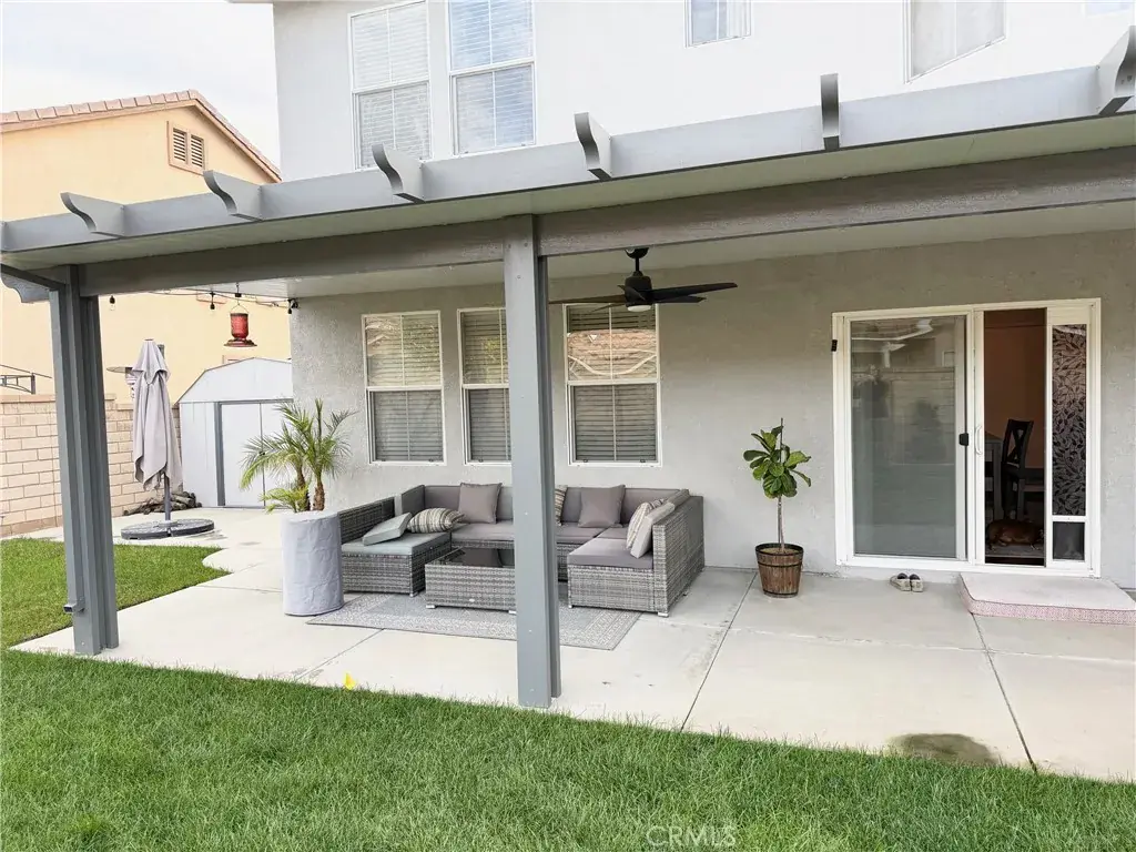 The backyard includes a covered patio with a ceiling fan and Wiz string lighting, a grassy area, and provides a comfortable outdoor living area suitable for entertaining and relaxation. There is also a Shed for outdoor storage.