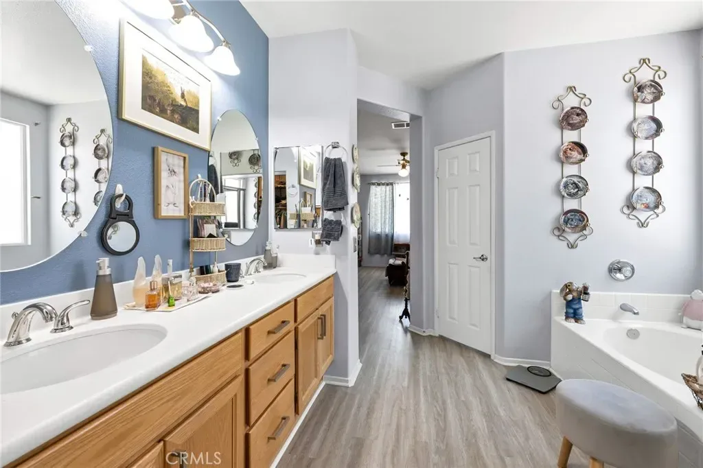 The primary suite is generously sized and includes a large walk-in closet. The en-suite bathroom features dual sinks, a soaking tub, and a separate shower, creating a spa-like experience.
