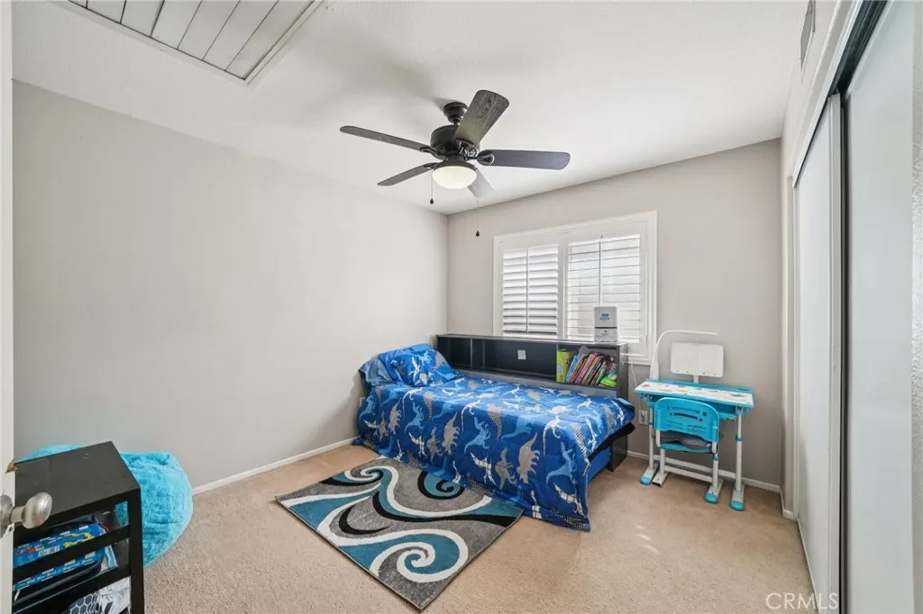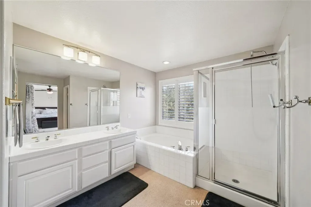 The spacious primary bedroom includes an ensuite bathroom with a walk-in shower and soaking tub. A sliding glass door provides access to the backyard, allowing for easy indoor-outdoor living.