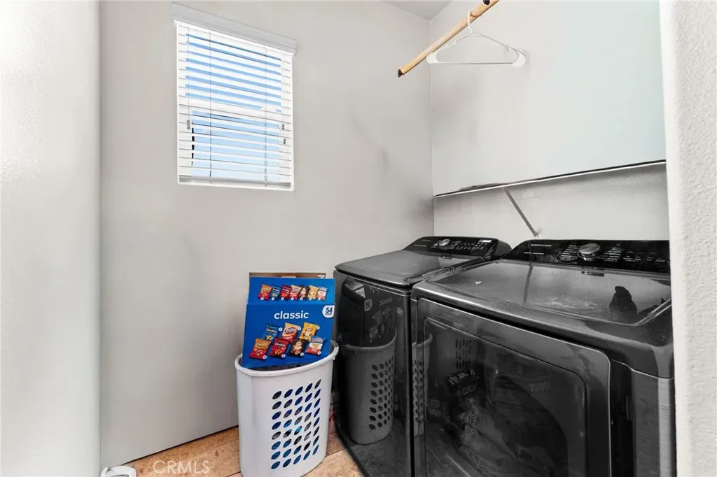 The kitchen comes equipped with a stainless steel 5-burner stove, microwave hood/vent, dishwasher, and a refrigerator. White tile countertops, shaker-style cabinets, and a pantry for extra storage. A dedicated laundry room with built-in shelving. A convenient downstairs bathroom adds to the home’s functionality.