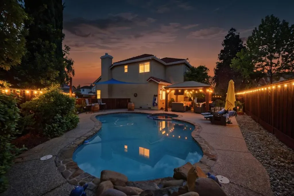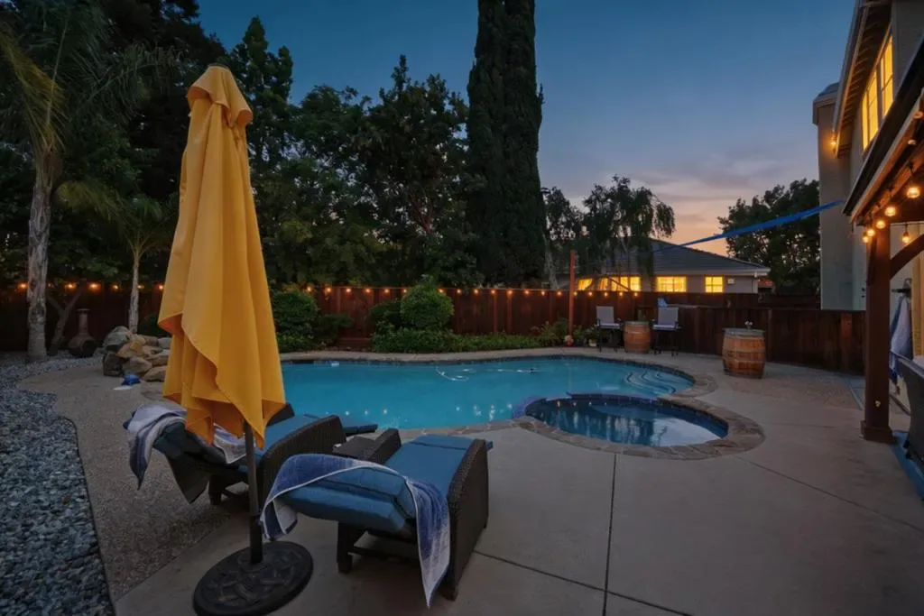 Beautifully maintained and move-in ready, this spacious 5-bedroom, 3-full-bath home is tucked at the end of a quiet cul-de-sac in the desirable Shadow Brook Estates Community. A well designed floor plan features generous living spaces, vaulted ceilings in the entry, and an archway leading into the dining area. The newly remodeled kitchen is plumbed for gas, while modern waterproof laminate flooring flows throughout the downstairs, adding durability and a clean contemporary feel. Two fireplaces add warmth and charm to the main living spaces, creating a comfortable setting for everyday living and entertaining. The layout offers generational living potential with a downstairs bedroom and full bath. Step outside to your private backyard retreat featuring a gazebo, inground pool and spa, and a spacious patio and large lawn area perfect for relaxing or hosting gatherings. The pool has been recently resurfaced, and a security fence provides added peace of mind. The large yard offers plenty of room for pets to roam and children to play. Additional highlights include a 3 car garage and a prime location within walking distance to downtown combining convenience with a true neighborhood feel. This home offers the perfect blend of indoor comfort and outdoor enjoyment.