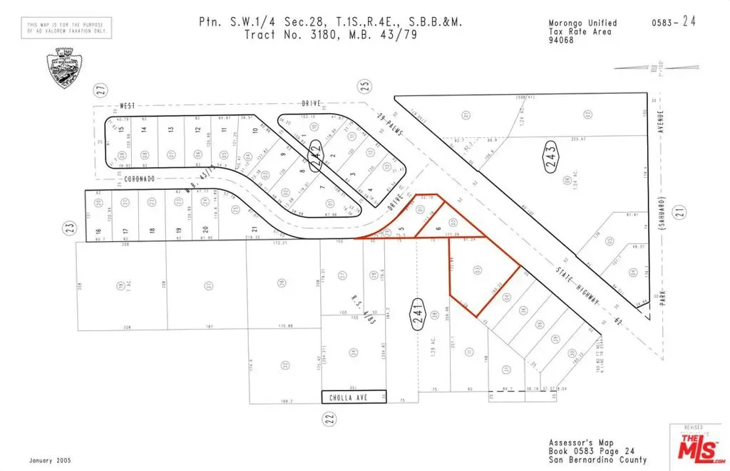 APN: 0583-241-01, 02, 03. THREE LOTS SOLD TOGETHER! Combined lot size is approximately 43,055 SF (about 1 acre) with MV/CG zoning, offering a great opportunity to develop a corner commercial property in the heart of Morongo Valley. This flat parcel features mountain views and has utilities nearby. No reports or survey are available. Conveniently located near Twentynine Palms Hwy, the property is surrounded by local shops, restaurants, and other amenities.