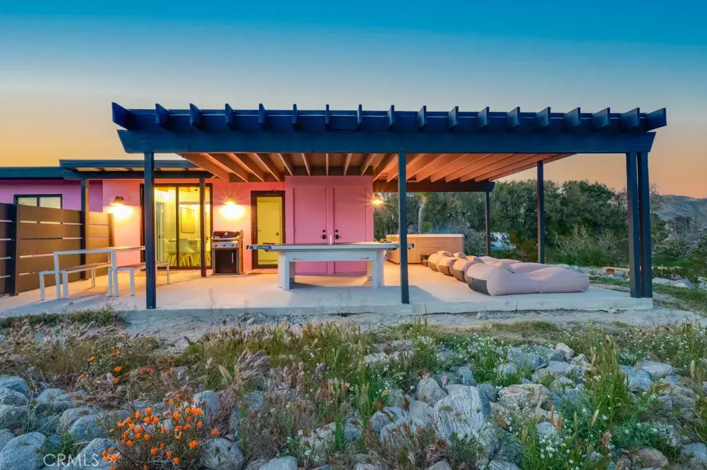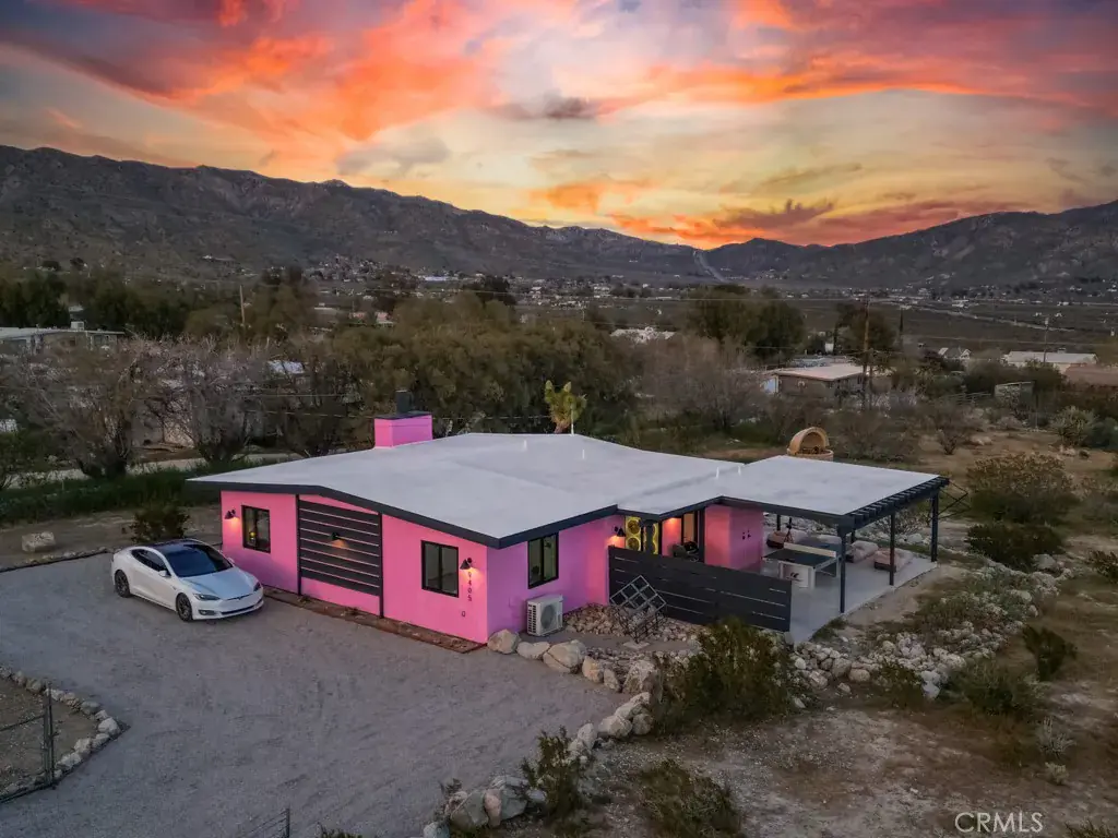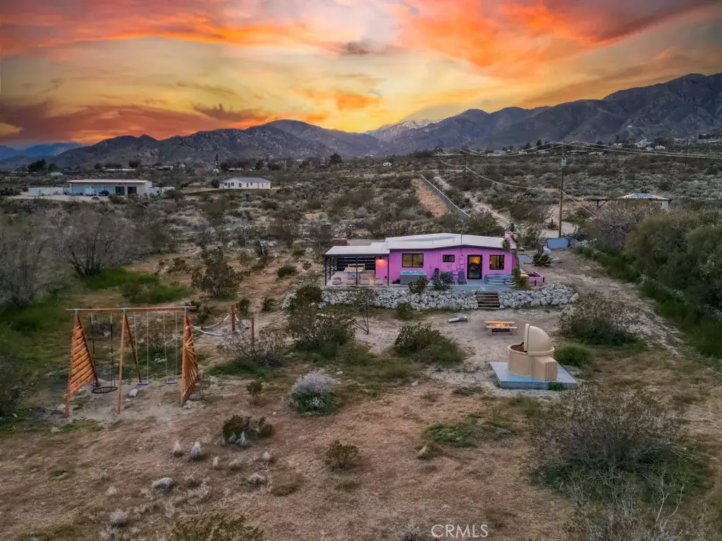 Pink Galaxy holds strong chromatic themes, original art, and is a star grazers dream in a special paradise. Halfway between Joshua Tree and Palm Springs exists a special medium between stars, city, alpine, and an always oasis climate. Magically cooler in summer and warmer in winter than its neighboring areas, large fruit trees grow next to stark Joshua Trees in this special zone of the desert due to its high water table, subterranean rivers, natural springs, creeks and marshes.