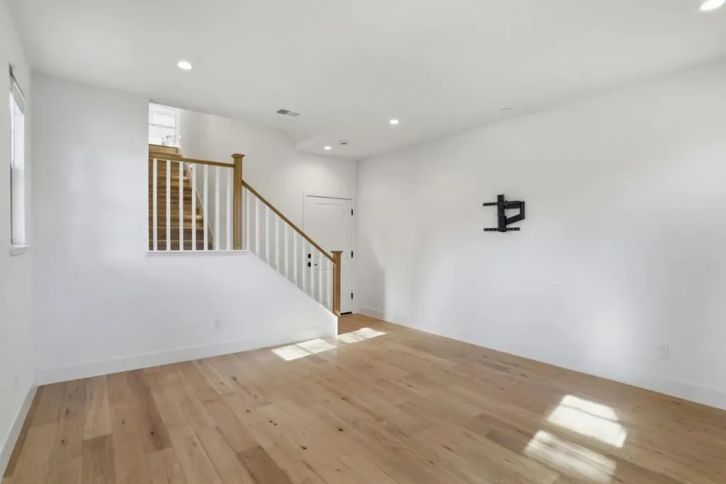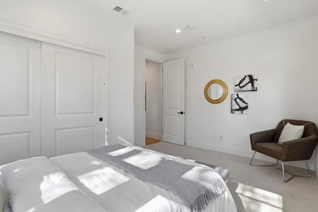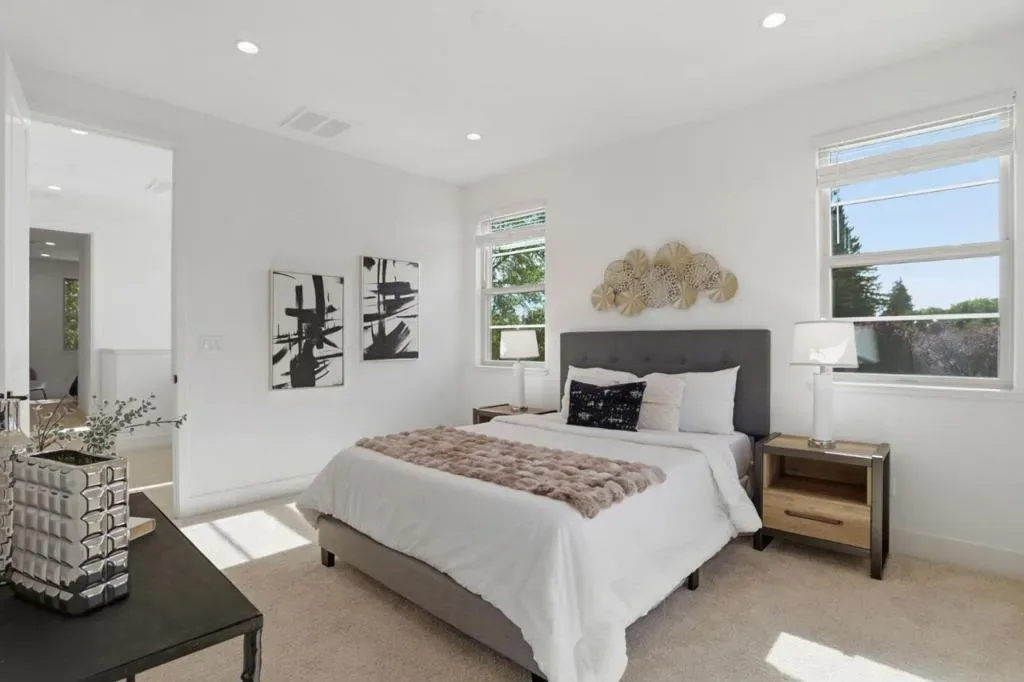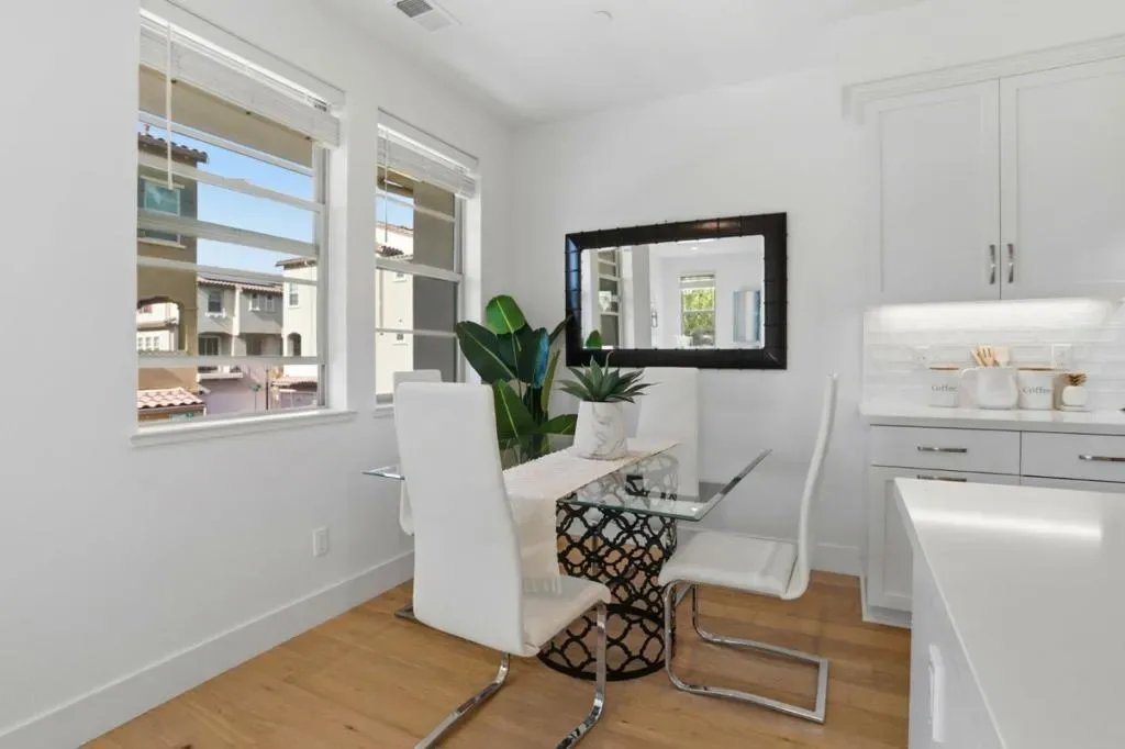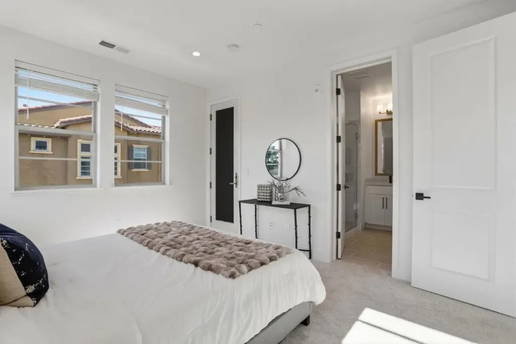 Presenting a contemporary end-unit townhouse featuring three bedrooms and three bathrooms with 1821sqft, constructed by SummerHill Homes in 2024. The entry level features a large den suitable for a gym, office, or living space. The second floor offers a spacious open-concept design that seamlessly links the living room, dining area, and kitchen, which includes a large island, ample counter space, and an upgraded backsplash. There’s also a guest room with a full bathroom on this level. Upstairs, the primary suite has a walk-in closet and a bathroom with dual vanities, while a second bedroom features its own ensuite full bath. This home features fully owned solar panels and a 220V EV charging outlet in a two-car, side-by-side garage. It also comes with a washer and dryer, refrigerator, EV cable, and TV wall mountall included. Desirable Verano community featuring a central park for BBQs and gatherings. Centrally located in Mountain View near top employers like Google, LinkedIn, Microsoft, and NASA. Close to downtown restaurants, farmers market, VTA/Caltrain, and highways 101, 280, and 85. Must see!