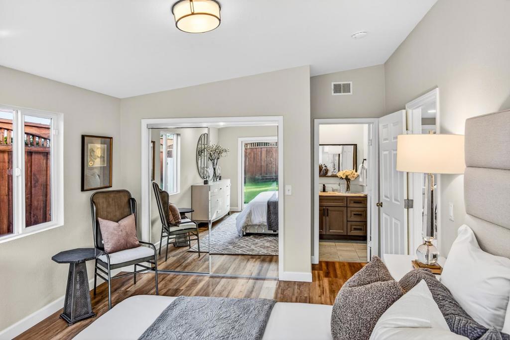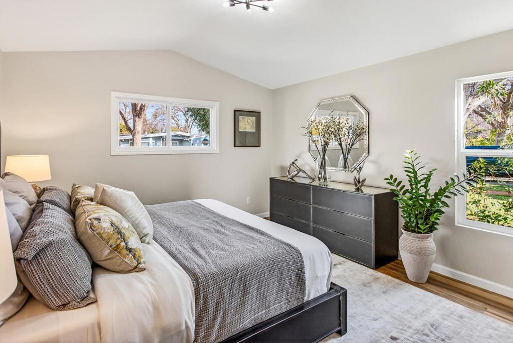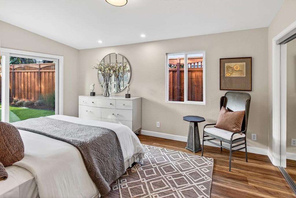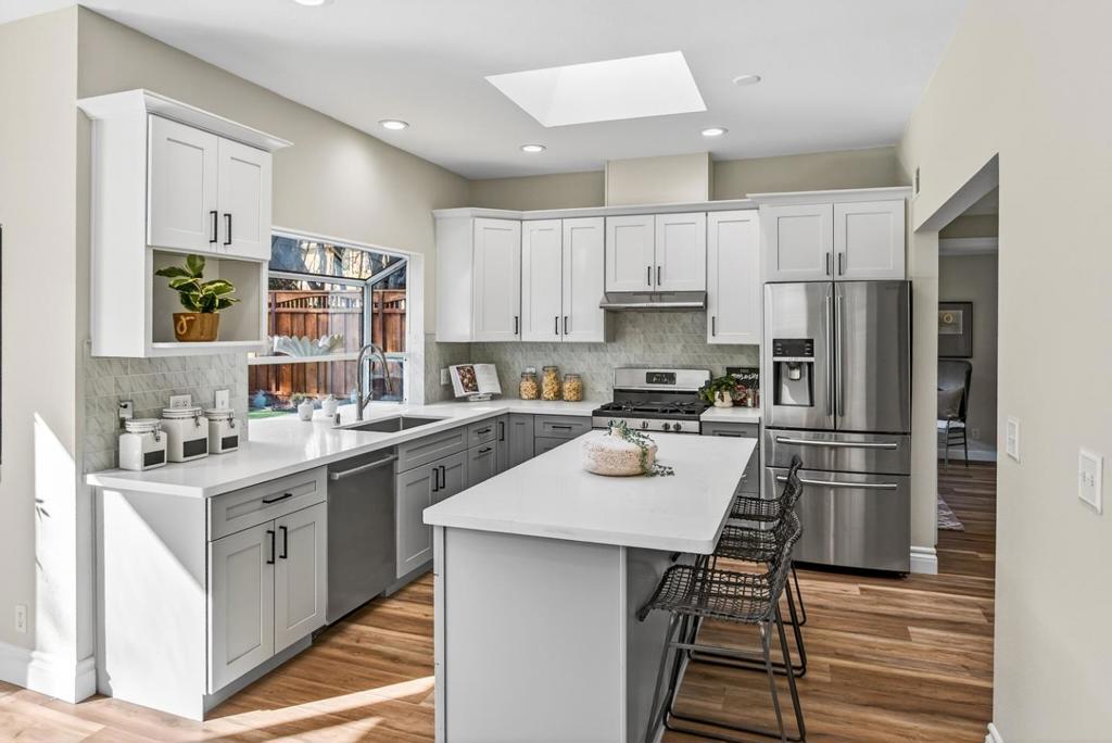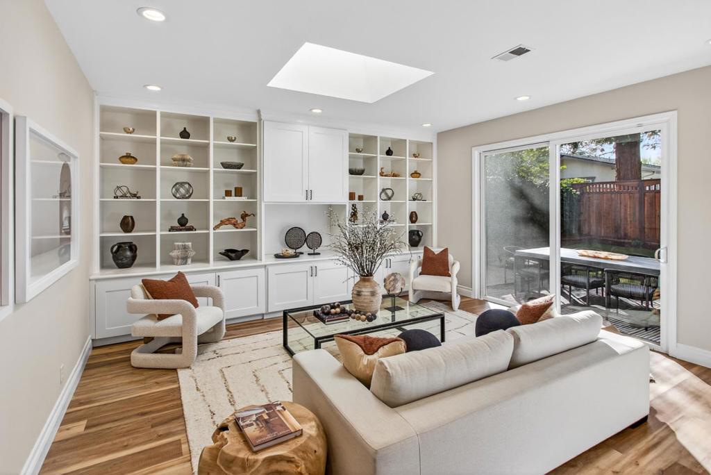 Beautifully remodeled and fully turn-key, this light-filled home offers a sleek, modern aesthetic and an exceptionally livable floor plan. Wide plank engineered wood floors extend throughout, while numerous skylights and expansive windows flood the interior with natural light. The main living spaces run seamlessly down the center of the home, creating an easy flow between the living room, dining area, kitchen, and family room. Three bedrooms are thoughtfully grouped on one side with access to a full bath, while the privately situated primary suite enjoys its own peaceful wing. The gourmet kitchen features white quartz counters, a large skylight, two-tone cabinetry, stainless steel appliances, and an oversized center island, opening directly to the family room with custom built-ins and a wide sliding door to the backyard. Outdoors, the landscaped yard offers paver patios, level lawn, a mature lemon tree with swings, and space to relax, entertain, or play. Additional highlights include an attached one-car garage with an EV charger, extended driveway parking, and an idyllic neighborhood setting close to parks, schools, downtown amenities, and major tech campuses including Google.