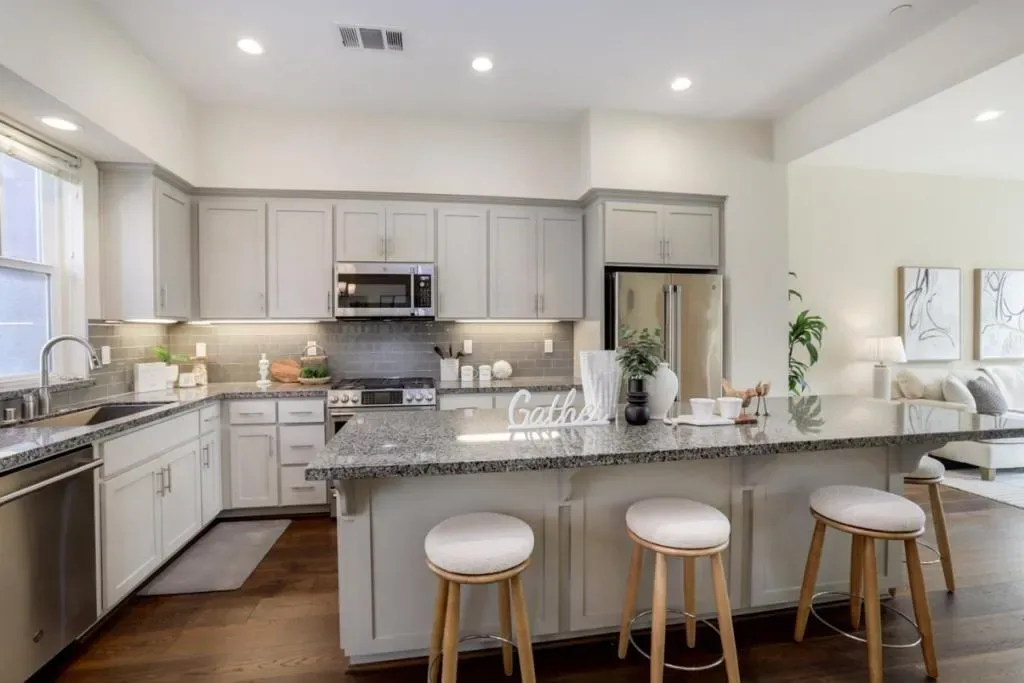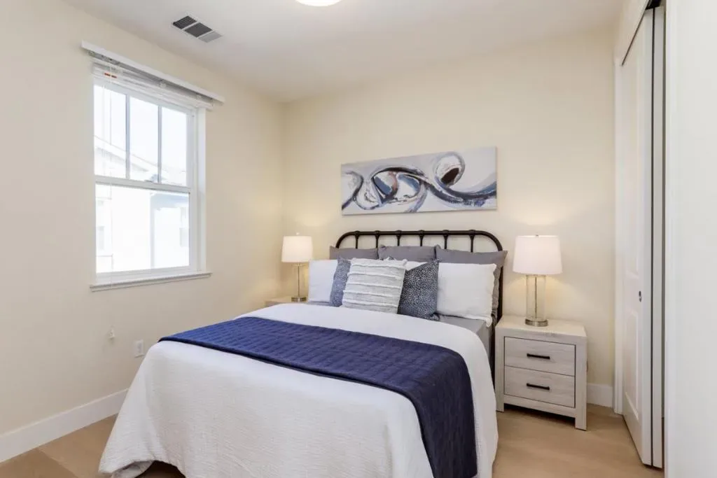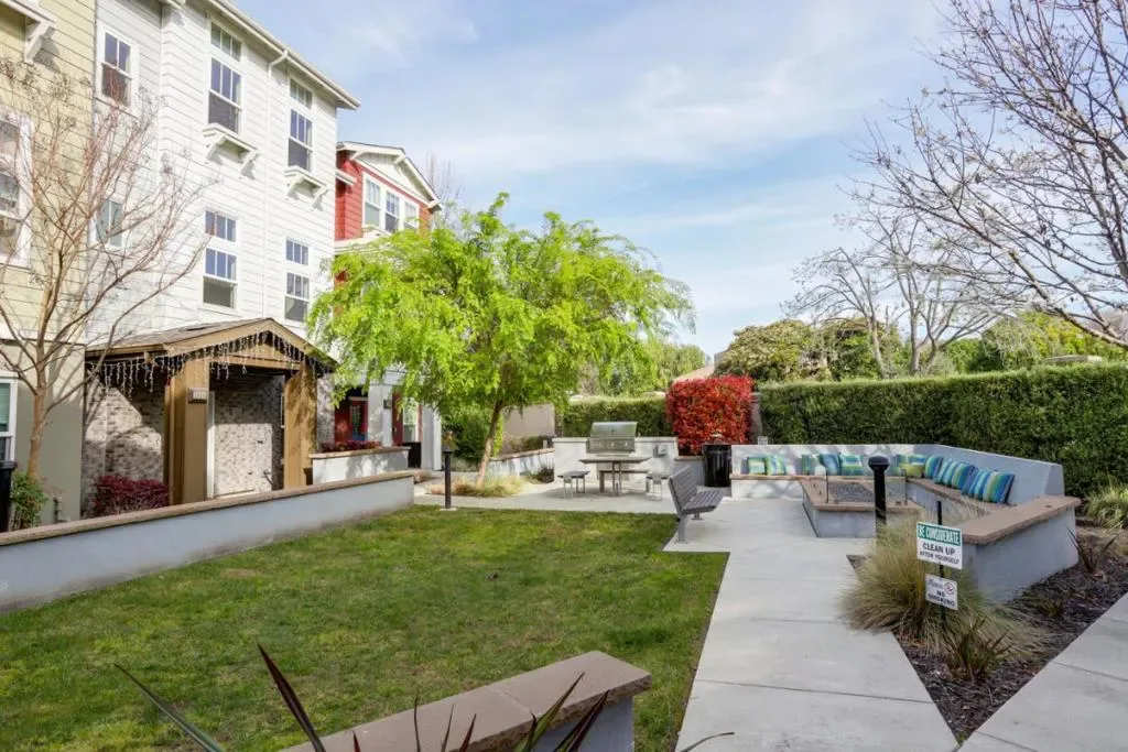 Refined contemporary living in one of Mountain Views most desirable enclaves. Nine years new townhome blends modern sophistication with everyday comfort. Bathed in natural light, the main living level showcases a seamless open-concept design with soaring ceilings, wide-plank hardwood flooring, and expansive windows that frame the space beautifully. At the heart of the home, the designer kitchen impresses with a striking quartz waterfall island, premium cooktop, and sleek custom cabinetryperfectly suited for both intimate gatherings and elevated entertaining. On the entry level, a versatile flex space with a powder room provides the ideal setting for a private office, guest quarters, or optional fourth bedroom.Thoughtfully appointed throughout, the home includes A/C control, recessed lighting, and an attached two-car garage equipped with a tankless water heater. Residents enjoy access to curated community amenities, including outdoor BBQ stations, a fire pit, and beautifully landscaped grounds. Perfectly positioned near parks, upscale dining, boutique shopping, and scenic trails, with convenient access to Downtown Mountain View and major commute routes including Highways 101 and 85. Located within the highly acclaimed Los Altos High School district.