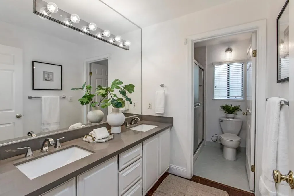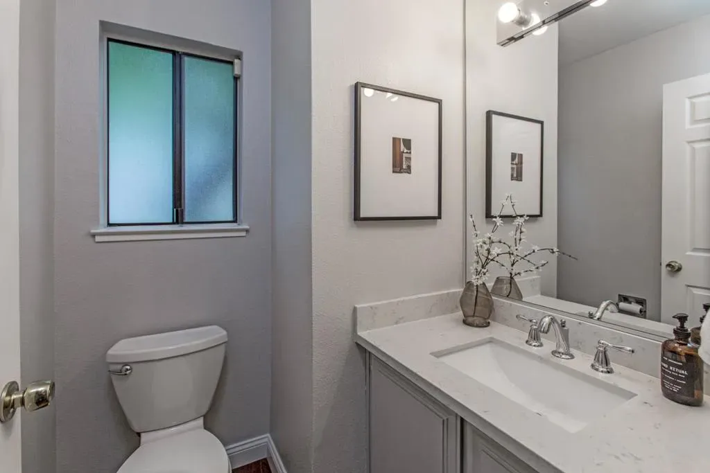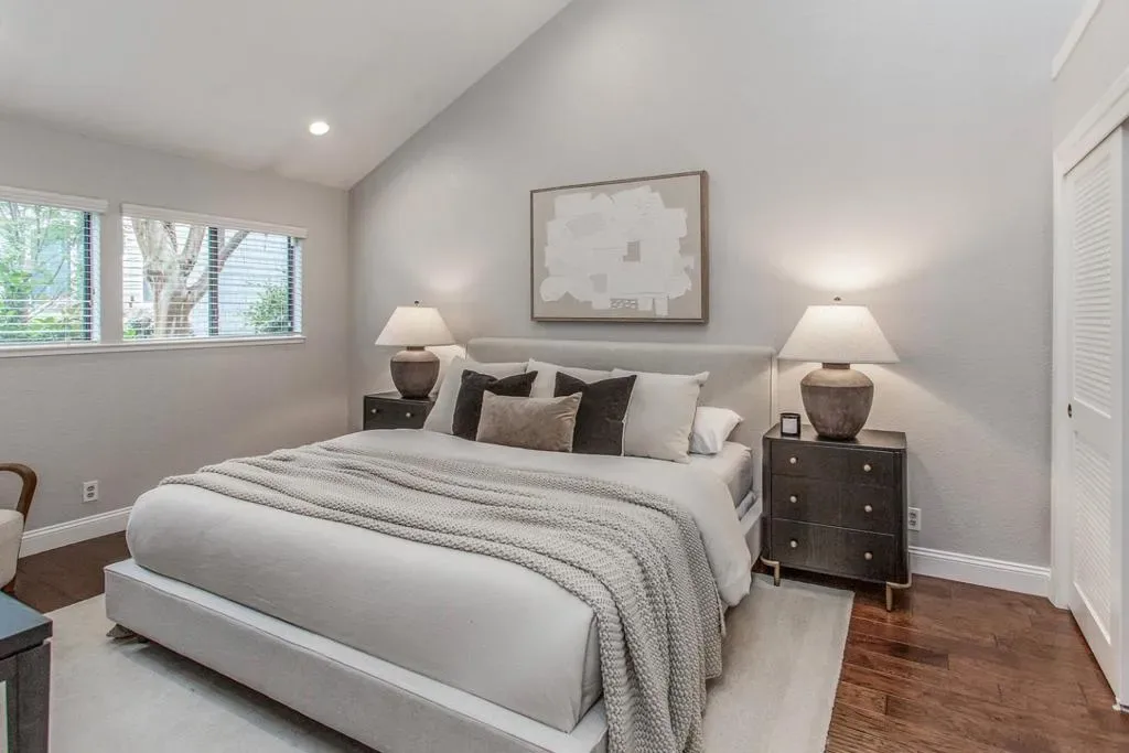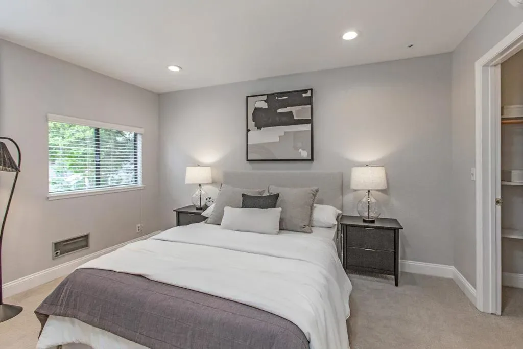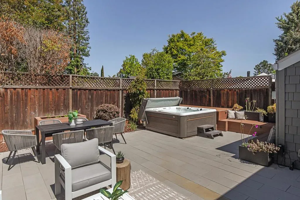 Enjoy lofty ceilings, a functional floor plan, numerous skylights, and a light and bright atmosphere in this updated two-story townhome. The living room has soaring vaulted ceilings, a focal-point fireplace, and tall windows overlooking the yard. Sitting between the living room and the kitchen for easy entertaining, the dining room is illuminated by large windows. The kitchen features abundant cabinetry, stunning white quartz countertops, elevated bar seating, and a large pantry. The primary suite features high ceilings, three large closets, and a beautifully updated en suite bath. Upstairs, you have two well-sized bedrooms with easy access to the hall bathroom. For alfresco enjoyment, you have a large concrete paver stone patio and hot tub surrounded by mature plantings, a raised garden bed, and sleek planters. Detached one-car garage, plus ample guest parking. Located in the desirable Los Arboles community with a pool and well-maintained grounds. Steps to Gemello Park, and close to shopping, dining, commute routes, and both downtown Mountain View and Los Altos.