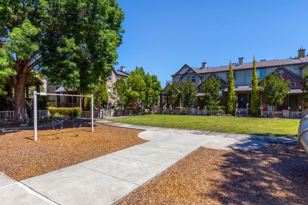 Well-positioned within the Ryland Towne Court community, this stylish three-bedroom, three-bath townhome offers exceptional privacy with no neighbors directly in front or behind, only one shared wall, and views of the greenbelt, playground, and Western Hills. A gated front courtyard and covered entry lead to a tiled foyer with high ceilings, while the lower level features a flexible bedroom or office, full bath, and laundry closet with built-in cabinetry. Upstairs, the light-filled main living areas feature wood floors, a spacious living room with a wall of windows, and a glass door opening to a rear-facing balcony. The kitchen is well-appointed with granite countertops, full-height backsplashes, rich wood cabinetry, tall pantry storage, and quality appliances, and flows seamlessly into the open dining area. The primary suite enjoys park views, a walk-in closet, and an en suite bath with marble finishes and a separate commode room. Enjoy beautifully maintained grounds with a large lawn area just outside your front door, playground, picnic space, car wash area, and private gated access to nearby Rengstorff Park with its new swim complex and Magical Bridge playground. Steps from San Antonio Center, Caltrain, and close to downtown Mountain View, commute routes, and tech employers.
