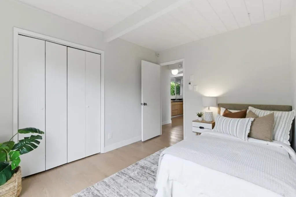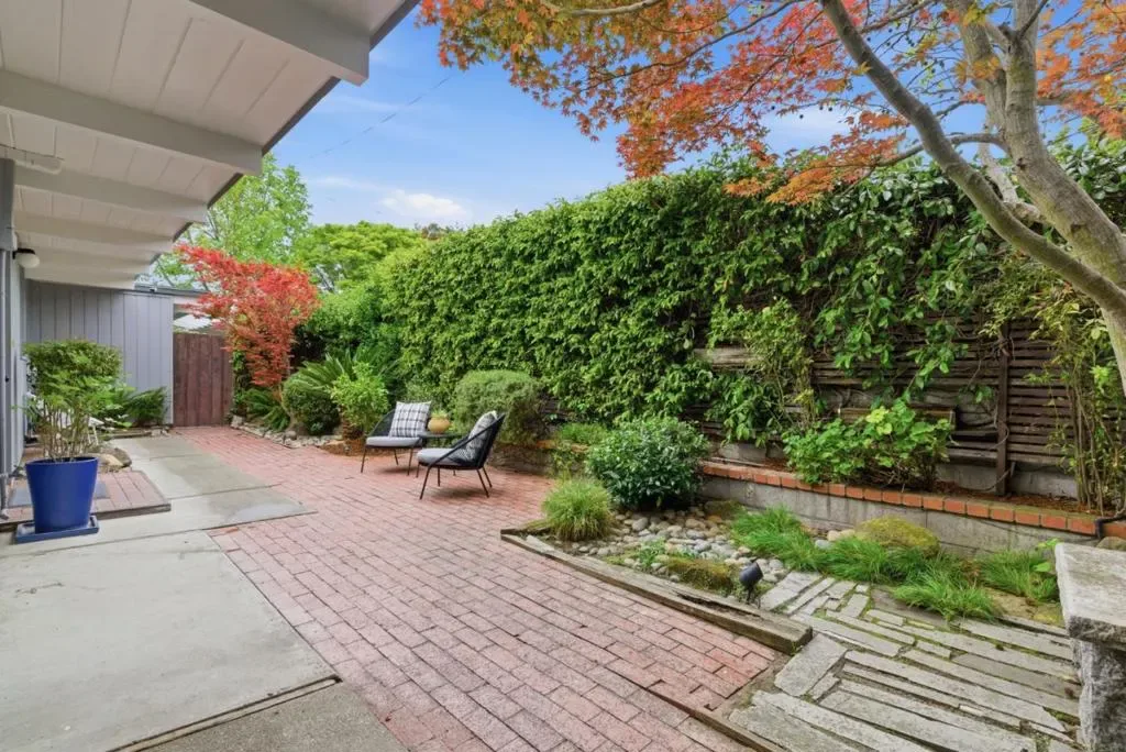 This charming Monta Loma Eichler embodies a blend of classic features such as open beam ceilings and globe lighting with many modern upgrades such as double pane windows, mini split systems, 200amp electrical panel, and PVC roofing. Enter through a private gated side courtyard. Inside a bright open space creates a tranquil flow between the kitchen, living and eating areas. Wall-to-wall panels of glass flank a painted brick wood burning fireplace. The kitchen has refinished Oak cabinetry, eating peninsula, new electric range and stainless steel refrigerator with large window overlooking the side courtyard. The primary bedroom features an ensuite bath with new tub and subway tile surround, new wood vanity, as well as its own sliding door access to the yard. In addition there are two well appointed bedrooms with sliding doors from each to the yard, and a hall bathroom with a new vanity, mirror and light fixture. Half the garage has been converted to an office/family room with built-in bookshelves. Beautifully landscaped yards that wrap around the property with lawn, pond, seating areas on both sides. Walk to Monta Loma Elementary, Thaddeus Park. Less than 2 mi to Googleplex, San Antonio Shopping Center,, Rengstorff Park, Shoreline Park and Baylands Nature Preserve trails.
