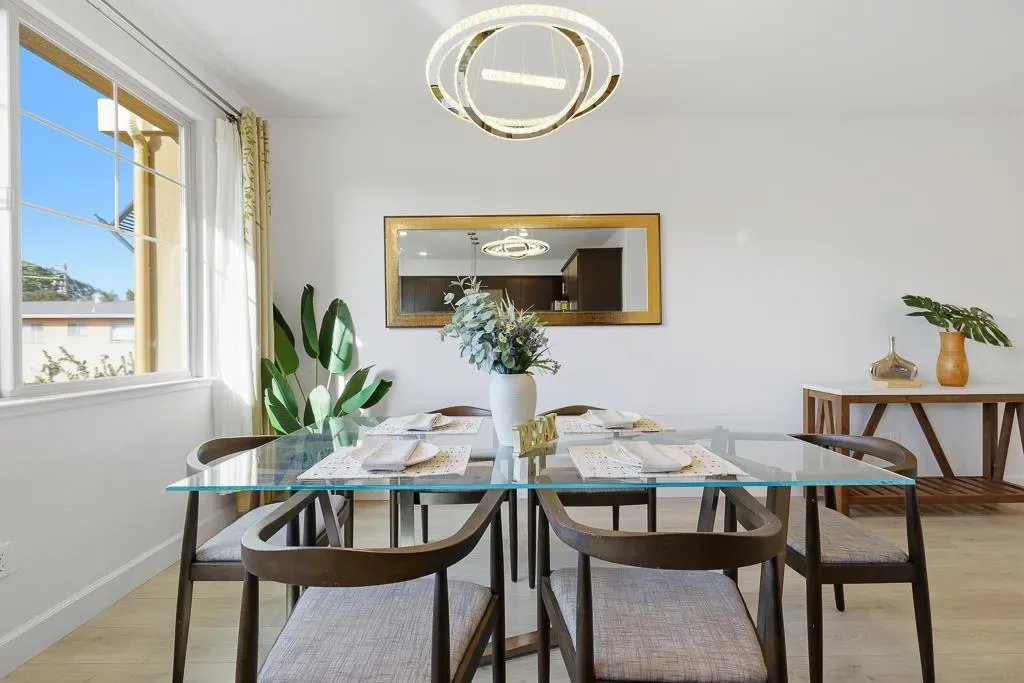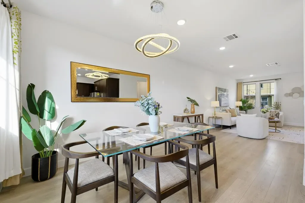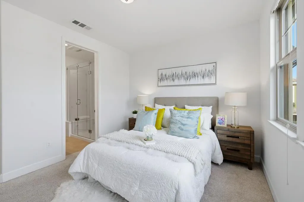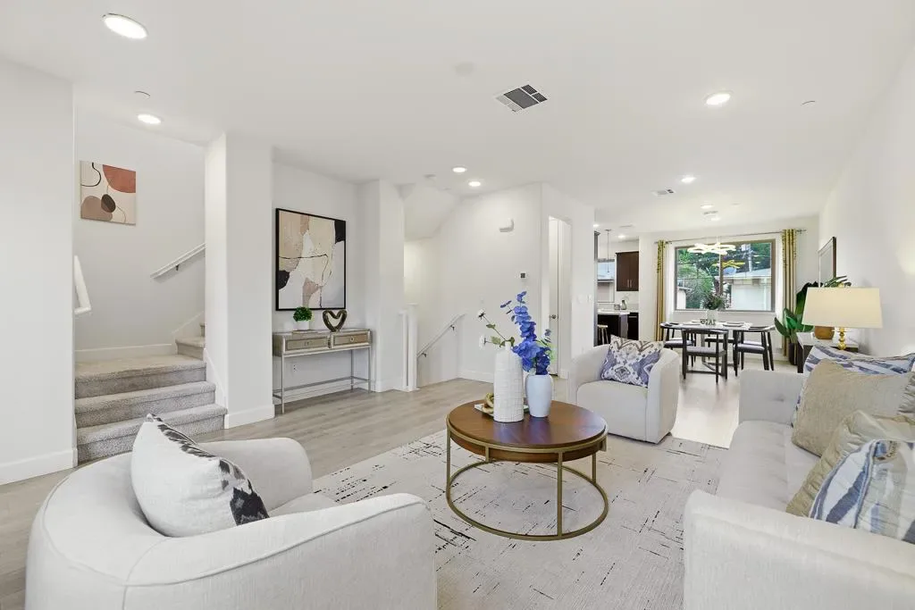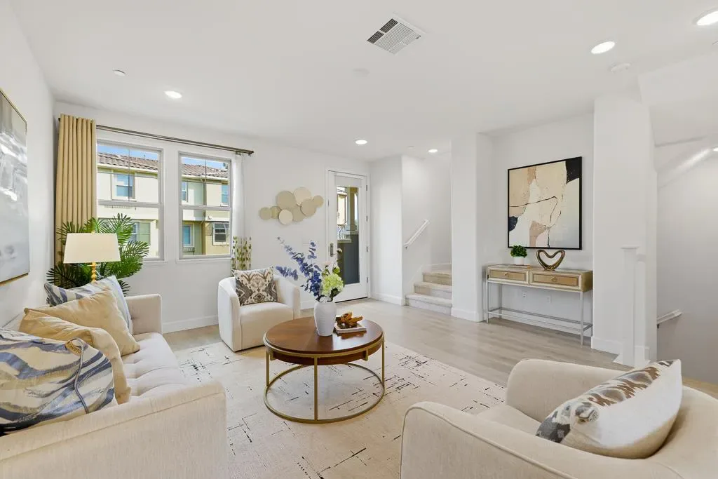 Bright and spacious 4bd/3.5ba townhome with high 9-ft ceilings and large windows filling the home with natural light all day. A unique feature its location next to the park, with generous distance from neighbor homes. The ground level features a private en-suite bedroom perfect for guests, in-laws, or a home office along with a side-by-side two-car garage. On the main level, enjoy an airy open-concept living area with higher ceilings, wood floors, and a gourmet kitchen equipped with a center island, quartz countertops, and stainless steel appliances. A powder room and sunlit balcony further enhance comfort and convenience. Large windows invite abundant natural light and offer a pleasant green belt view, creating a serene and inviting atmosphere. Upstairs offers a bright primary suite with walk-in closet, two additional bedrooms, and a laundry area. Owned by the original owners, the home is fresh like new with engineered wood floors, dual zone HVAC, and an attached 2-car garage. Minutes from Google, Microsoft, NASA, and other major Silicon Valley campuses. With quick access to Highways 101, 85, and 237, Caltrain, and Light Rail, plus convenient access to Stevens Creek Trail, this home offers the ideal blend of comfort, convenience, and Silicon Valley living. Must See!!!