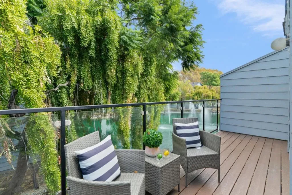 NEW PRICE! This fabulous 2-bedroom, 2-bathroom condominium is located in the heart of Mountain View. Situated on the upper level, this end unit is part of The Waters complex and offers stunning views of the water from the beautiful waterfront balcony, perfect for relaxation under the shade of large, mature trees. The open floor plan is bright and airy, featuring a living room with a vaulted ceiling and cozy fireplace. The master bedroom has an ensuite bathroom, while the large guest room includes a spacious walk-in closet with a mirrored door. The unit also boasts in-unit laundry with a new washer and dryer, and dual pane windows. Recently, the interior has been repainted, and a new carpet.. Additional amenities include a detached one-car garage and an extra parking permit. The complex itself offers a swimming pool, hot tub, tennis courts, and a community garden. Conveniently located near Cal Train, restaurants, shops, and parks, with easy access to highways 101 and 85, this condominium is just a short stroll to Google, Shoreline Amphitheatre, and downtown Mountain View’s array of amenities. This is A+. Don’t Miss.